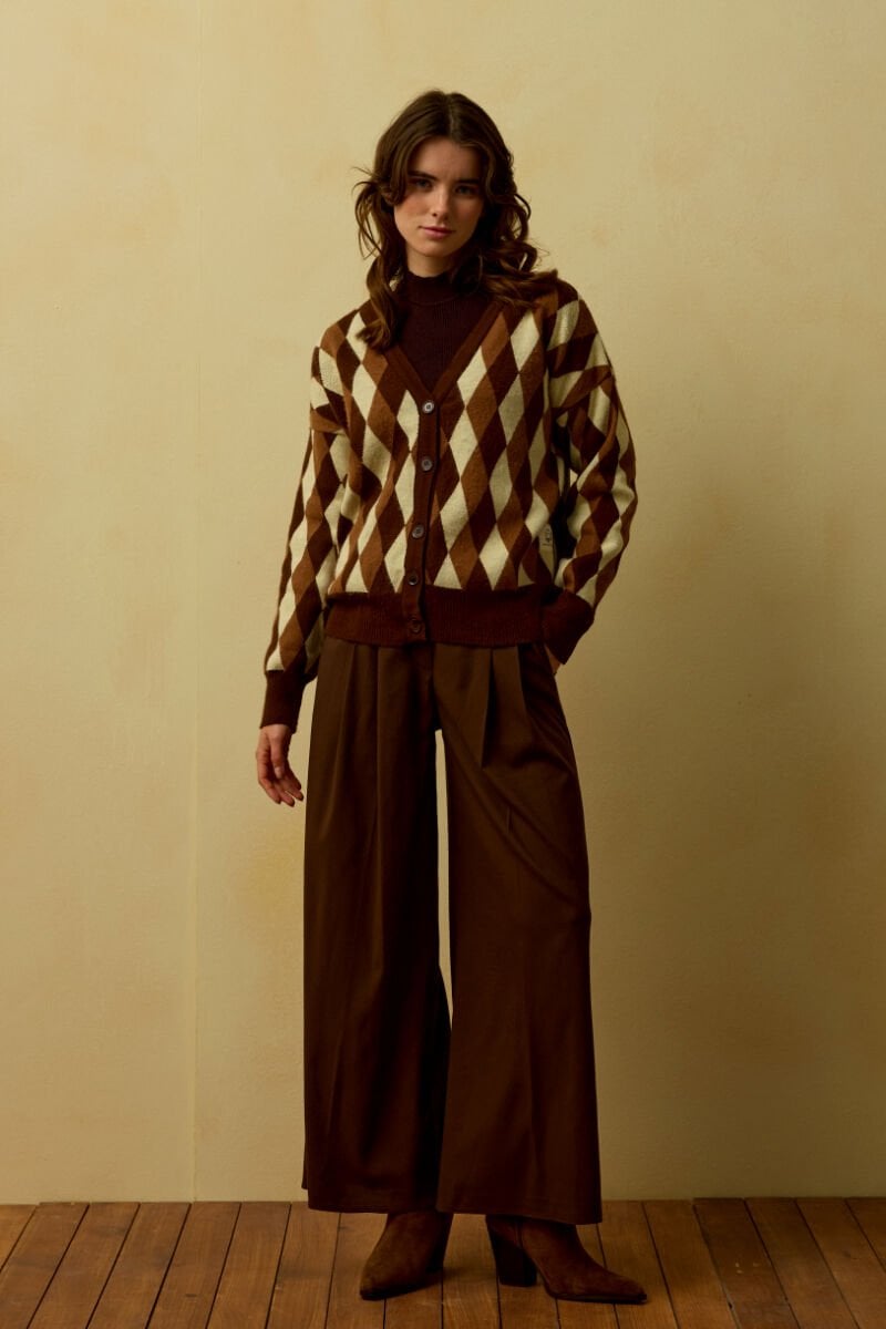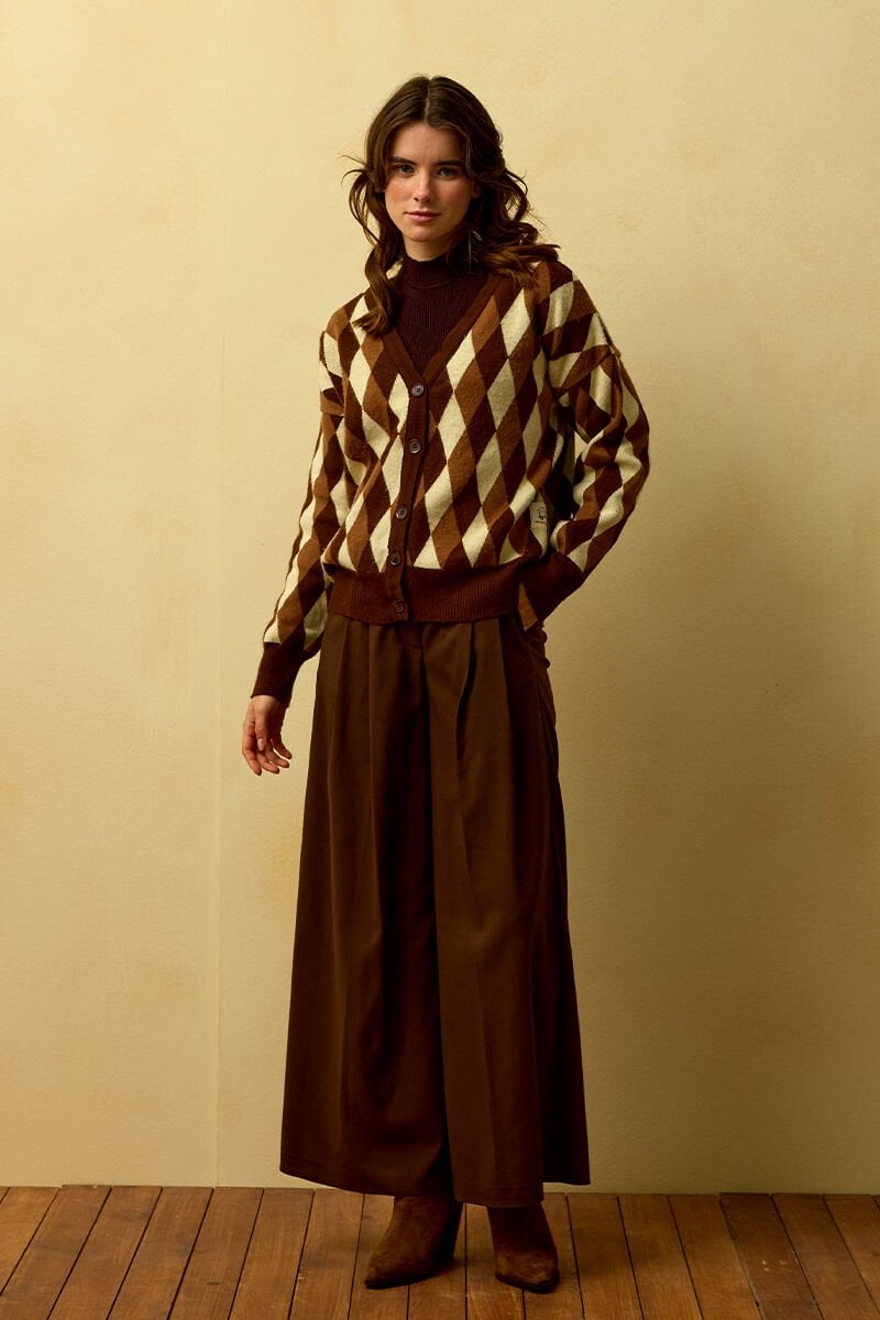 Acı Kahve Baklava Desenli Triko Hırka & Acı Kahve Pile Detay Palazzo Pantolon