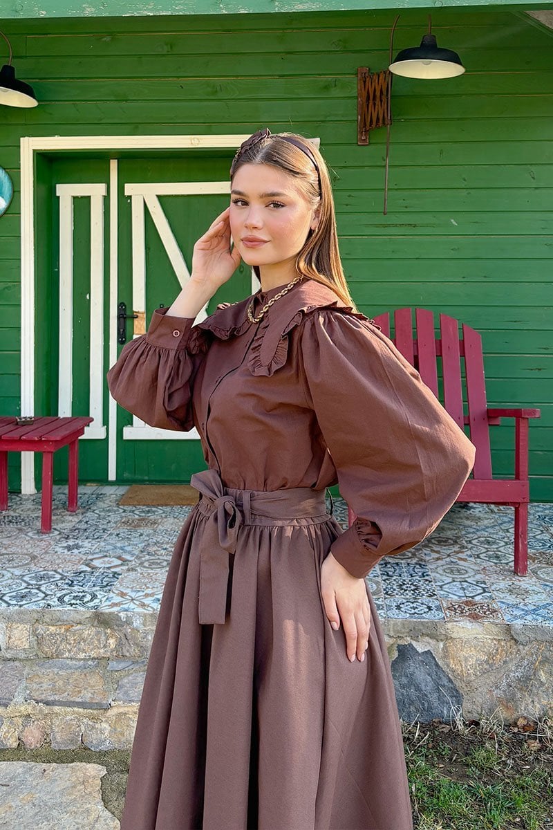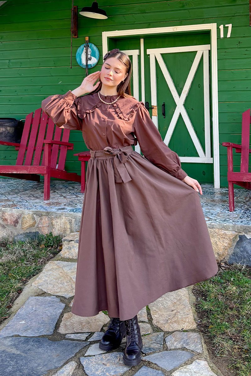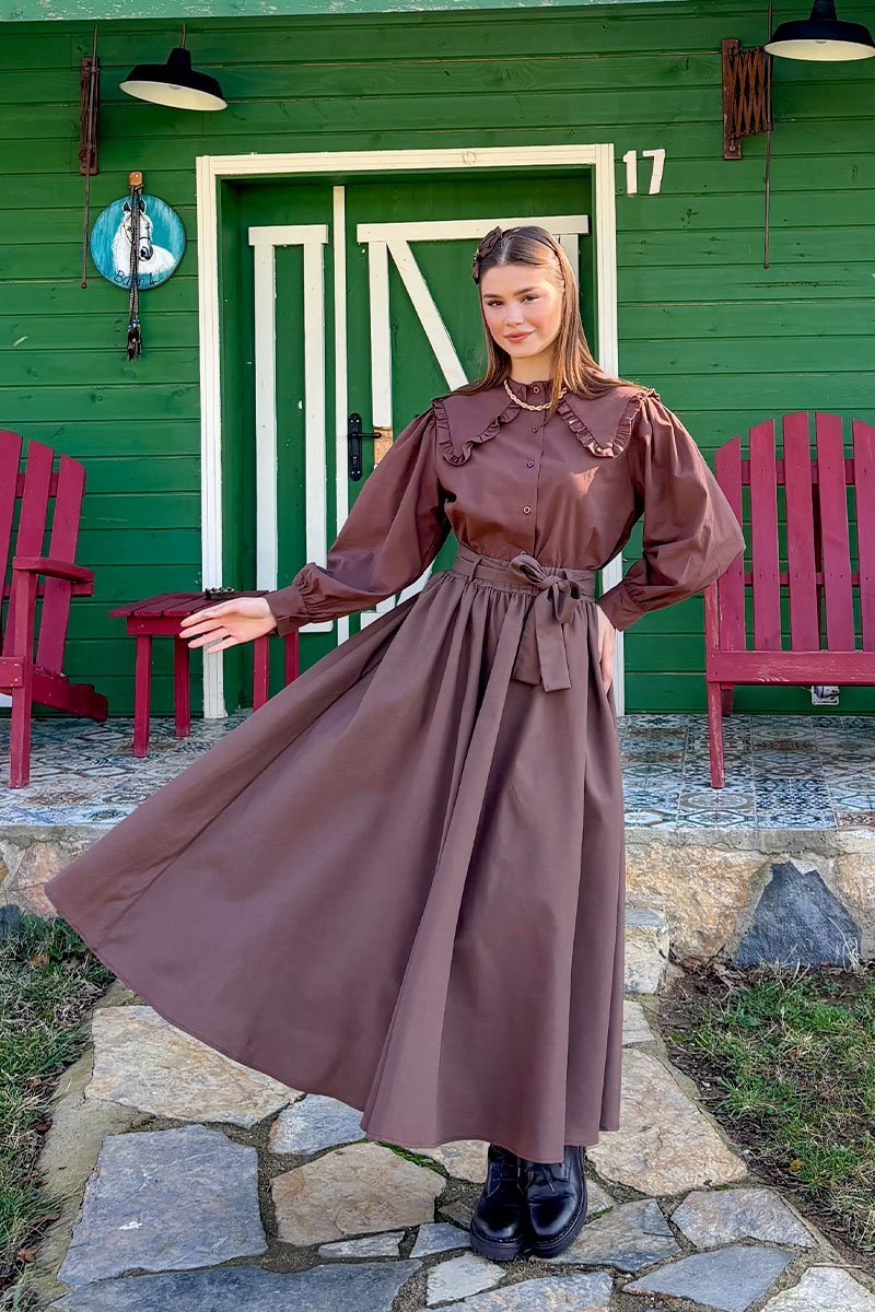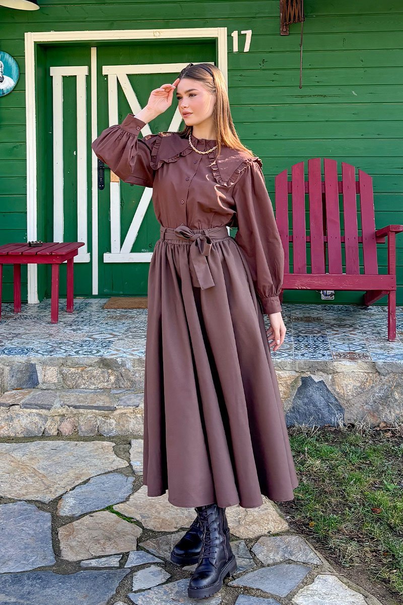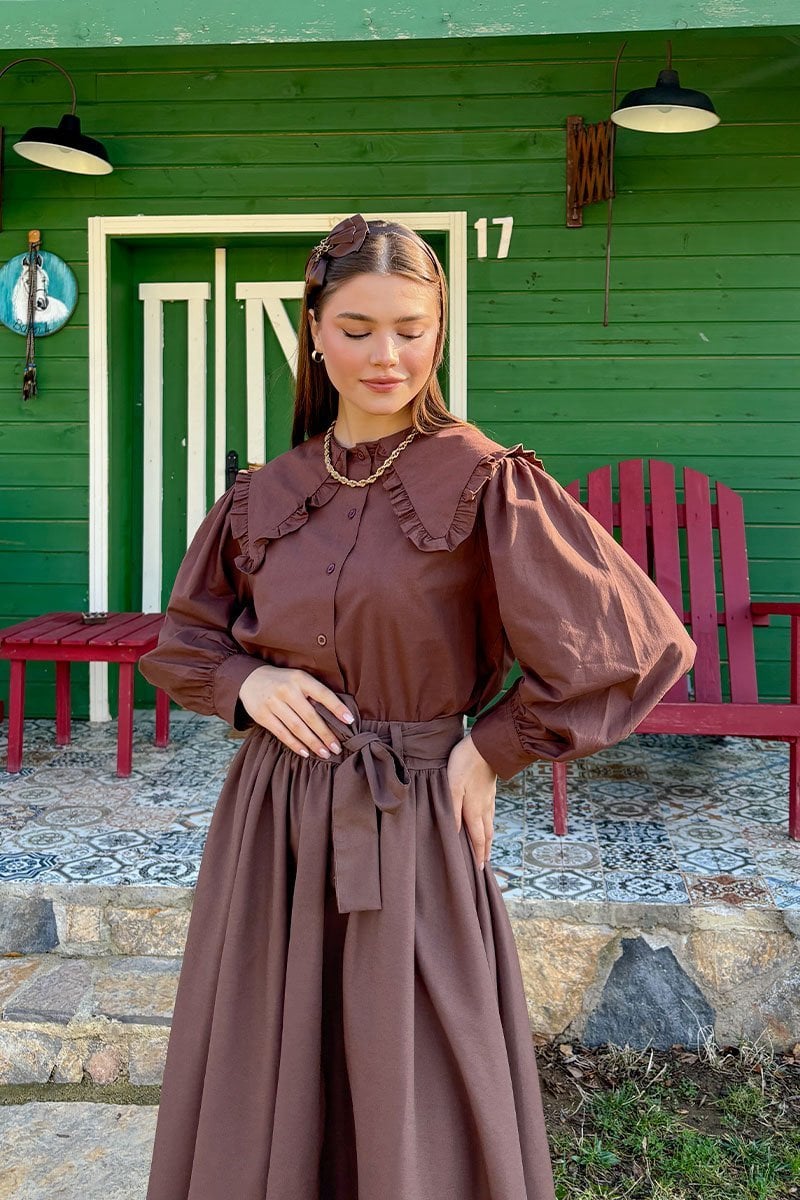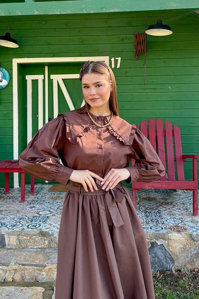 Acı Kahve Balon Etek & Acı Kahve Yakası Fırfırlı Crop Gömlek Takım