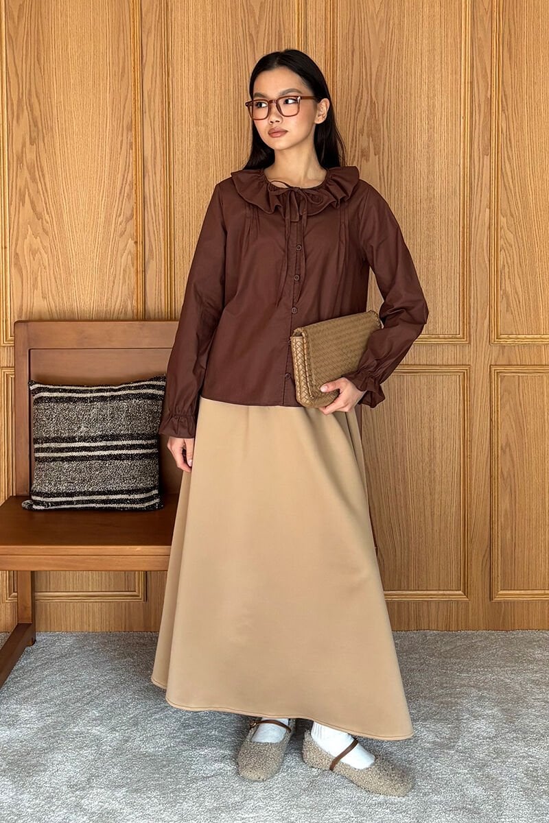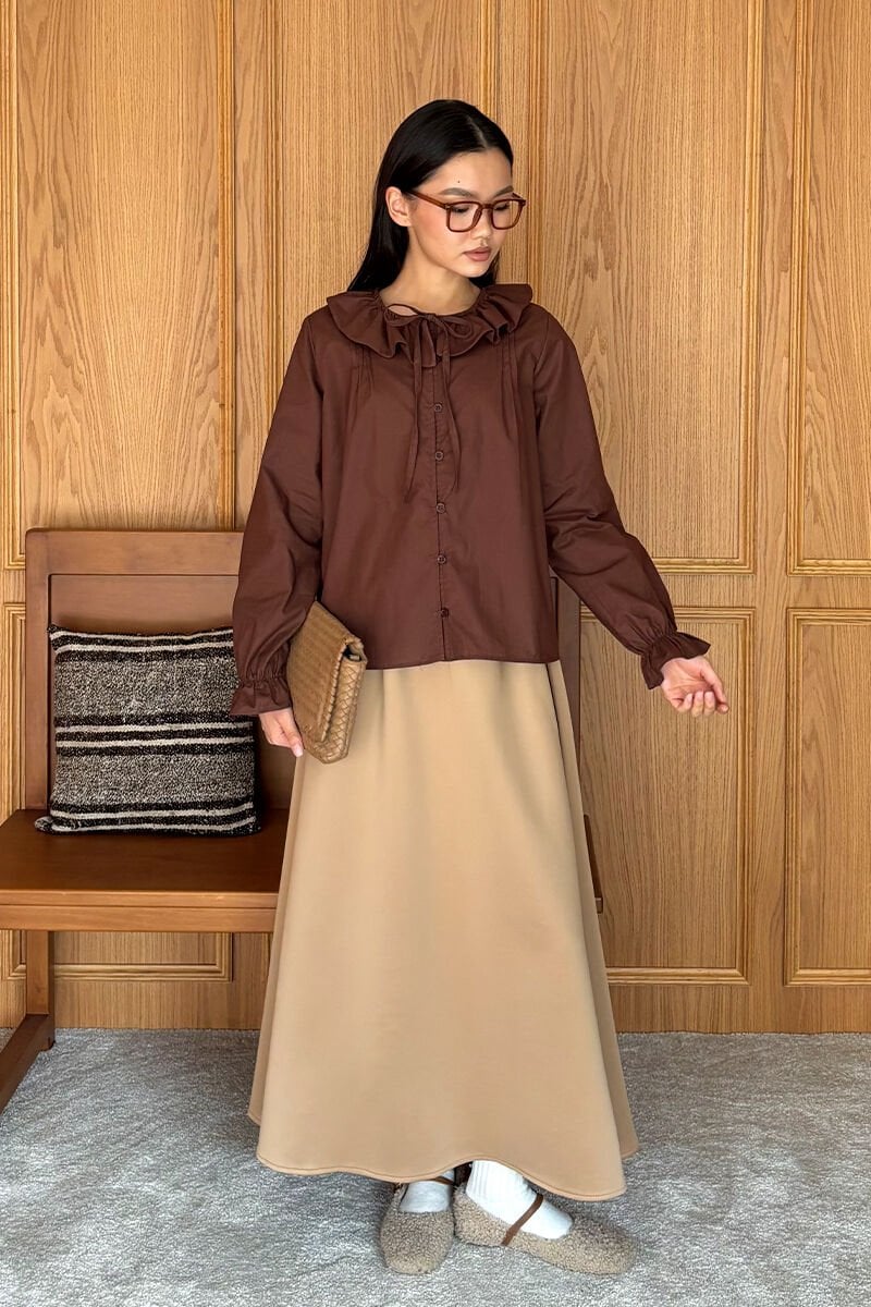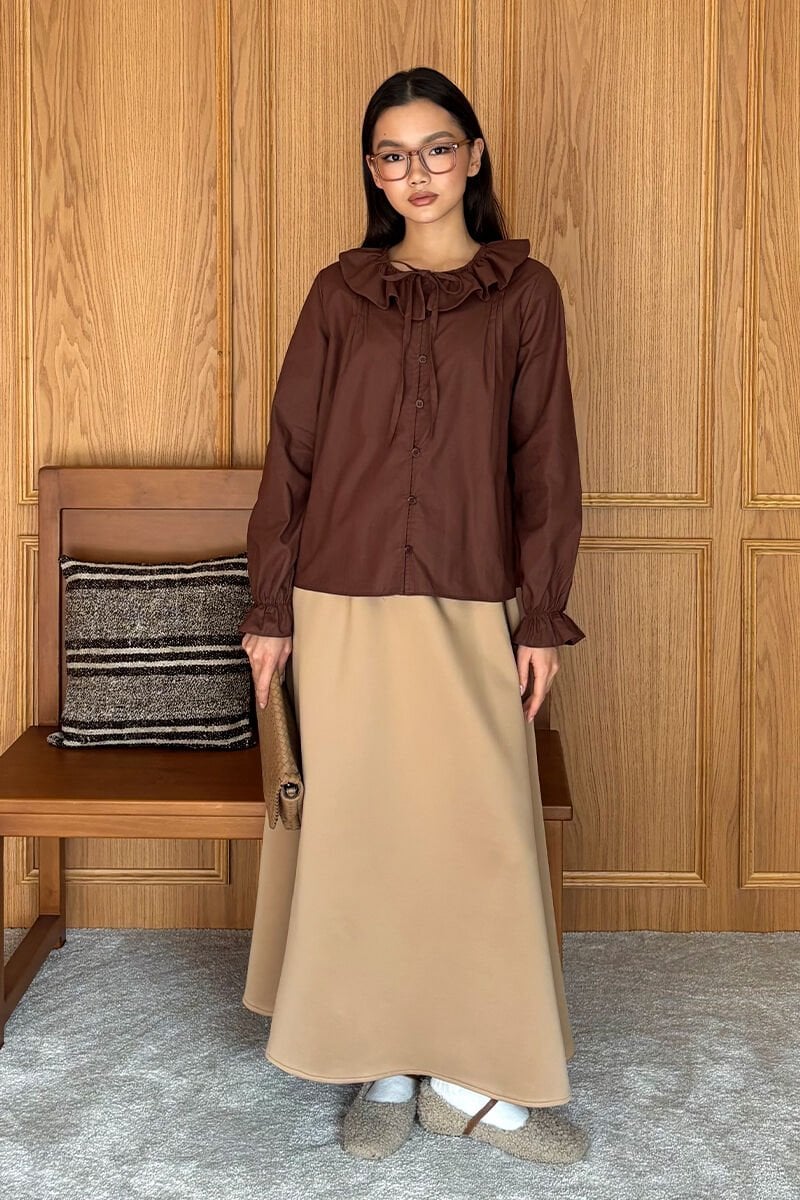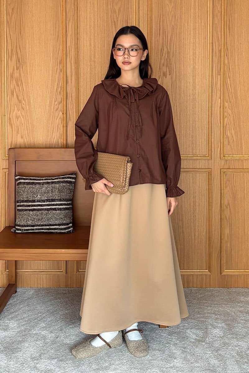 Acı Kahve Bebe Yaka Fiyonklu Gömlek & Karamel Scuba Etek Takım