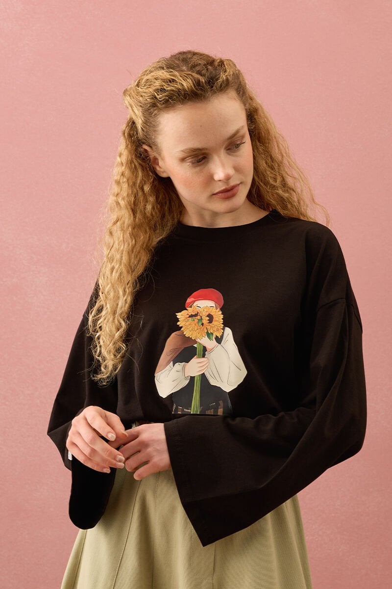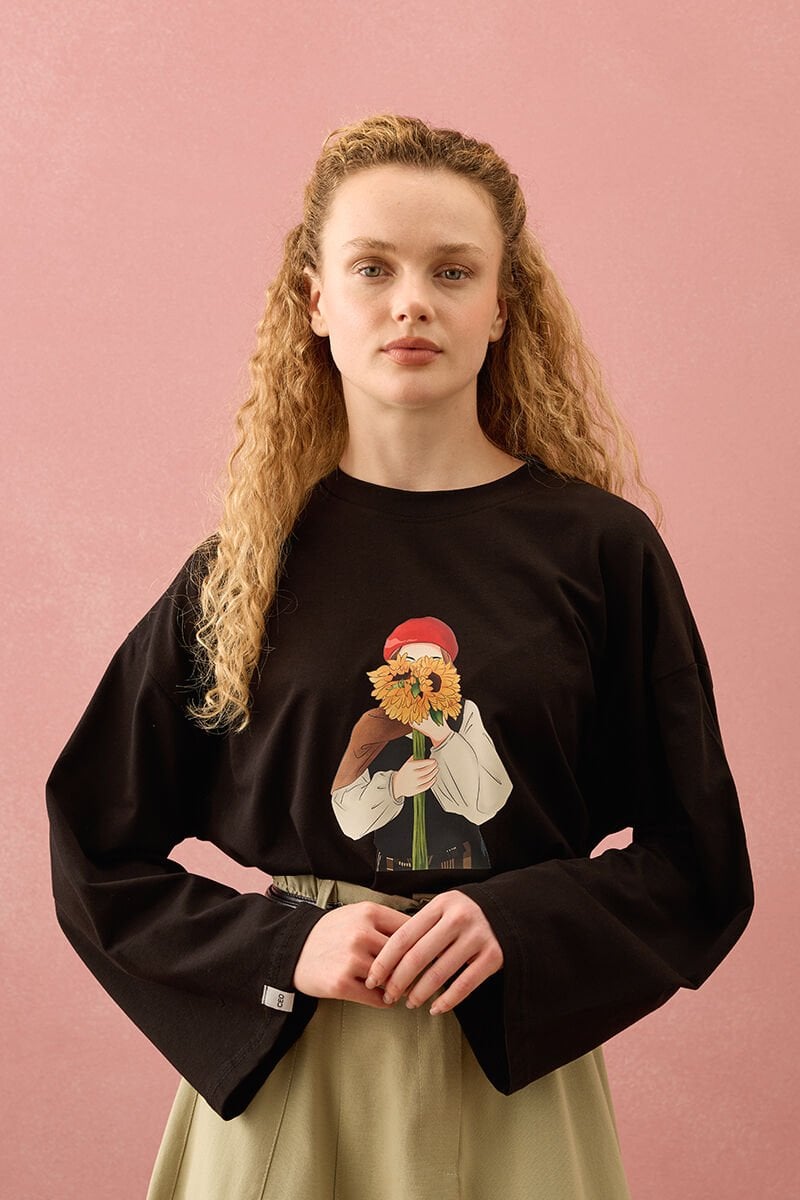 Acı Kahve Çiçekli Kız Baskılı Basic Body