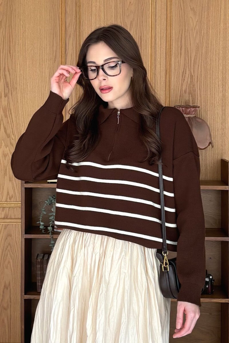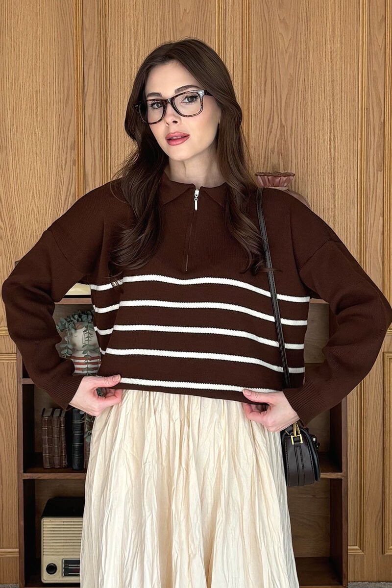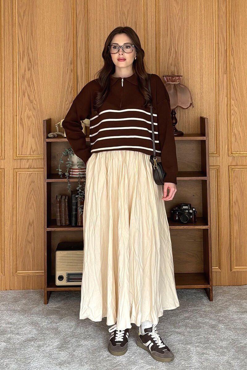 Acı Kahve Çizgili Triko Kazak & Tereyağ Sarısı Kraşlı Balon Etek Takım