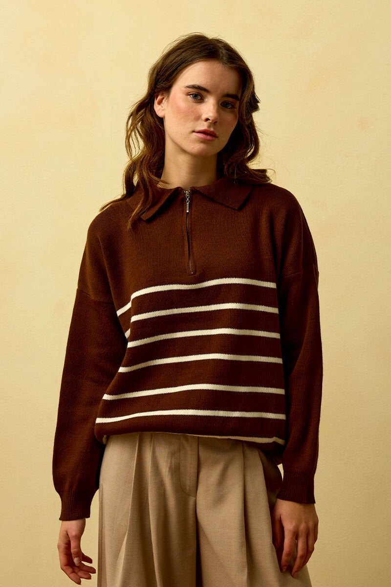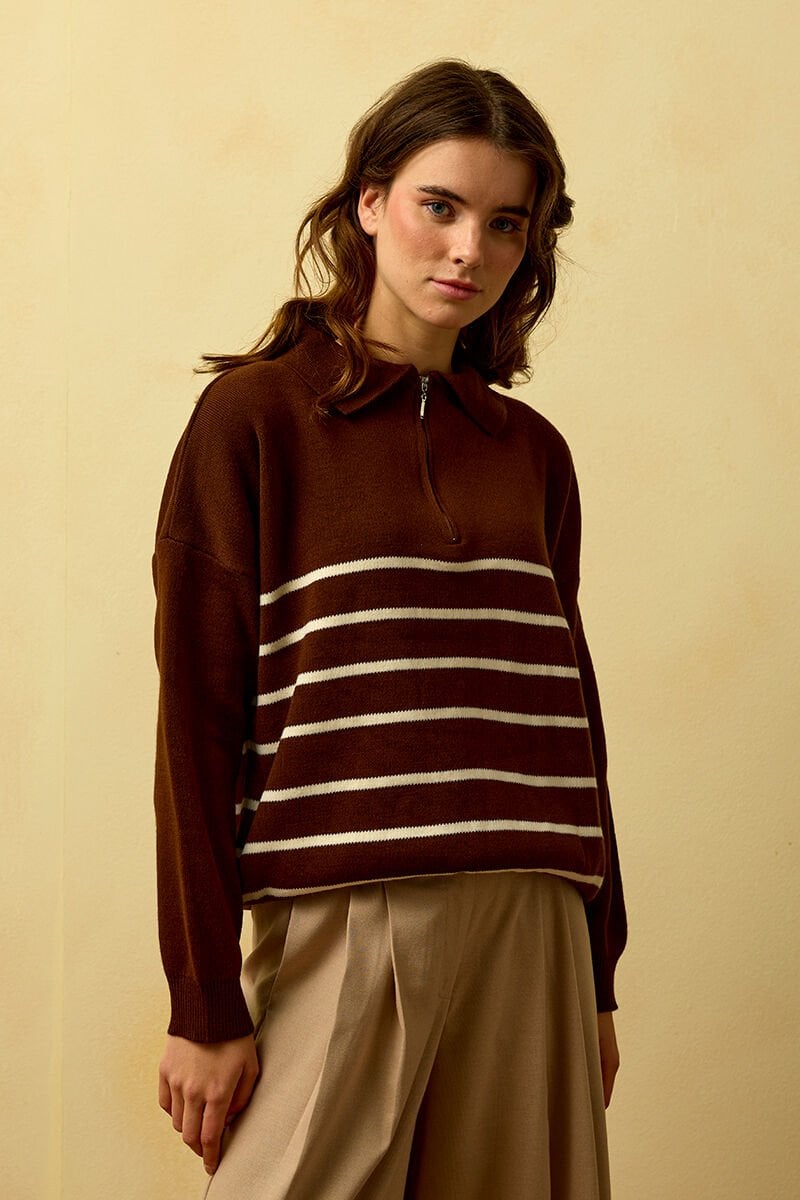 Acı Kahve Çizgili Triko Kazak