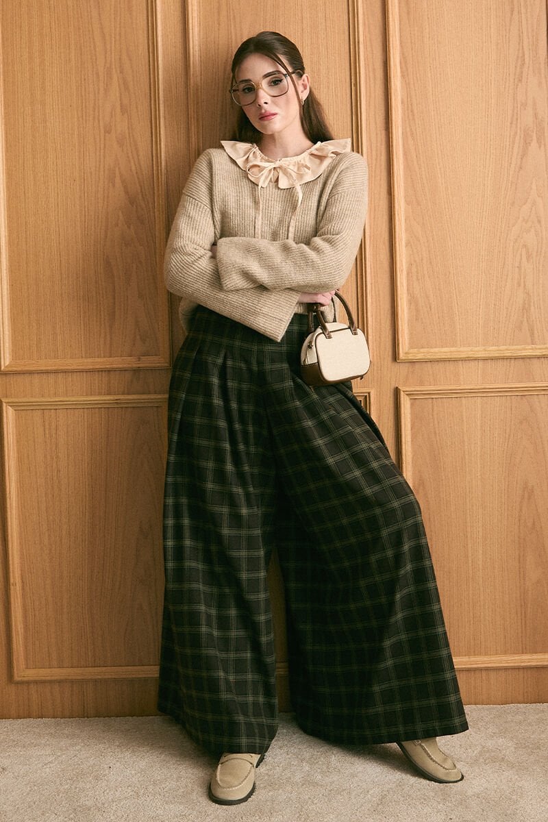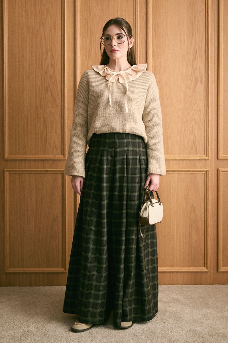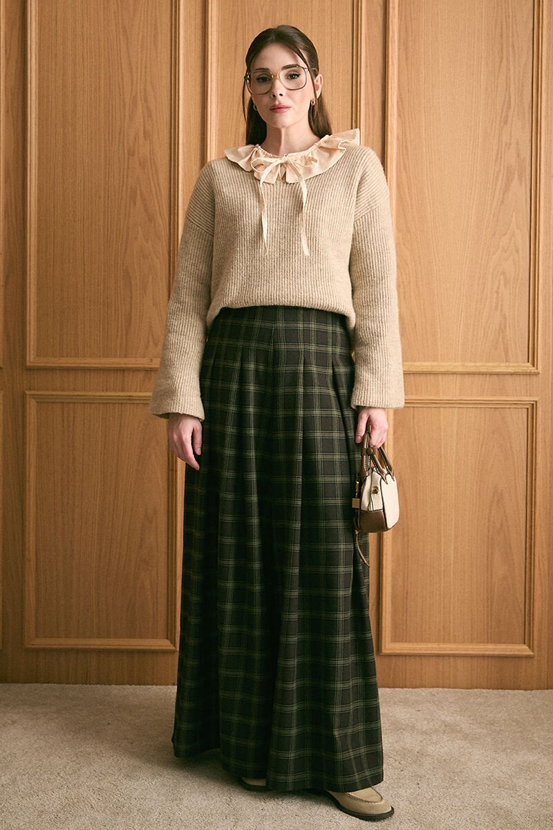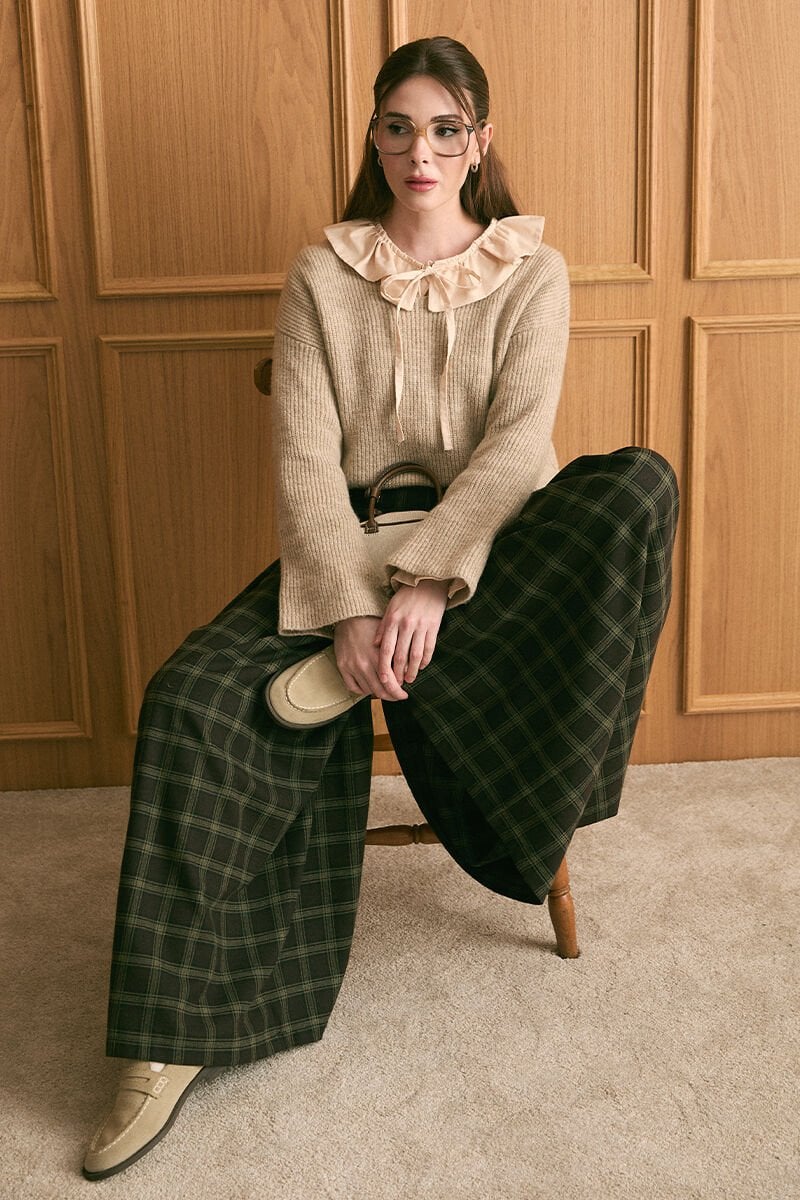 Acı Kahve Ekose Pile Detay Bol Paça Pantolon