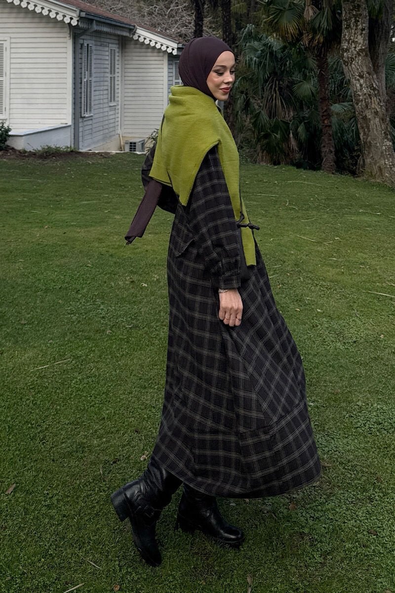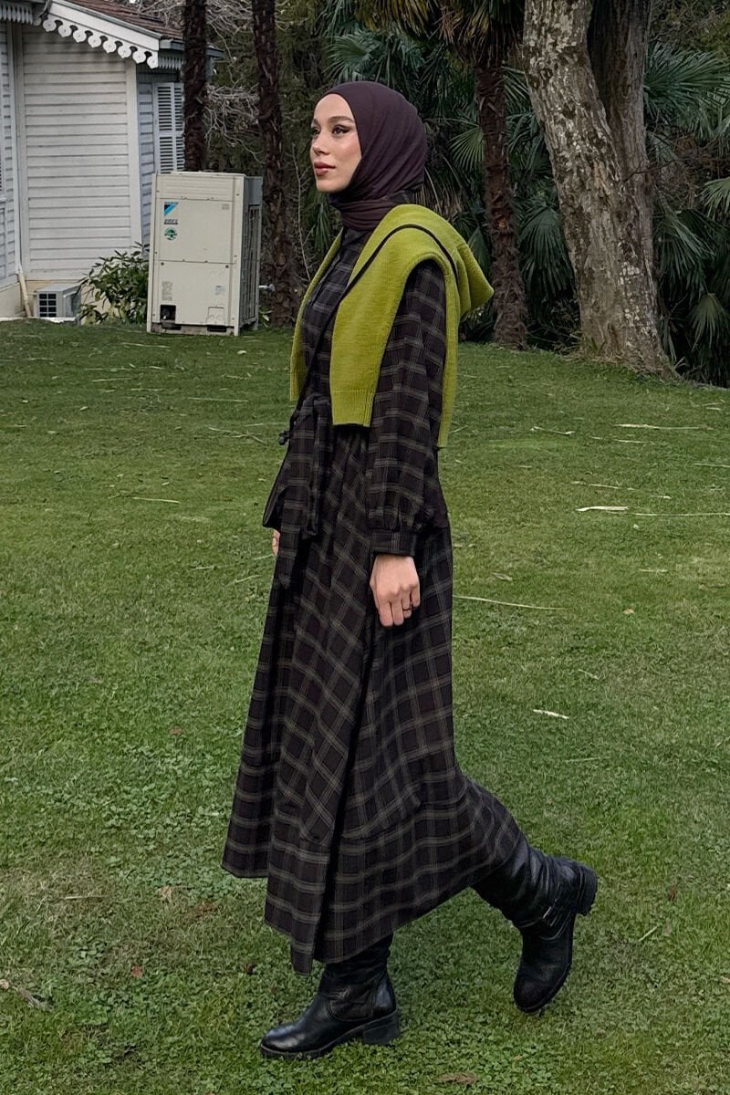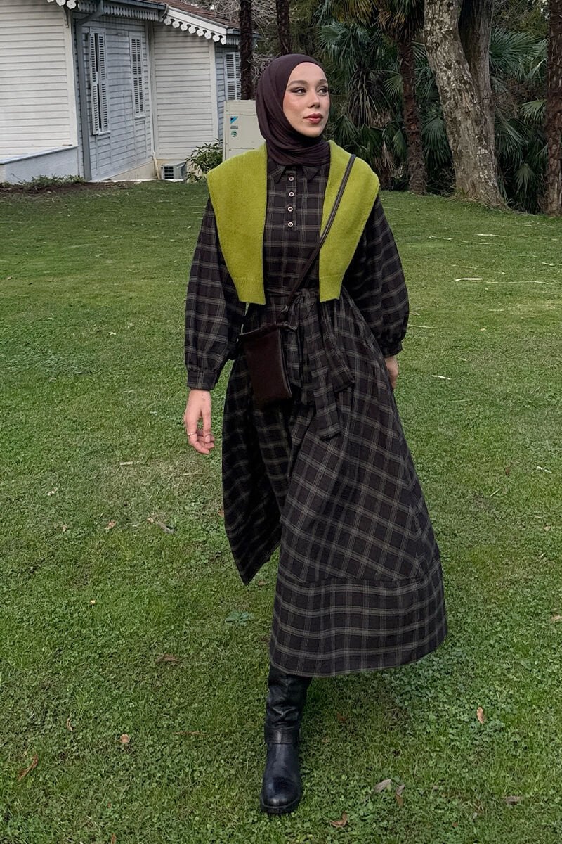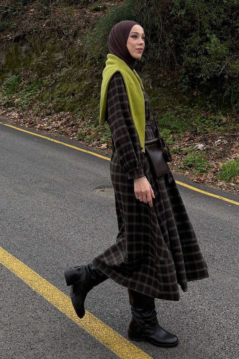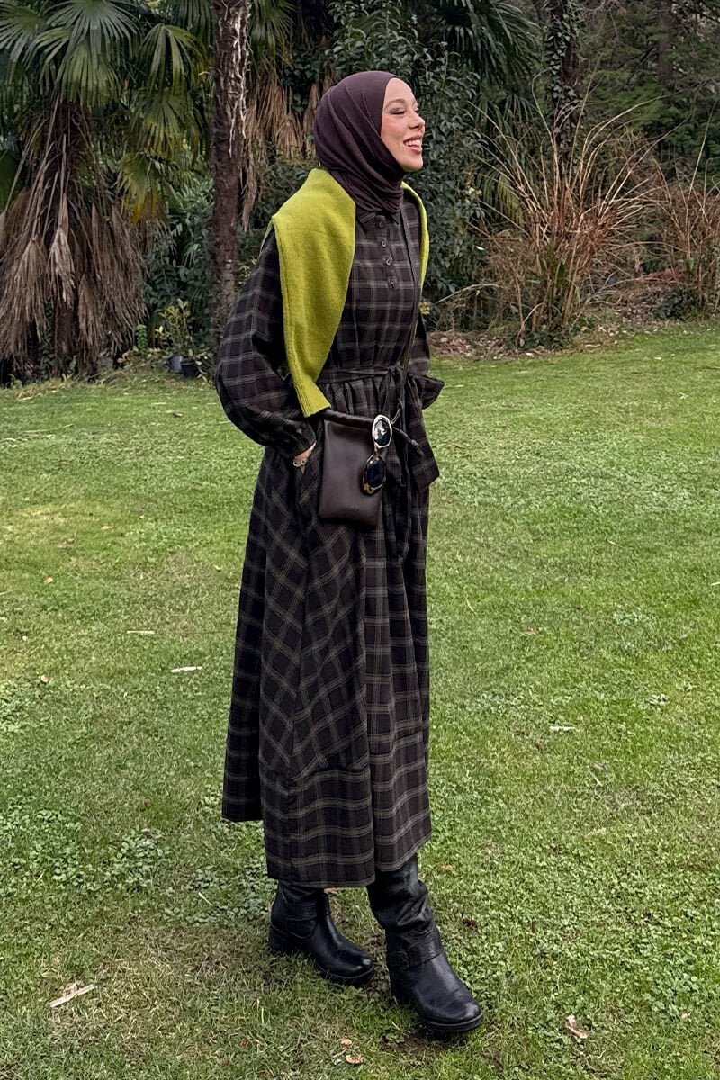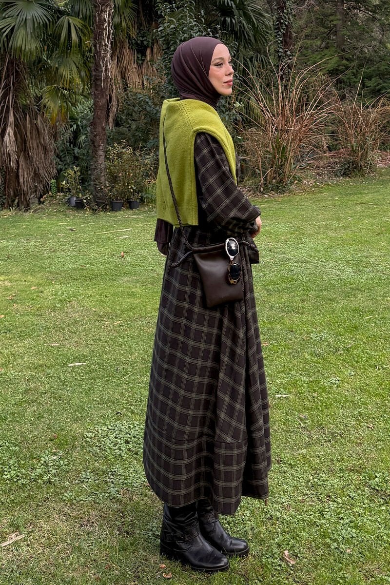 Acı Kahve Ekoseli Vintage Elbise / Dilek Ağır