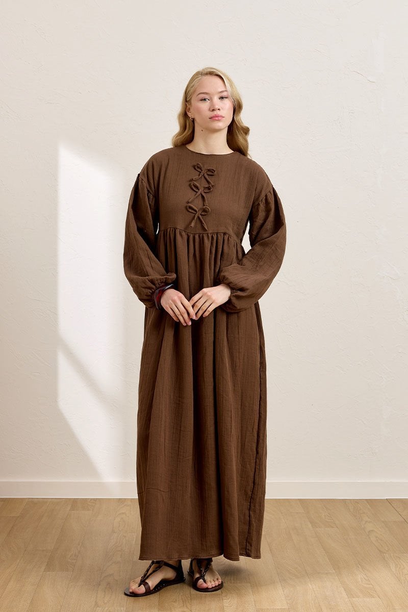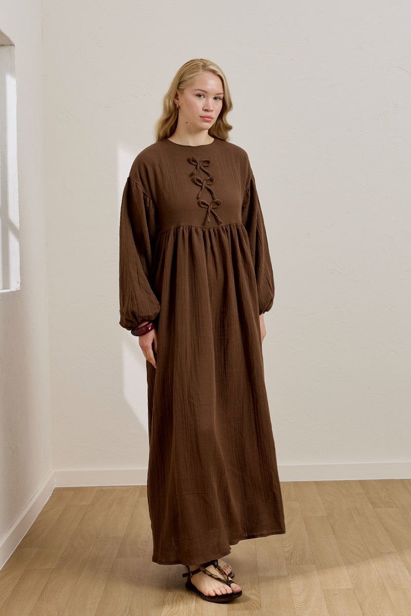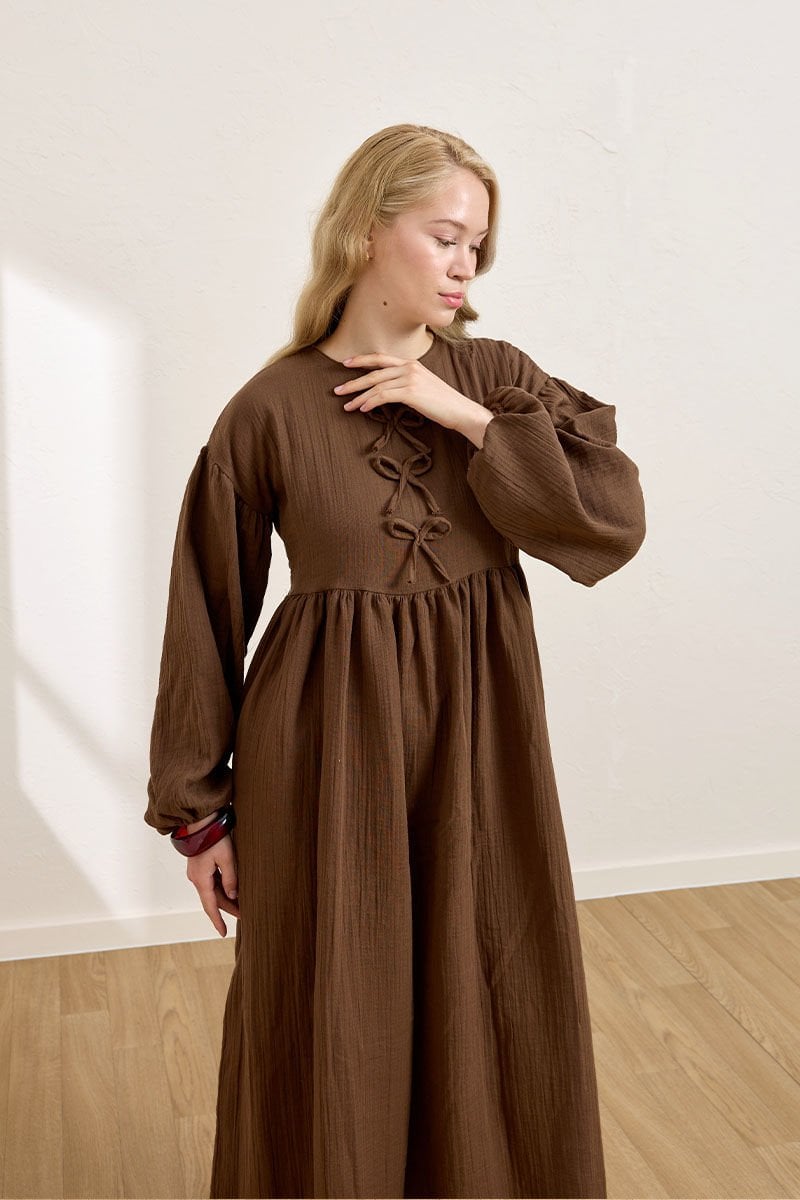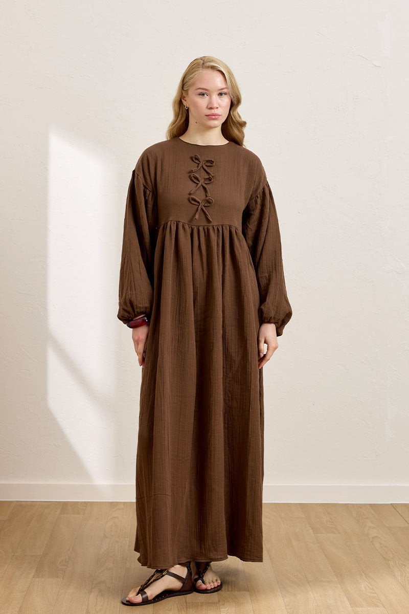 Acı Kahve Müslin Fiyonklu Belroba Elbise