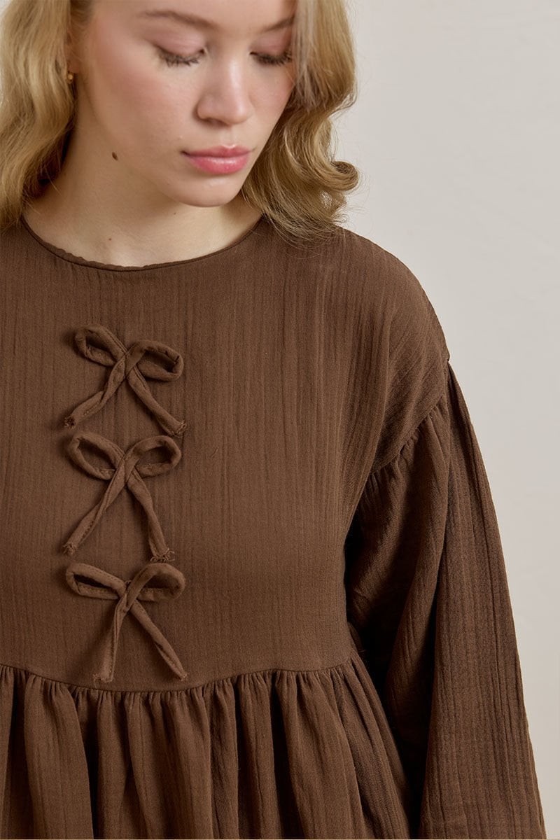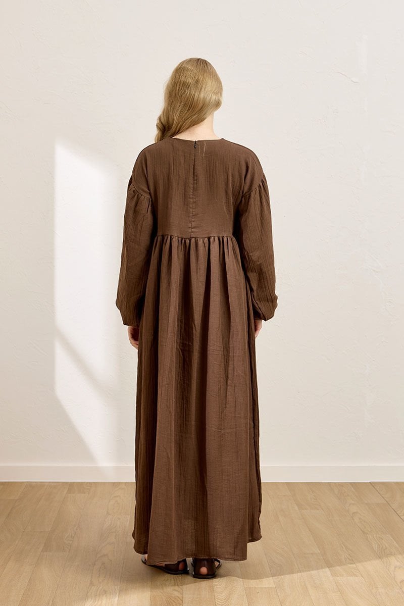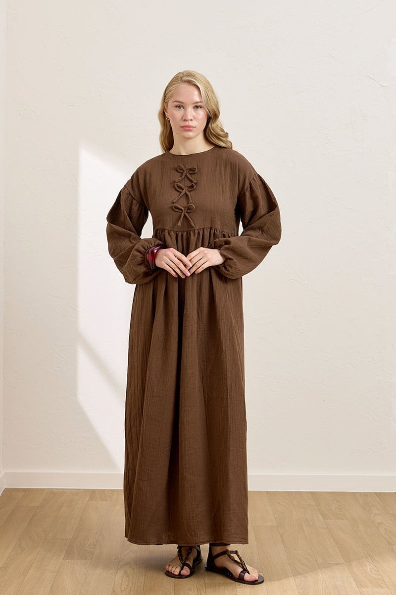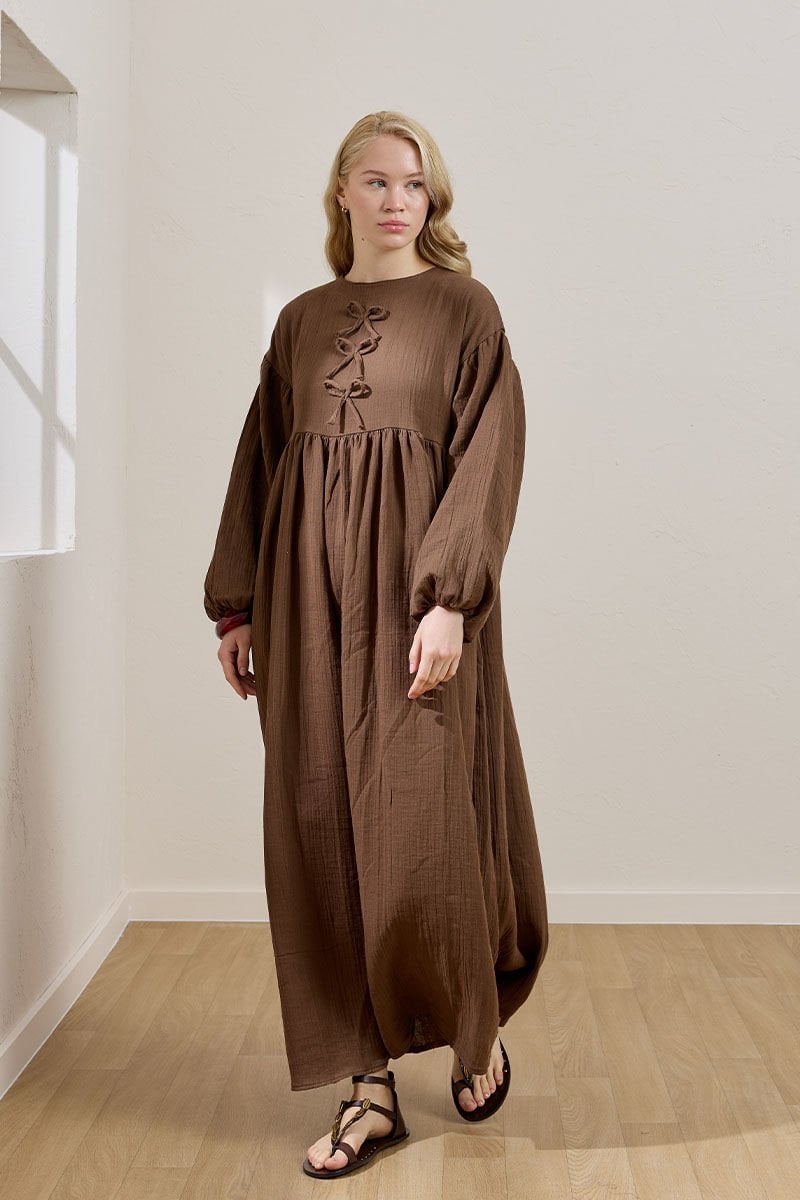 Acı Kahve Müslin Fiyonklu Belroba Elbise