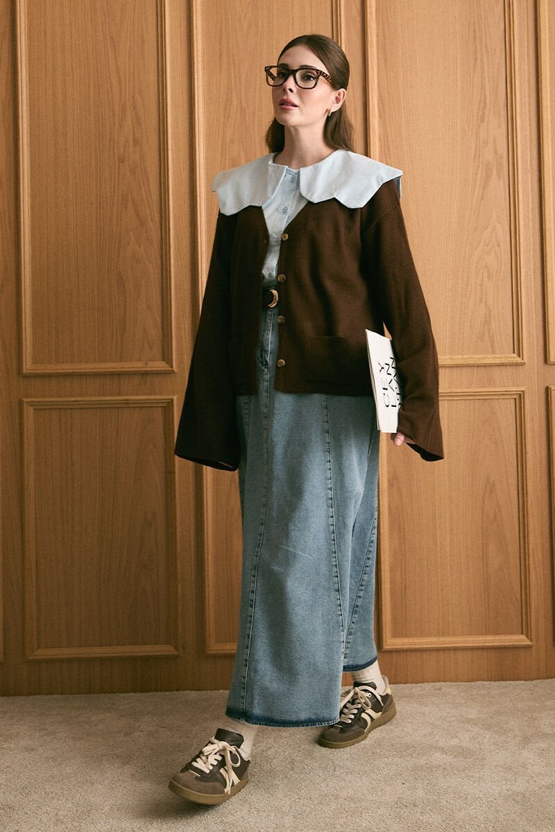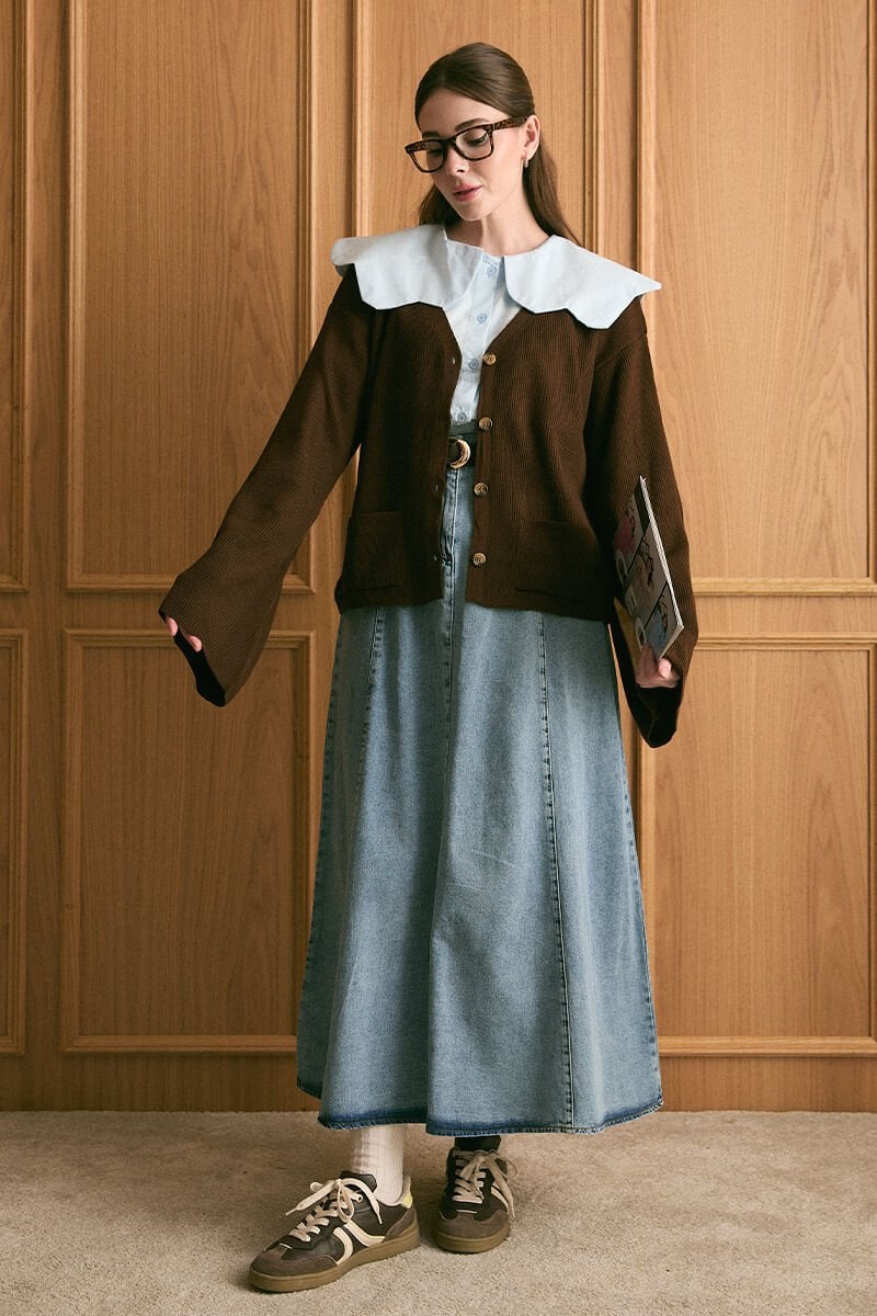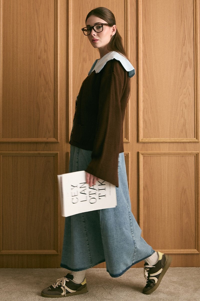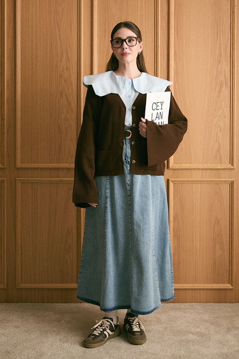 Acı Kahve İspanyol Kol Triko Hırka & Buz Mavisi Kot Kloş Etek Takım