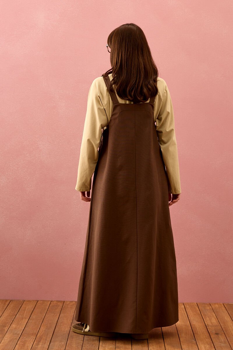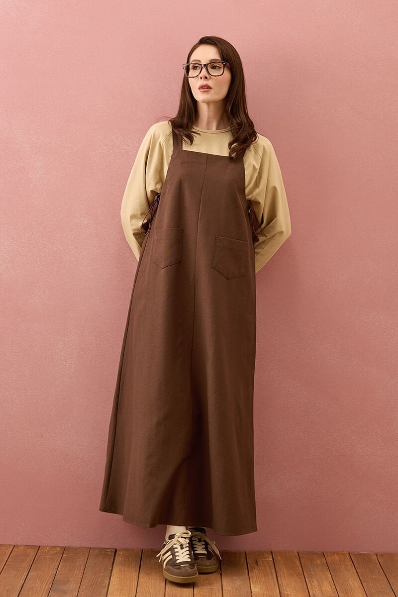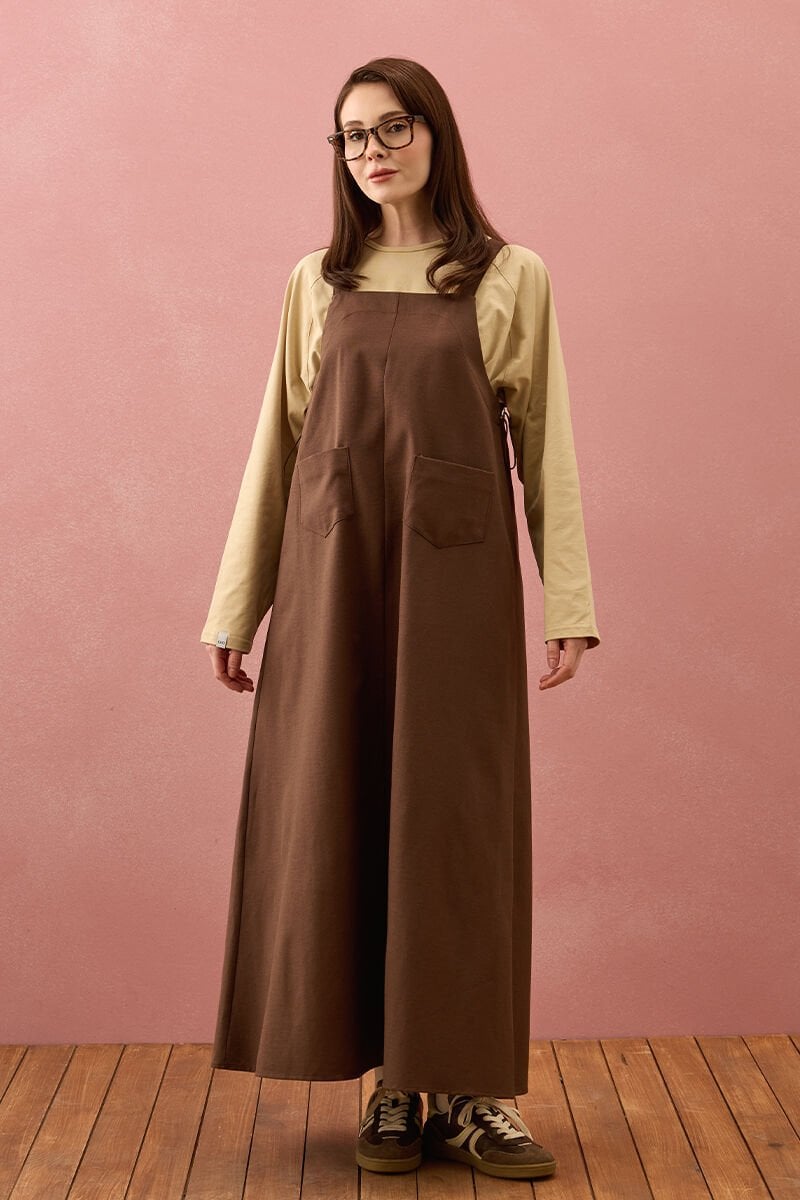 Acı Kahve Keten İki Cepli Etekli Salopet