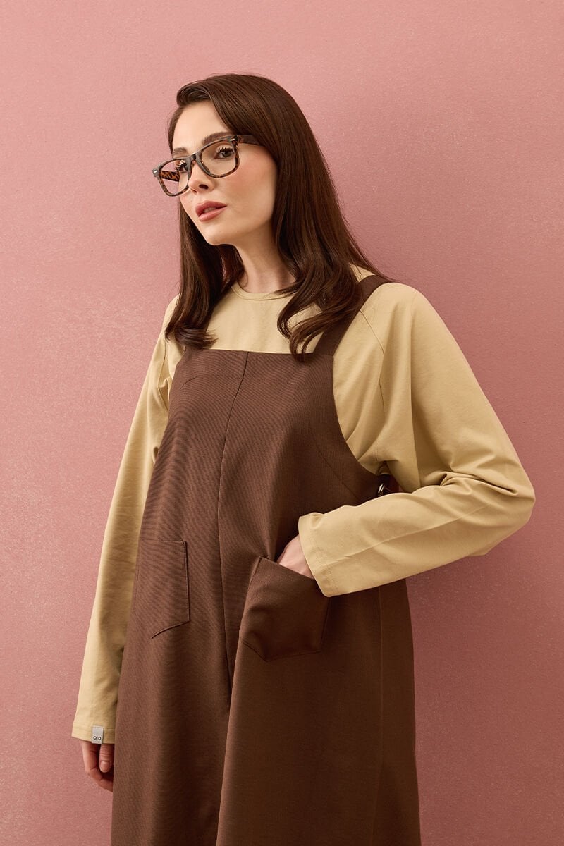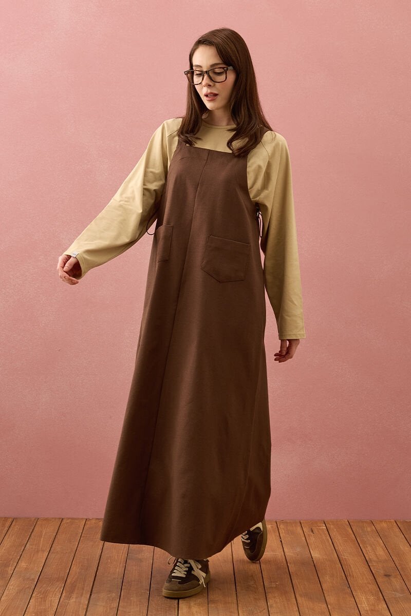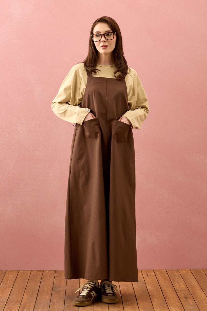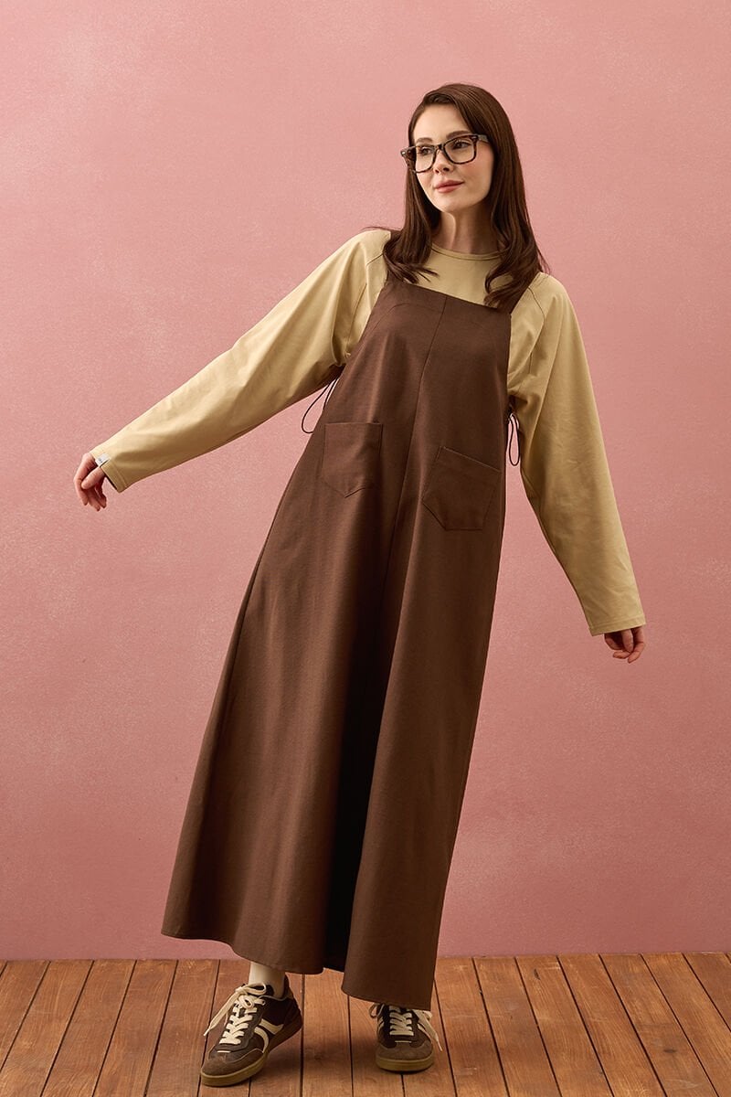 Acı Kahve Keten İki Cepli Etekli Salopet