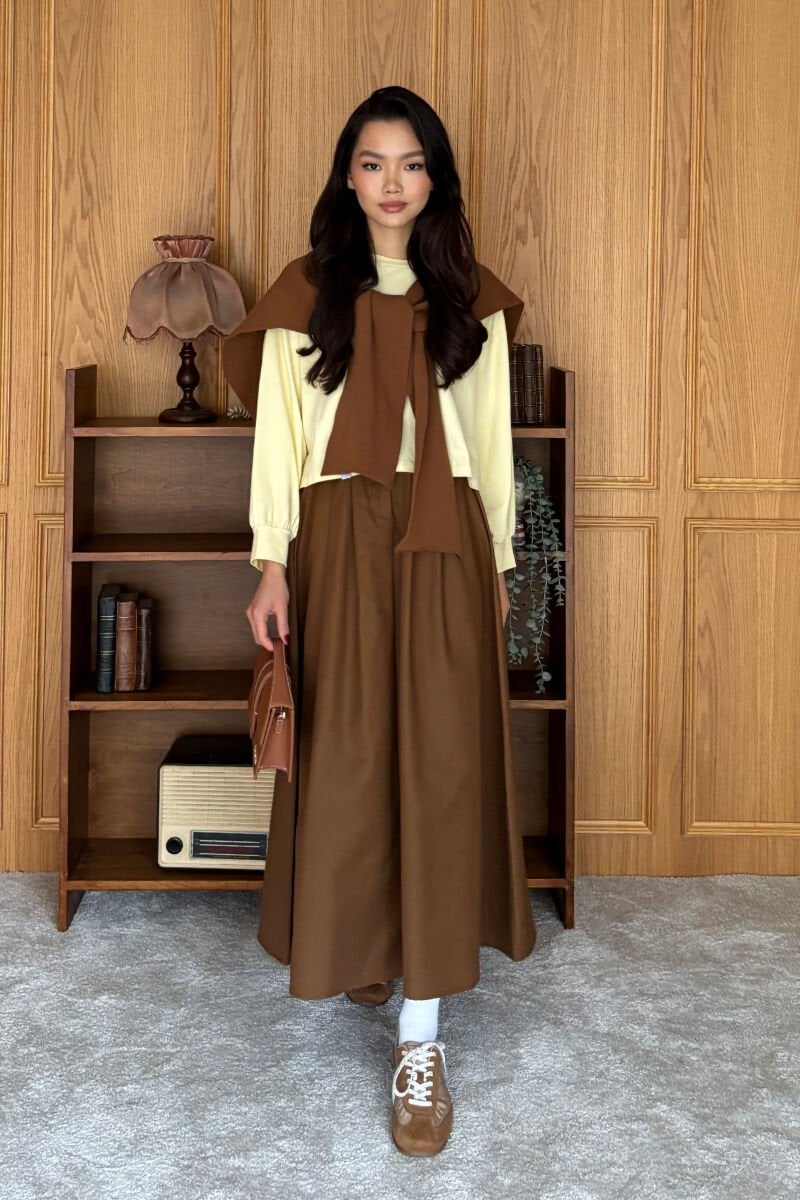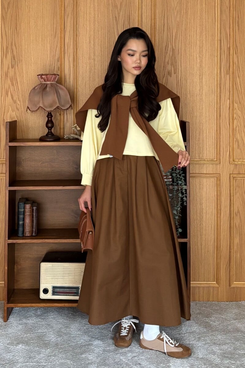 Acı Kahve Keten Tek Düğmeli Etek