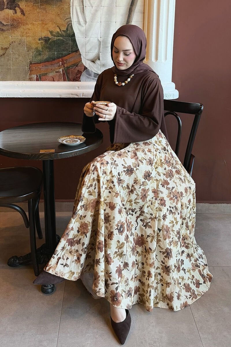 Acı Kahve Oysho Bağlamalı Bluz & Karamel Çiçek Desenli Parçalı Etek Takım
