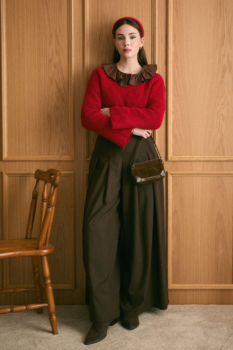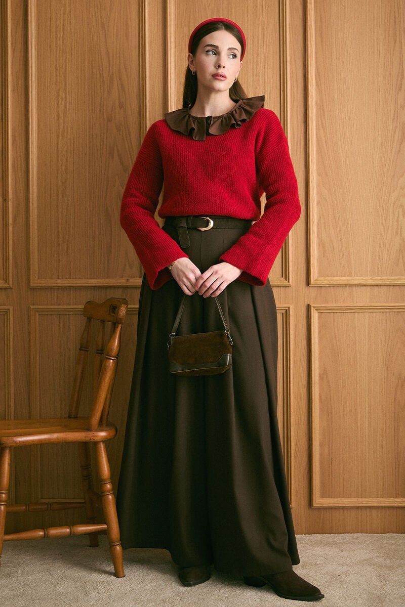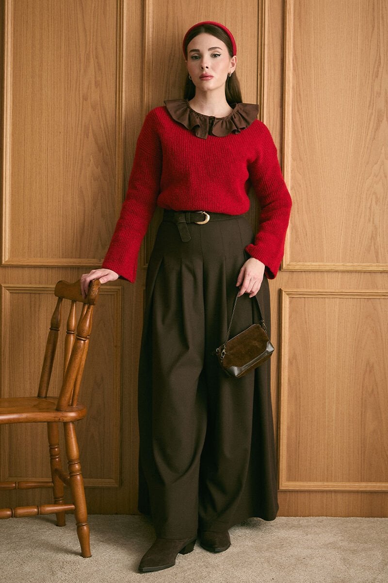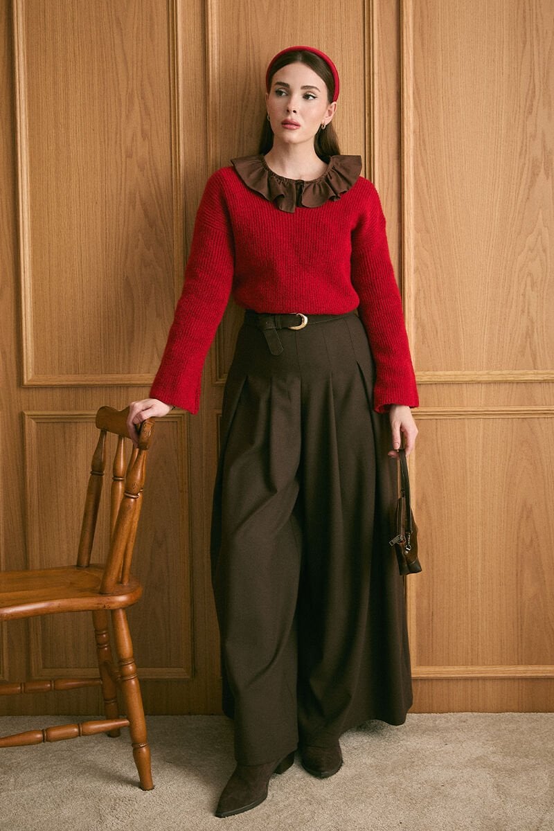 Acı Kahve Pile Detay Bol Paça Pantolon