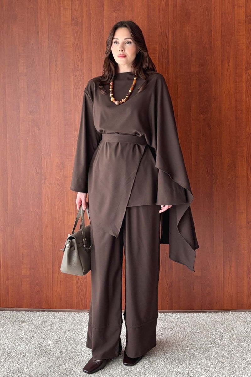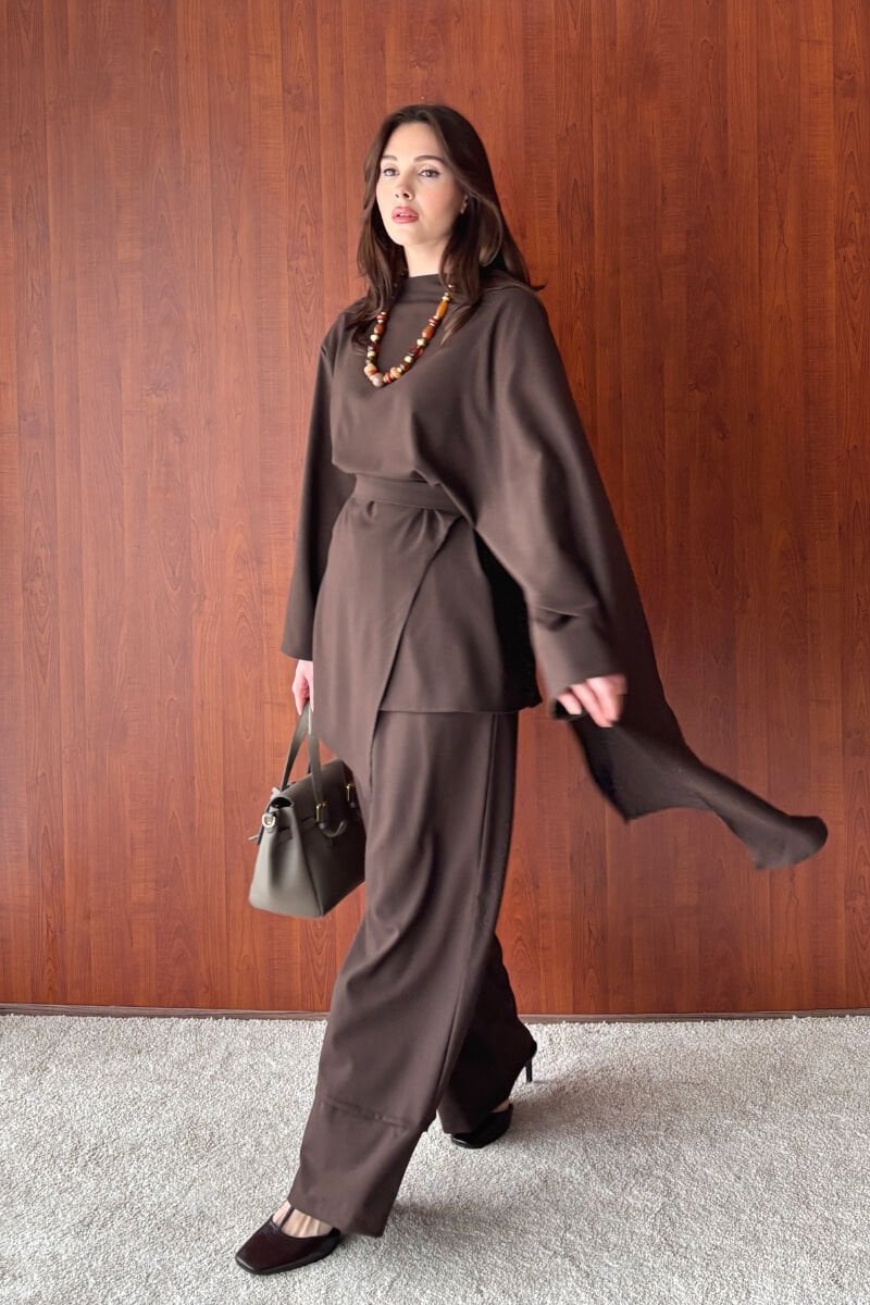 Acı Kahve Poliviskon Bağlamalı Tunik & Double Paça Pantolon Takım