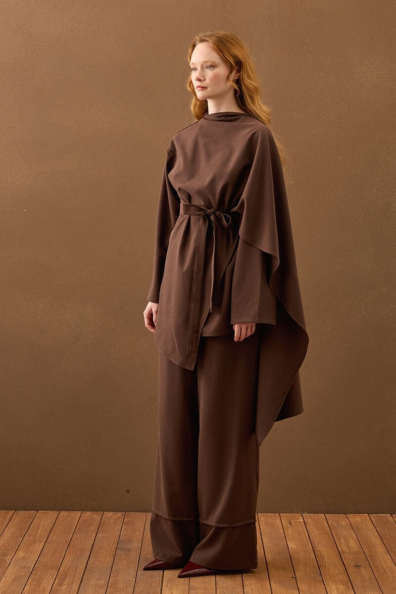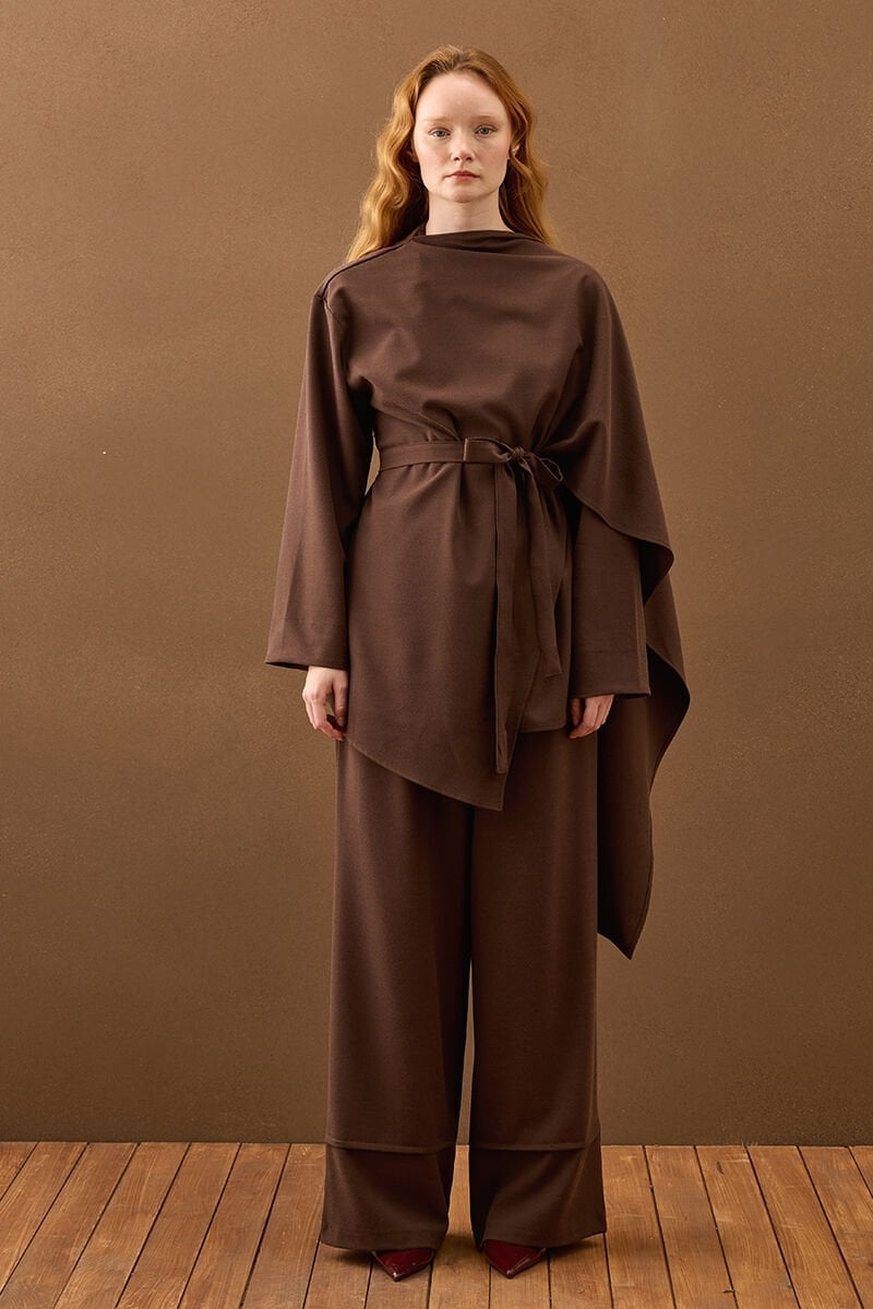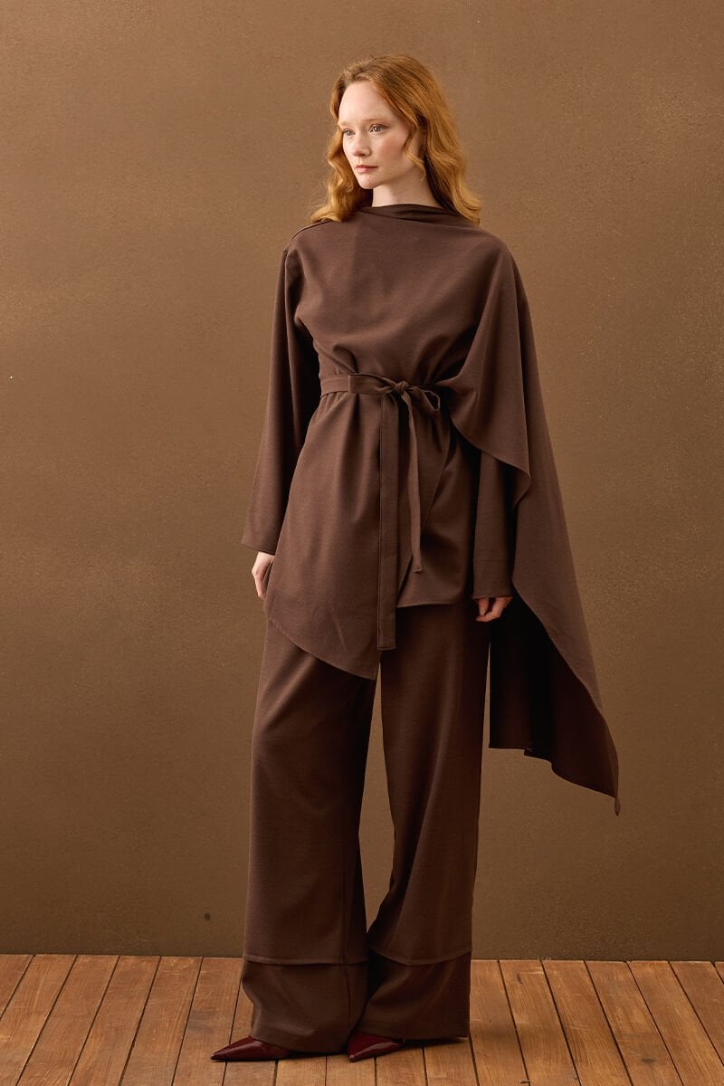 Acı Kahve Poliviskon Bağlamalı Tunik & Double Paça Pantolon Takım