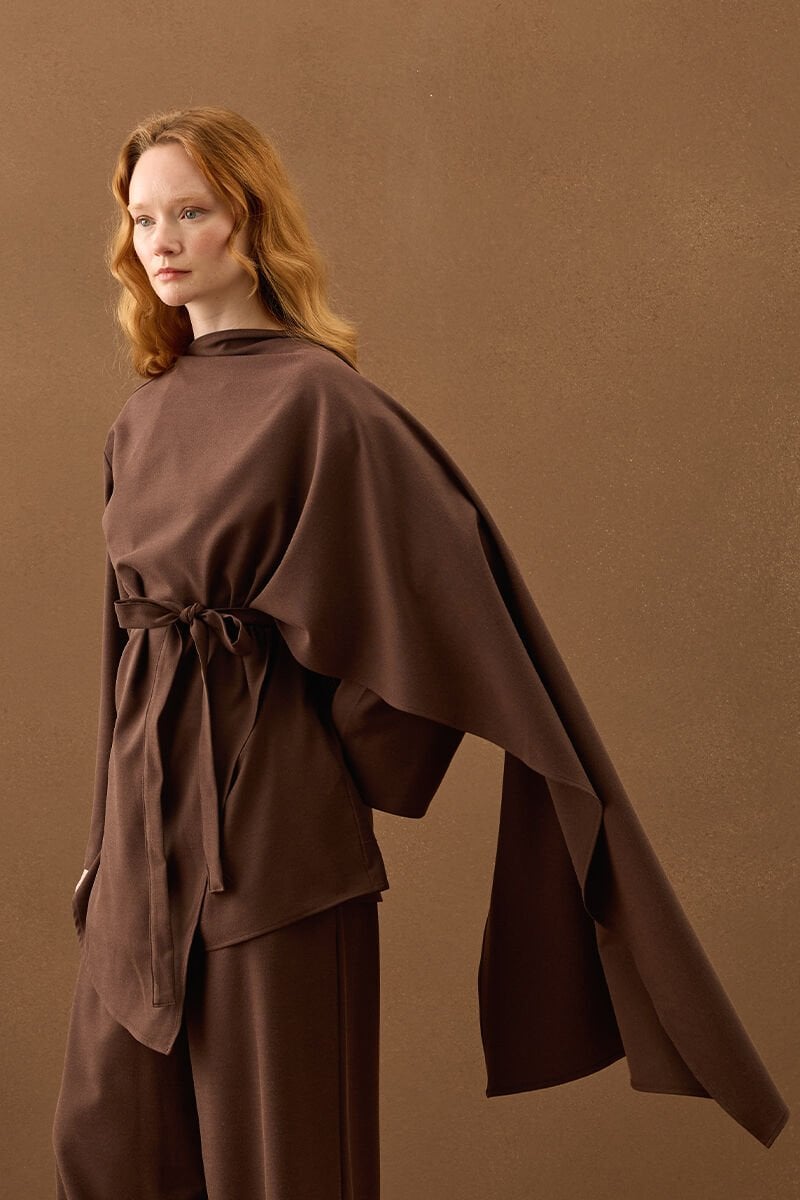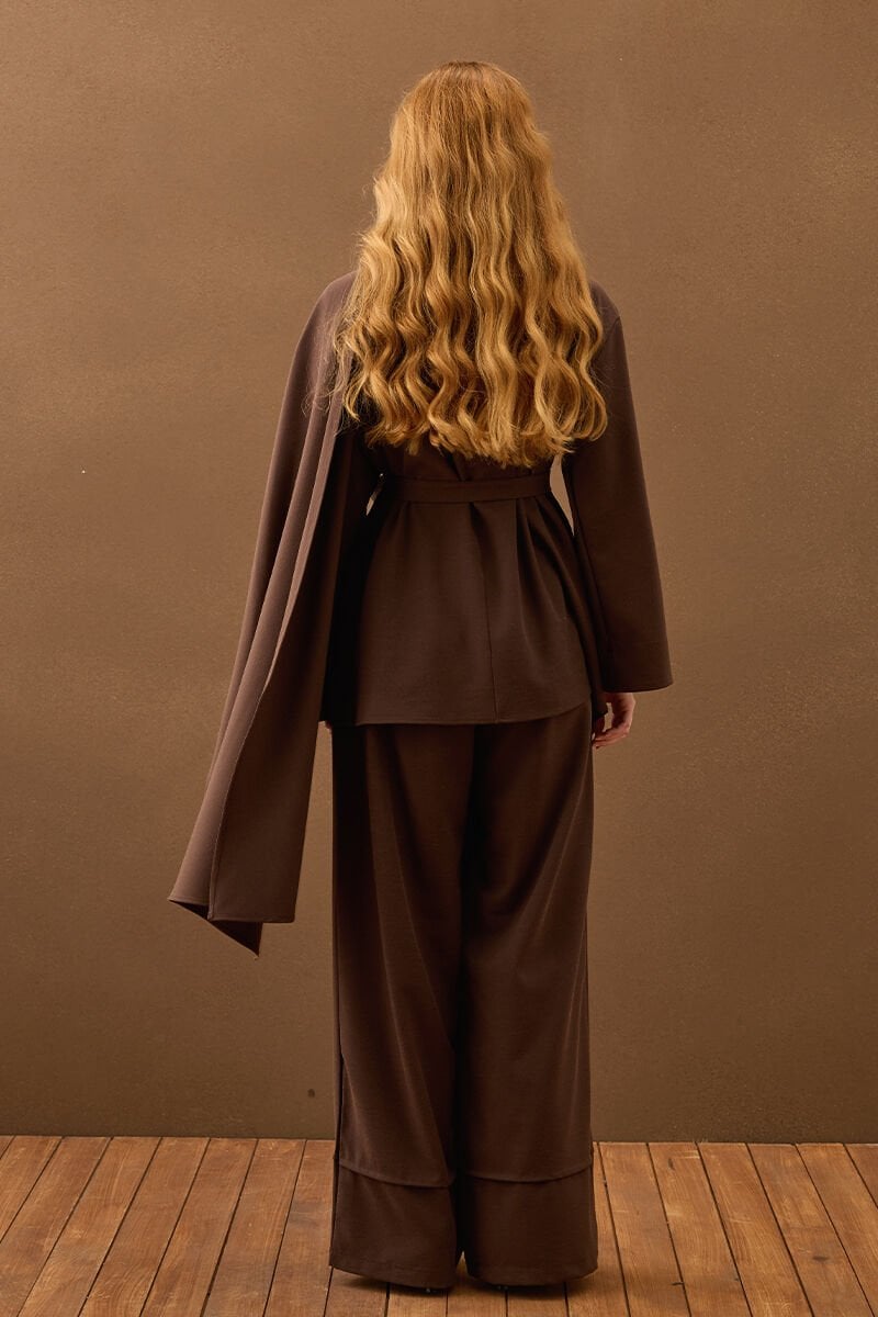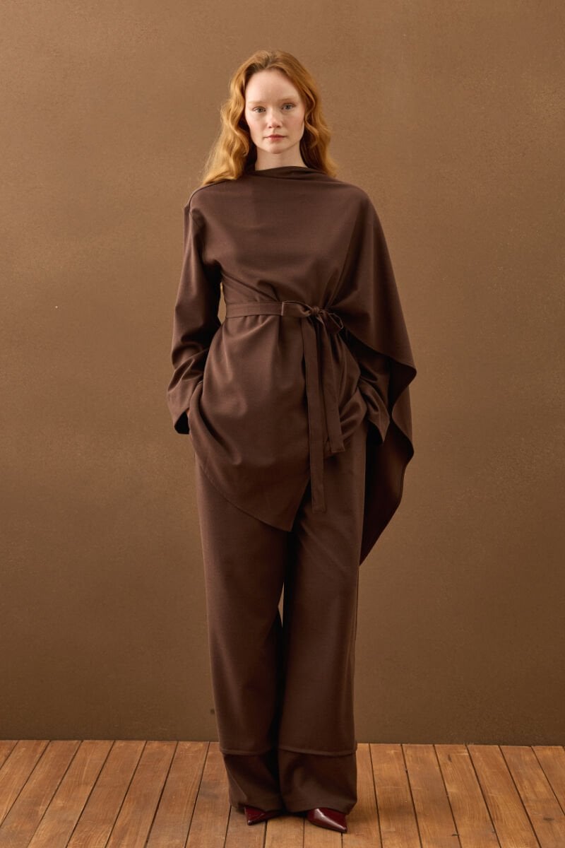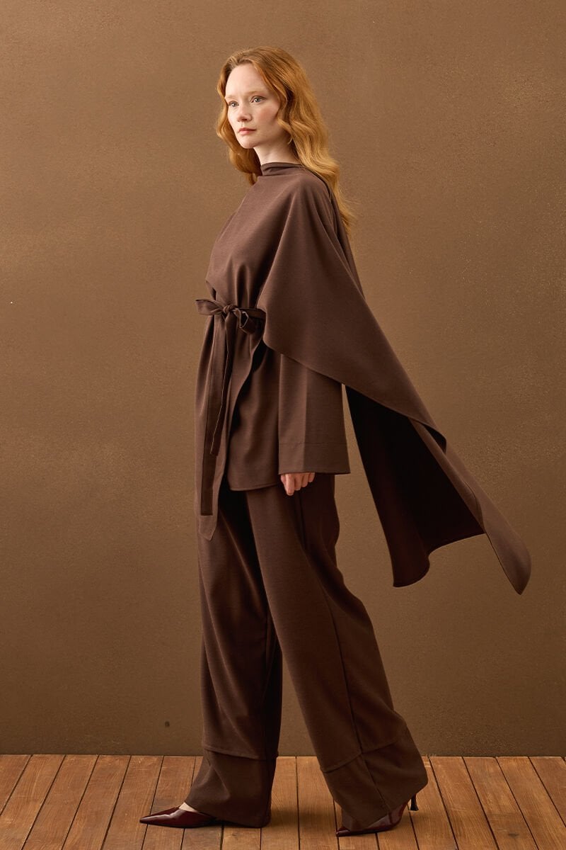 Acı Kahve Poliviskon Bağlamalı Tunik & Double Paça Pantolon Takım
