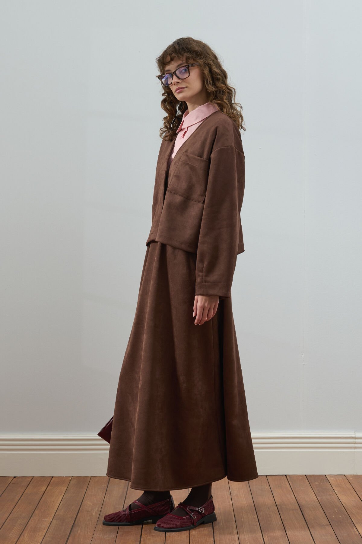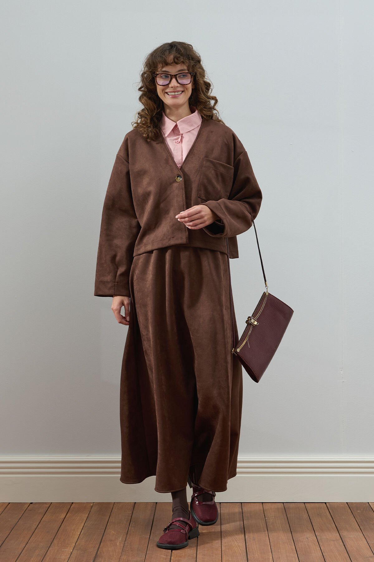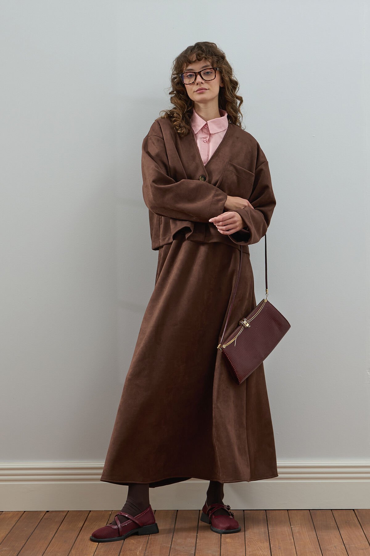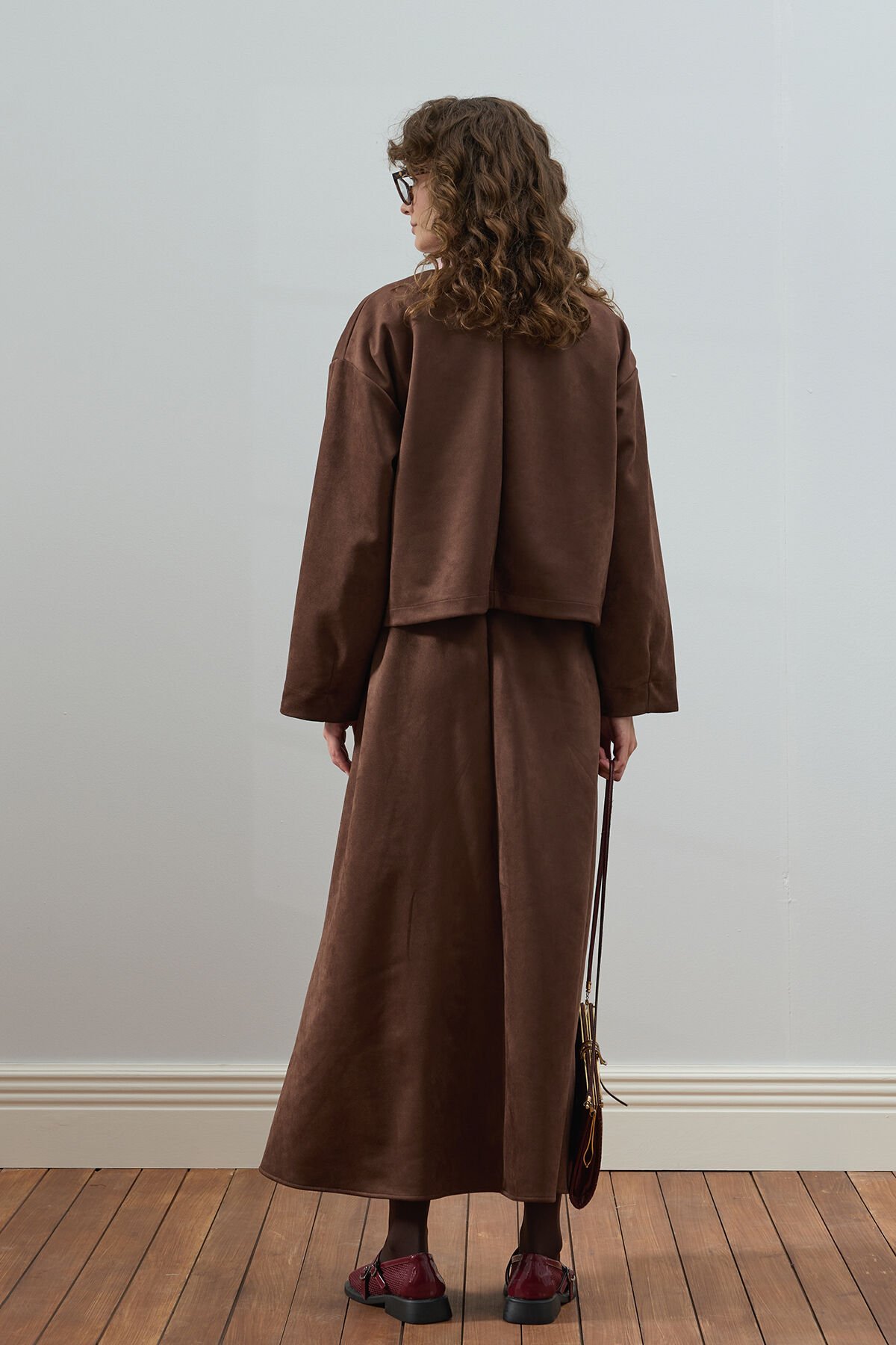 Bu süet kloş etek, zarif ve şık görünümüyle dikkat çekiyor.