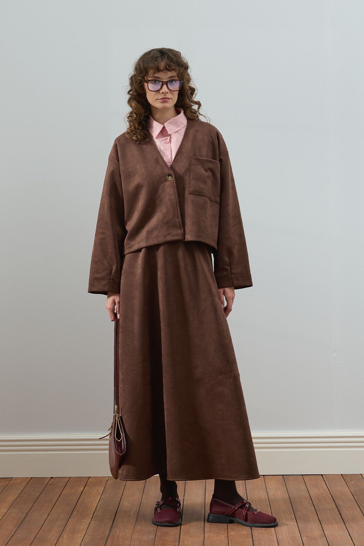 Acı Kahve Süet Kloş Etek - Ceket Takım