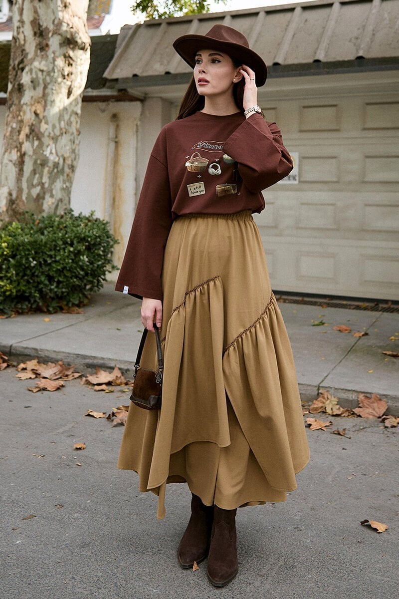 Acı Kahve Vintage Baskılı Basic Body & Karamel Poliviskon Bohem Kat Etek Takım