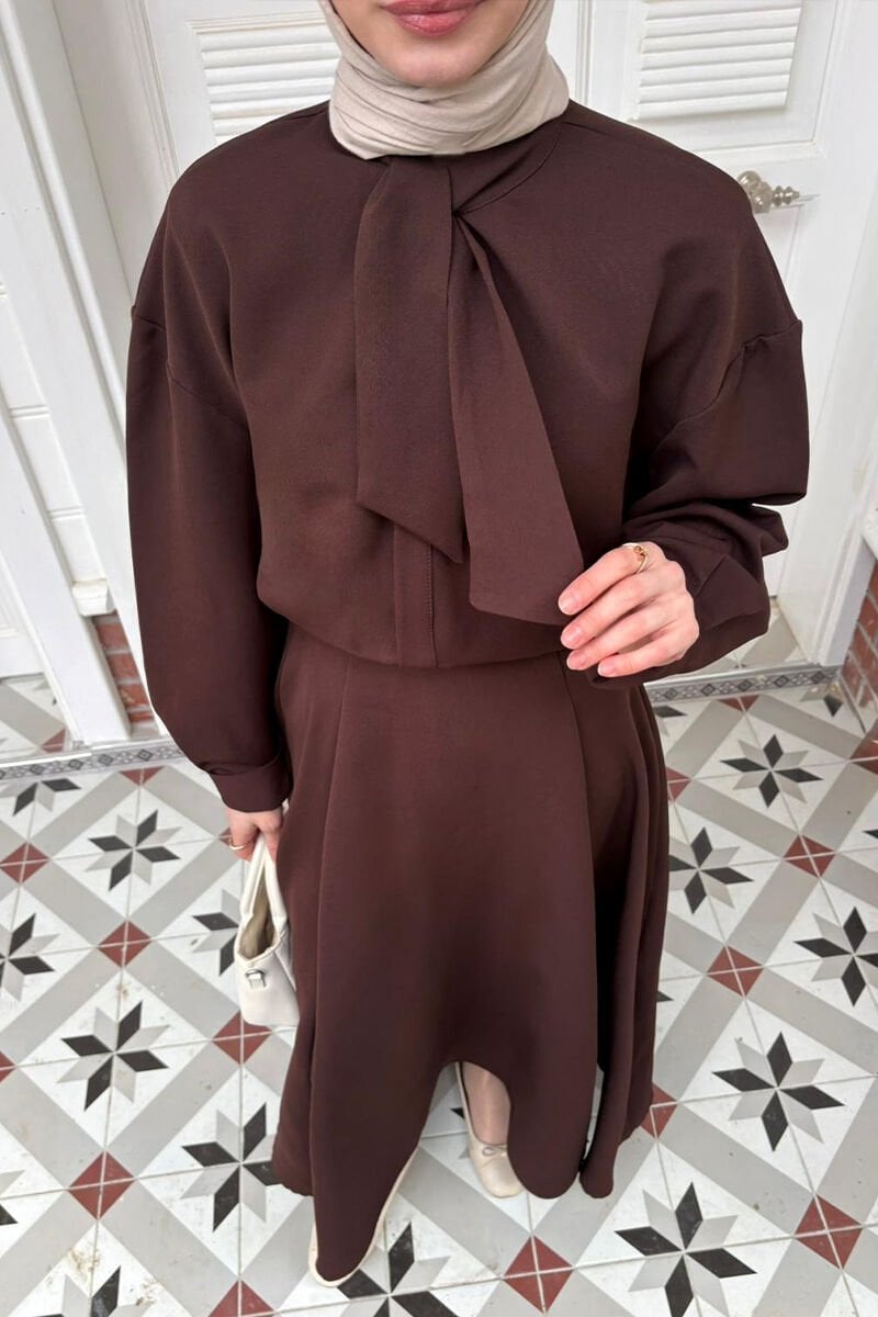 Acı Kahve Yakası Fiyonklu Krep Gömlek