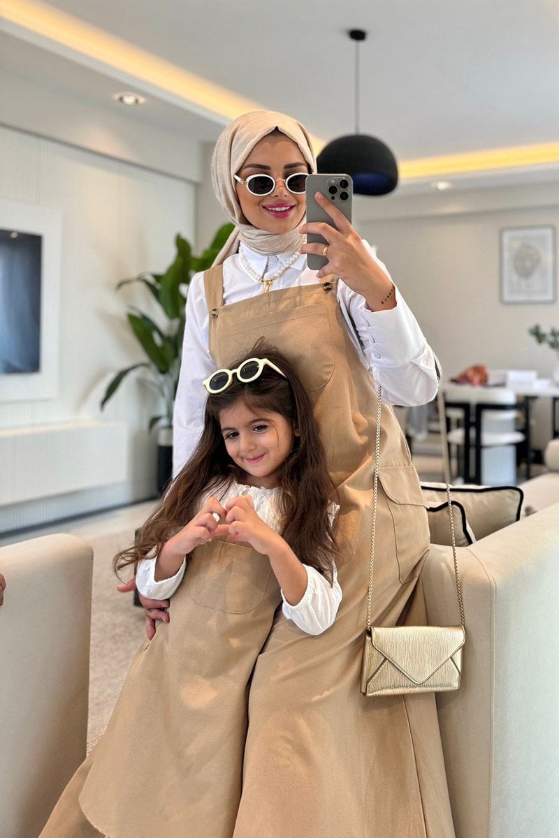 Anne - Çocuk Sütlü Kahve Duck Keten Etekli Salopet Takım