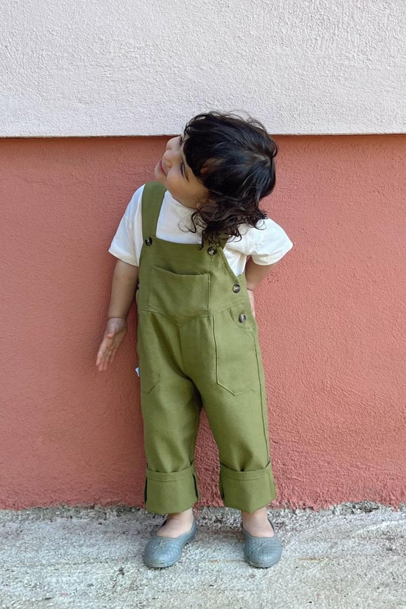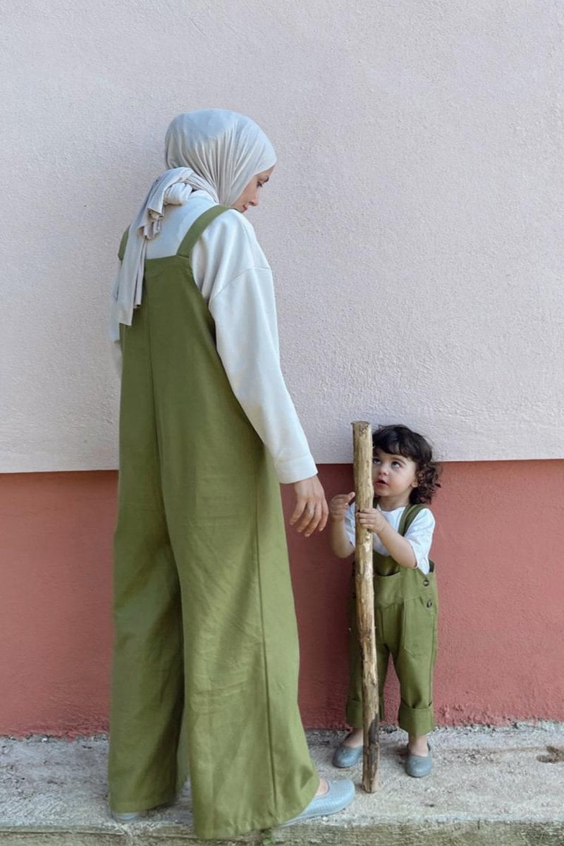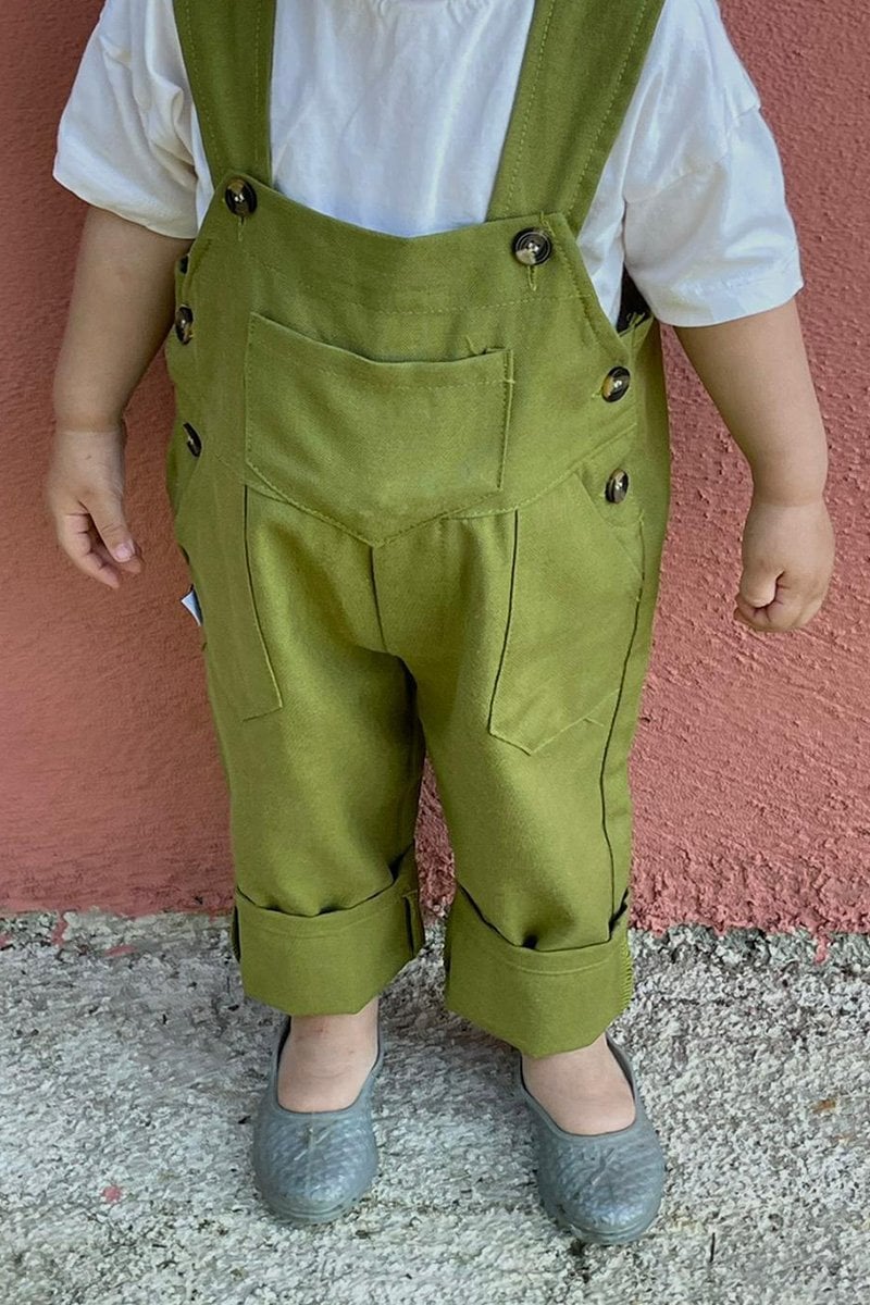 Anne - Çocuk Yağ Yeşili Duck Keten Salopet Tulum