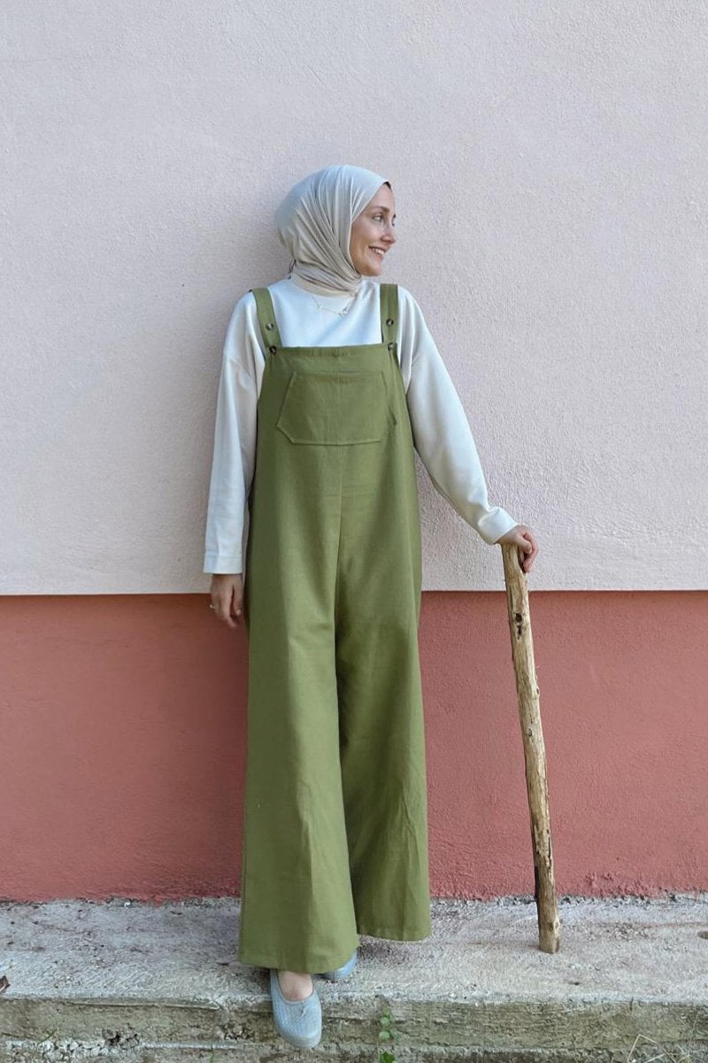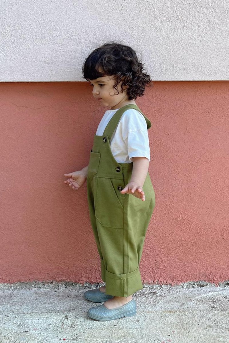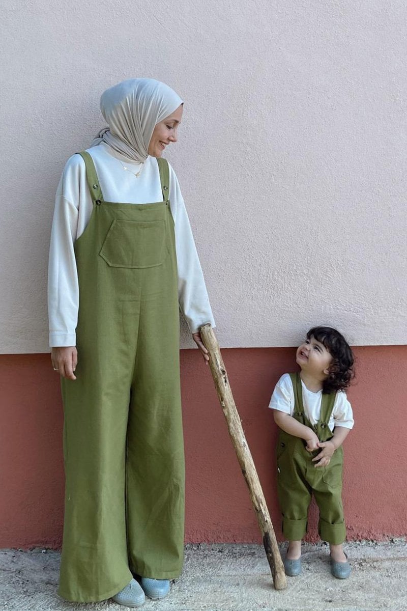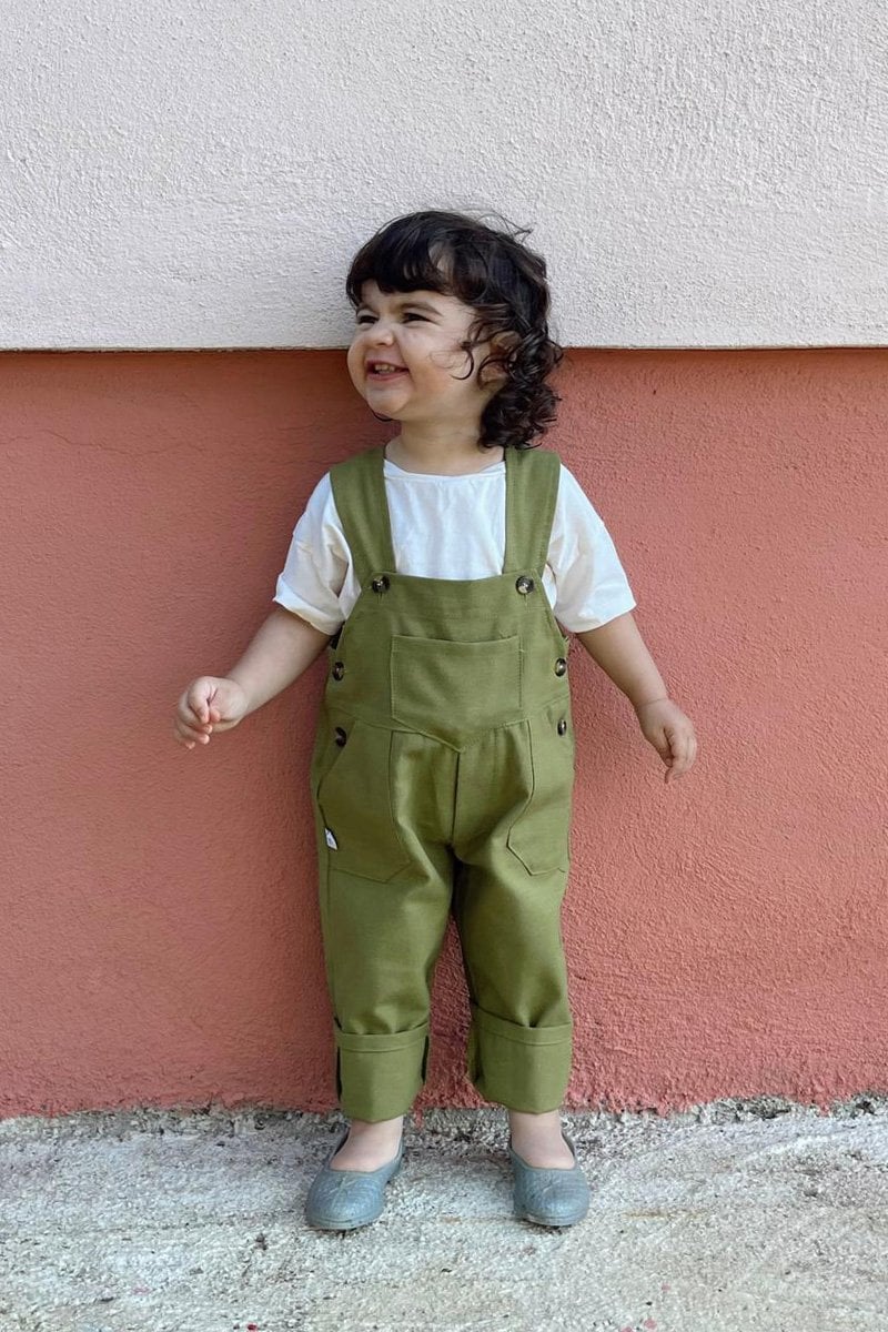 Anne - Çocuk Yağ Yeşili Duck Keten Salopet Tulum