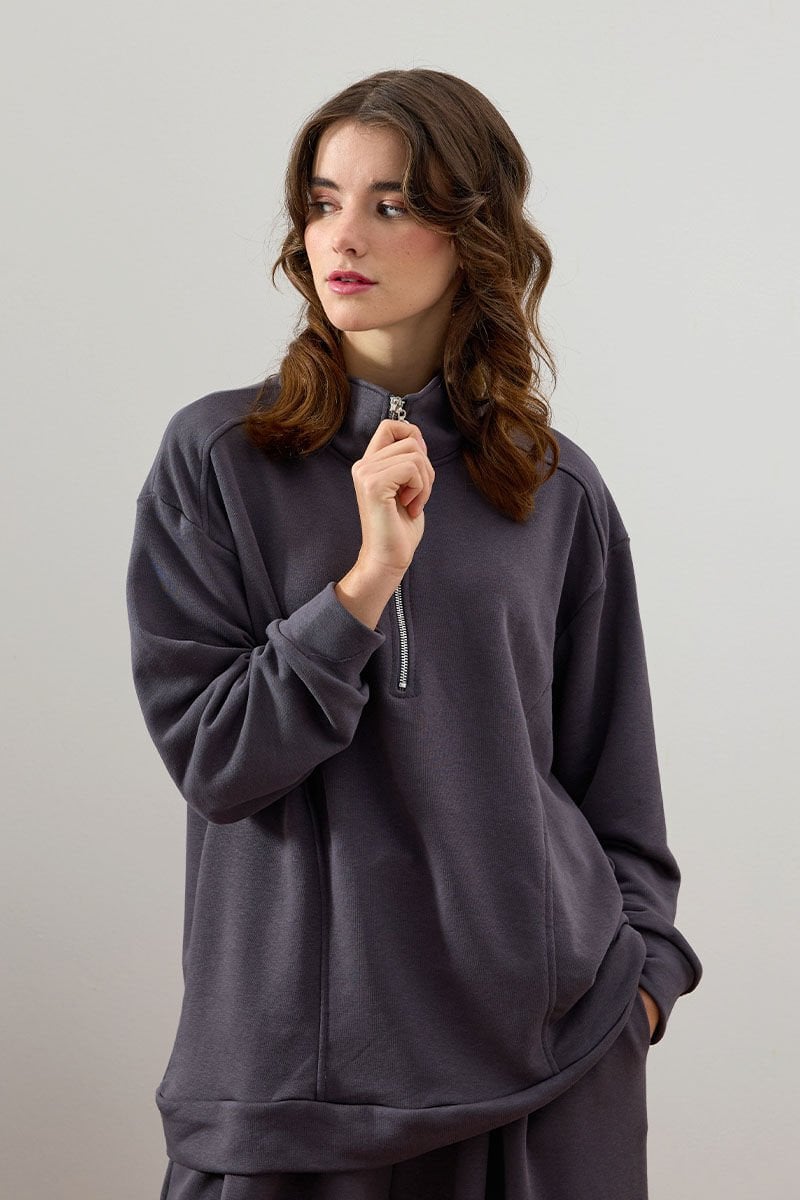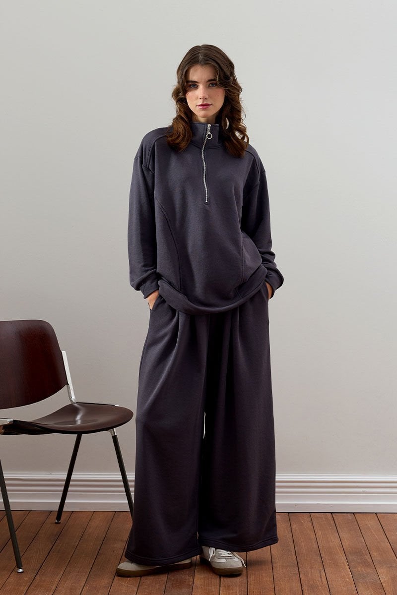 Antrasit 3 İplik Yarım Fermuarlı Eşofman Takım
