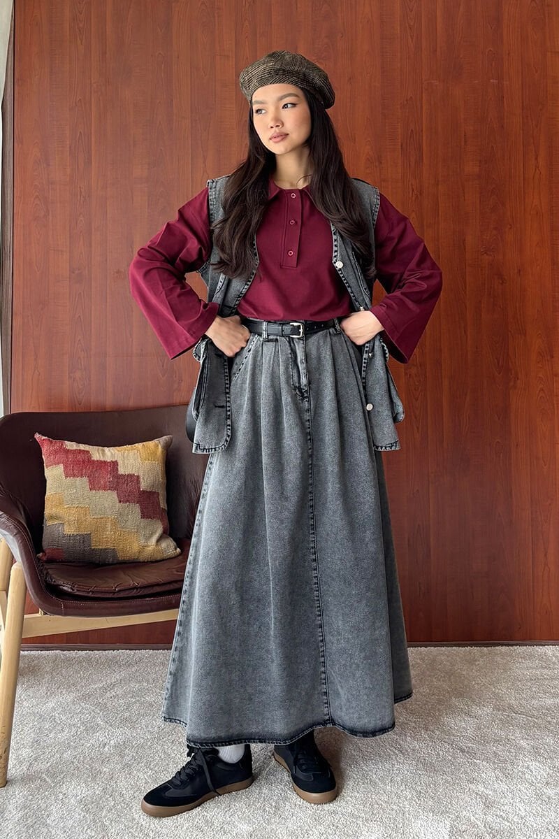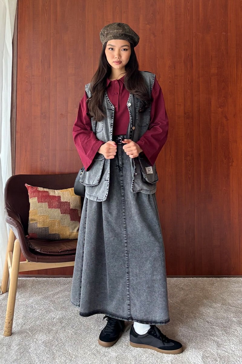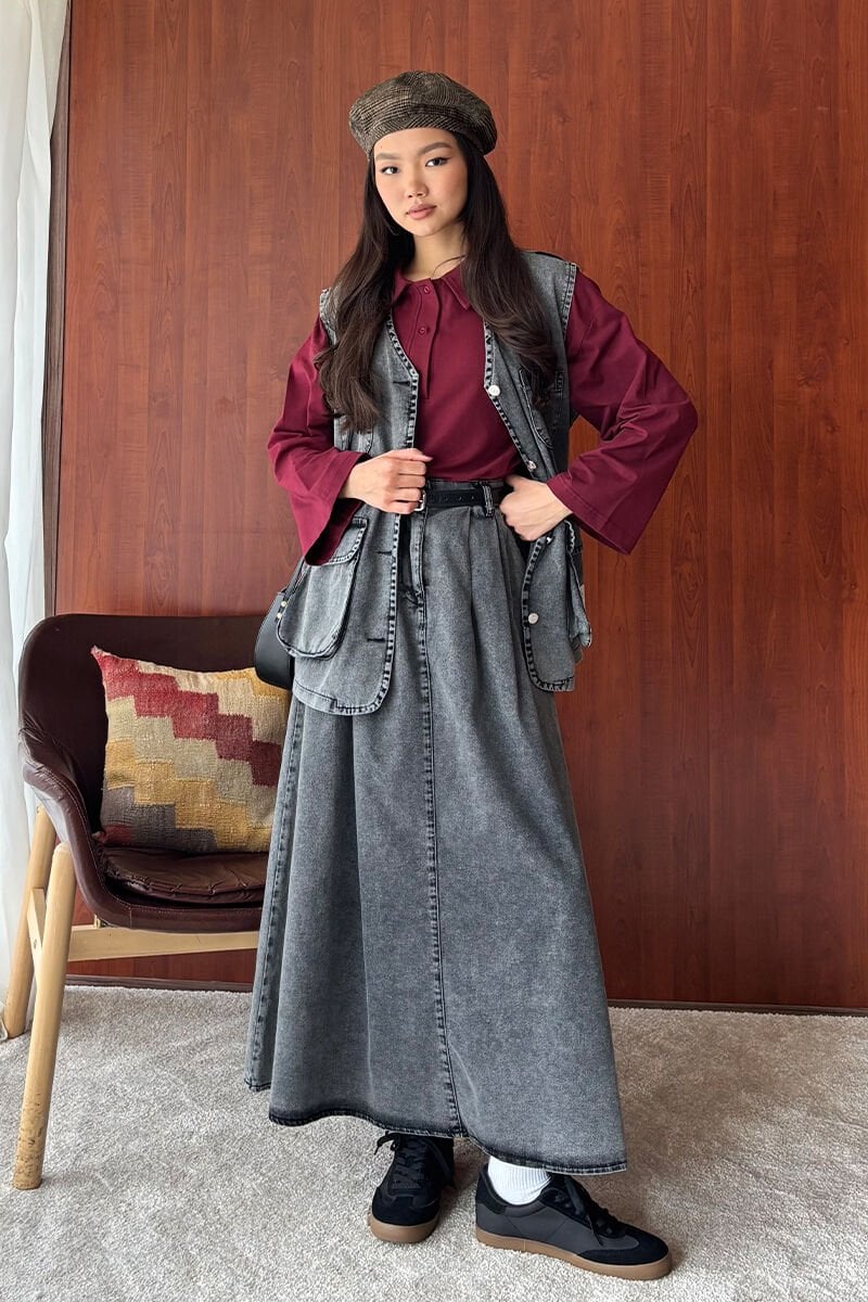 Antrasit Kargo Cepli Kot Yelek & Antrasit Kot Tek Düğmeli Etek Takım