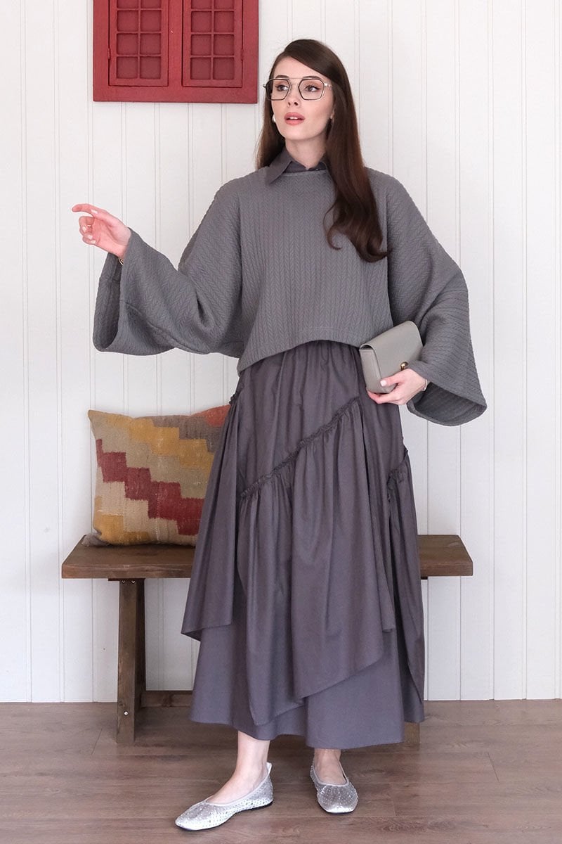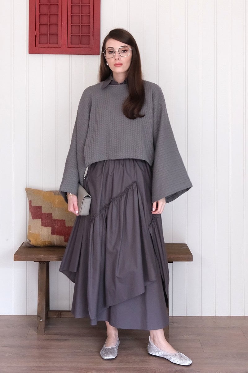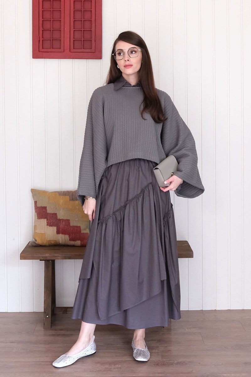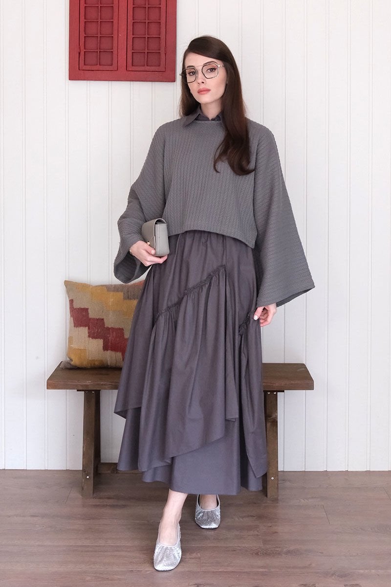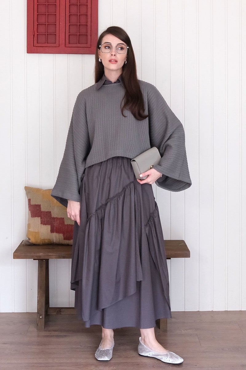 Rahat, hafif ve şık bir görünüm sunan bu etek, kat detayları ile dikkat çekiyor.
