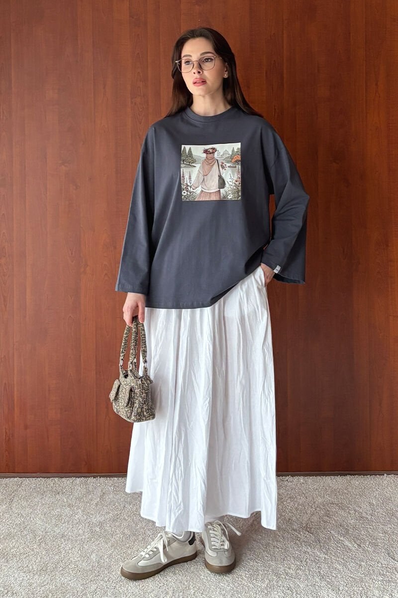 Antrasit Papatya Kız Baskılı Basic Body & Beyaz Kraşlı Balon Etek Takım