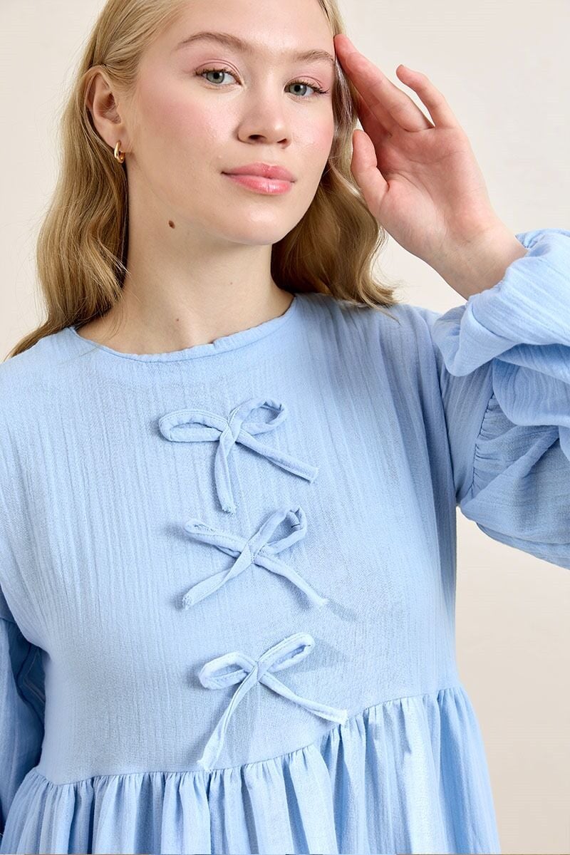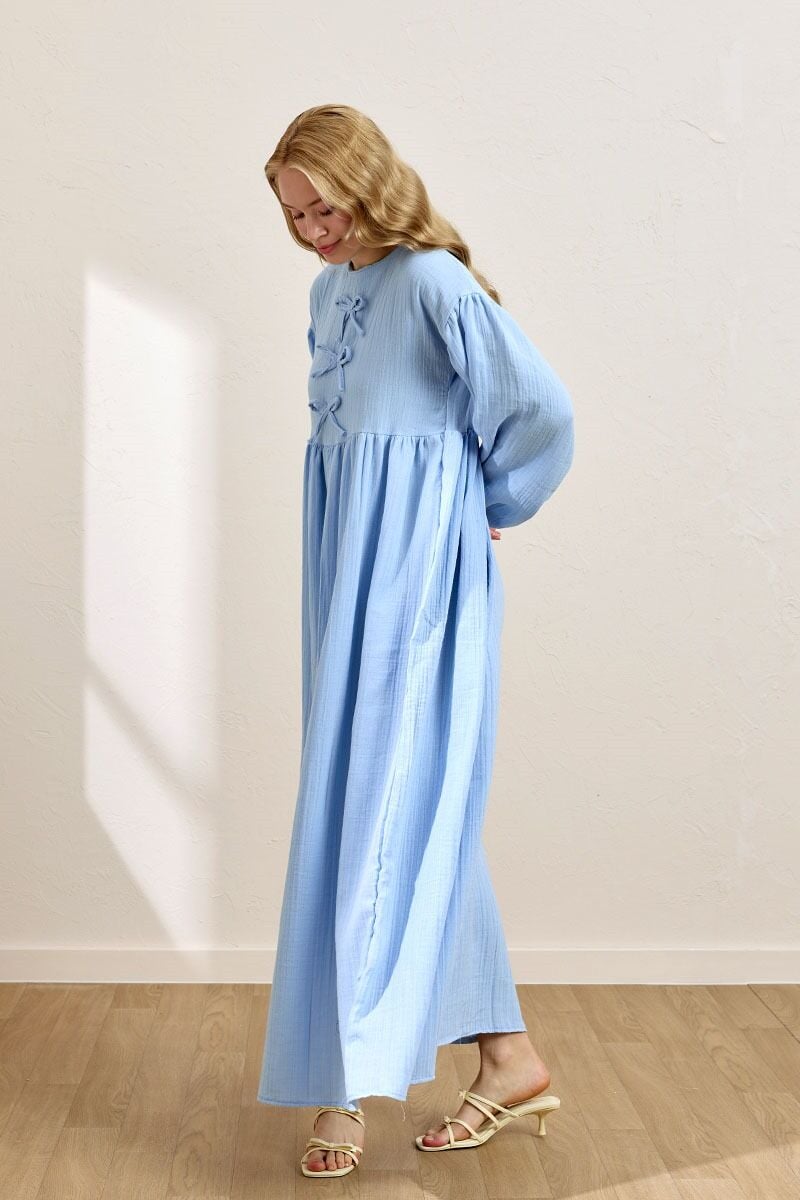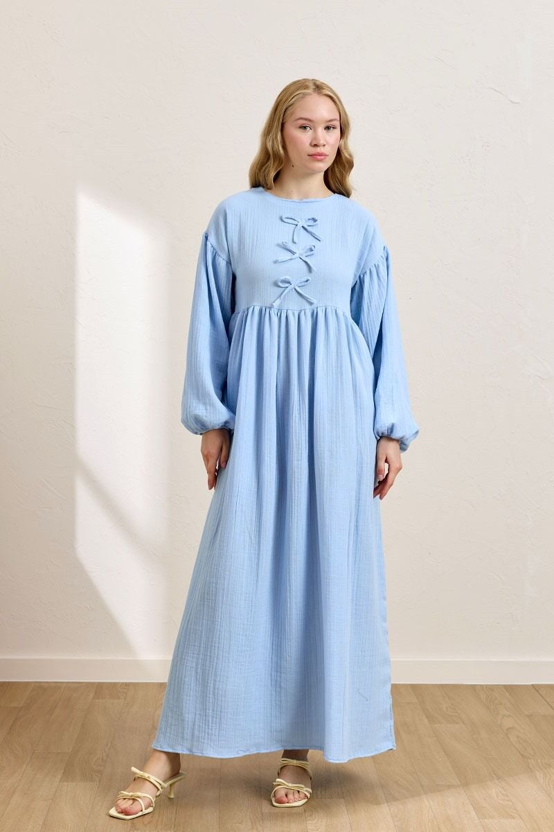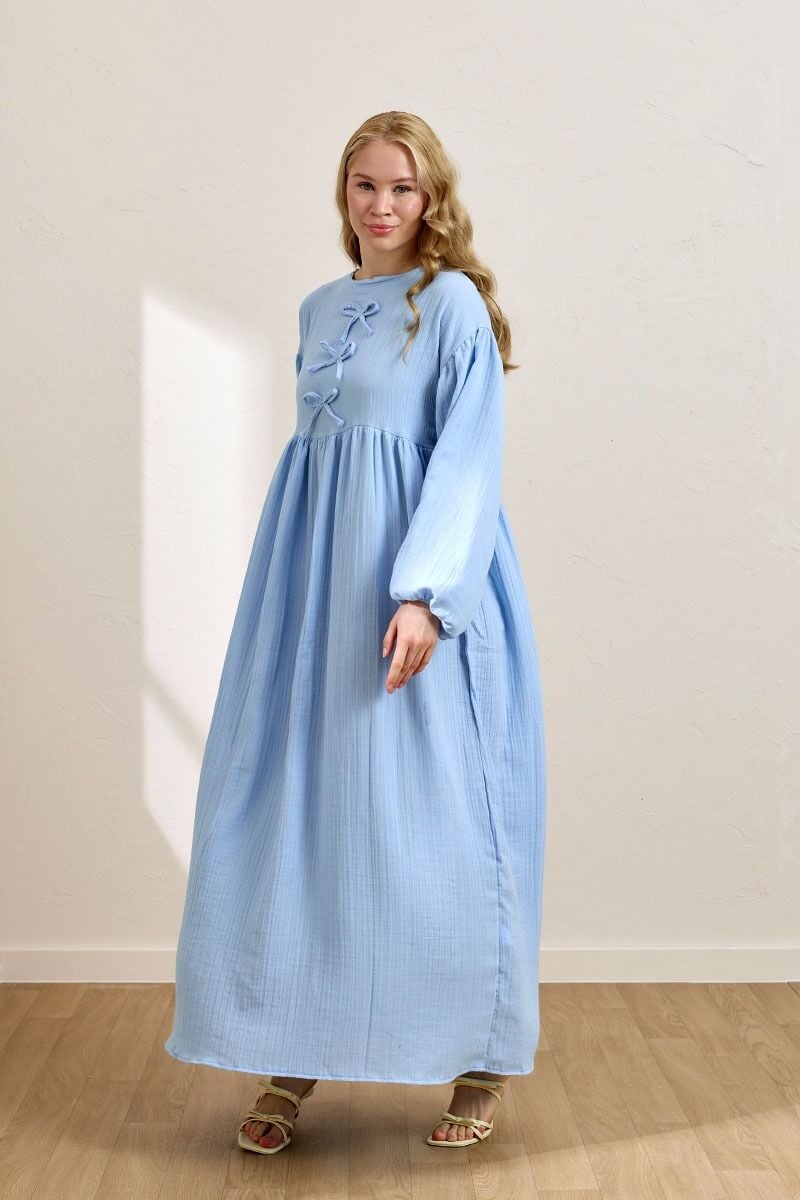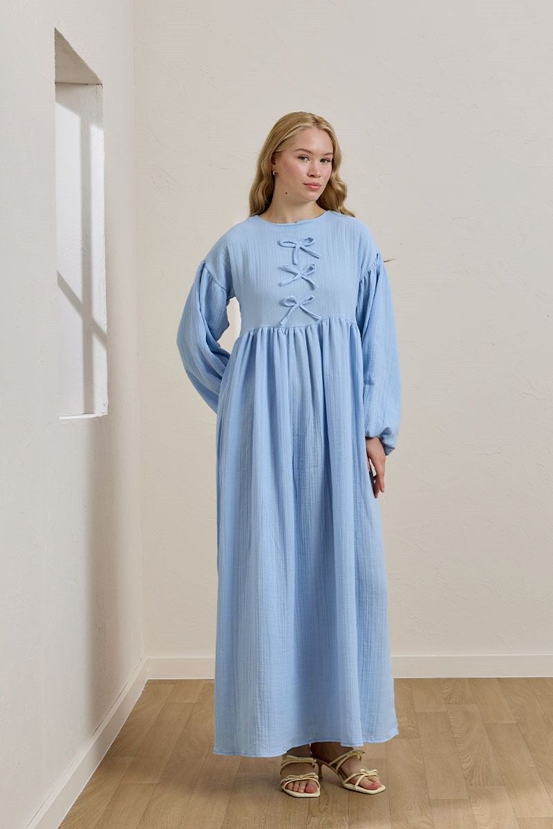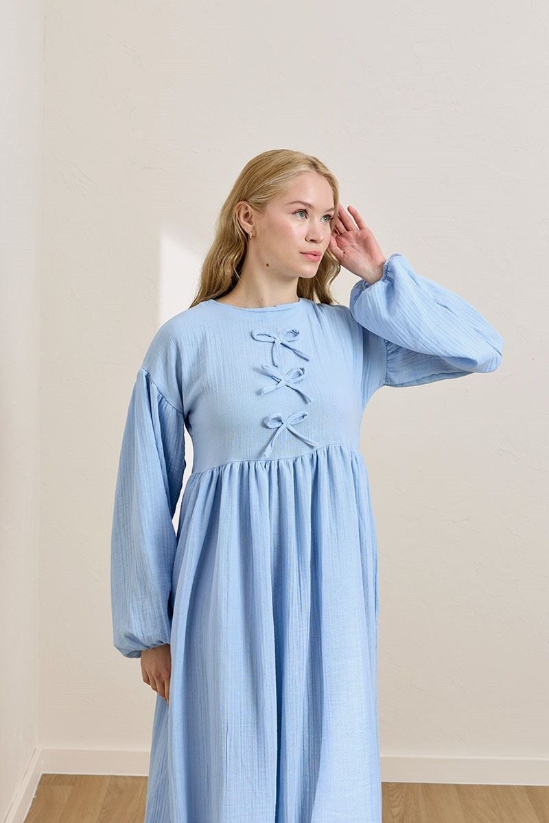 Bebe Mavisi Müslin Fiyonklu Belroba Elbise