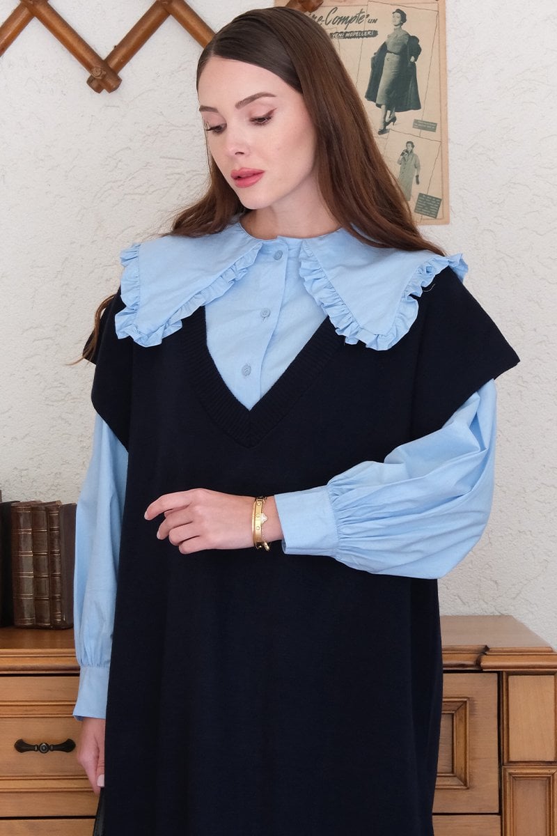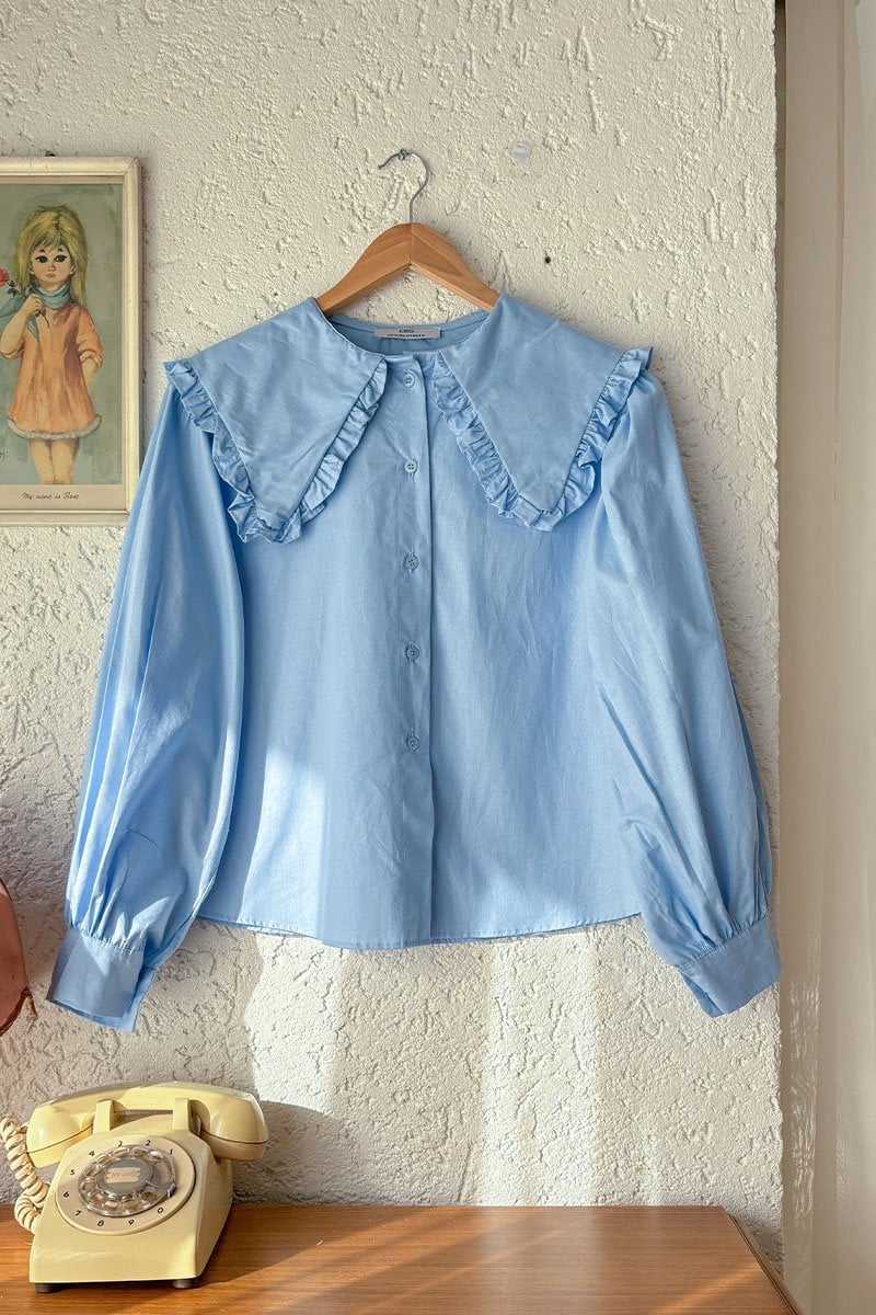 Bebe Mavisi Yakası Fırfırlı Crop Gömlek
