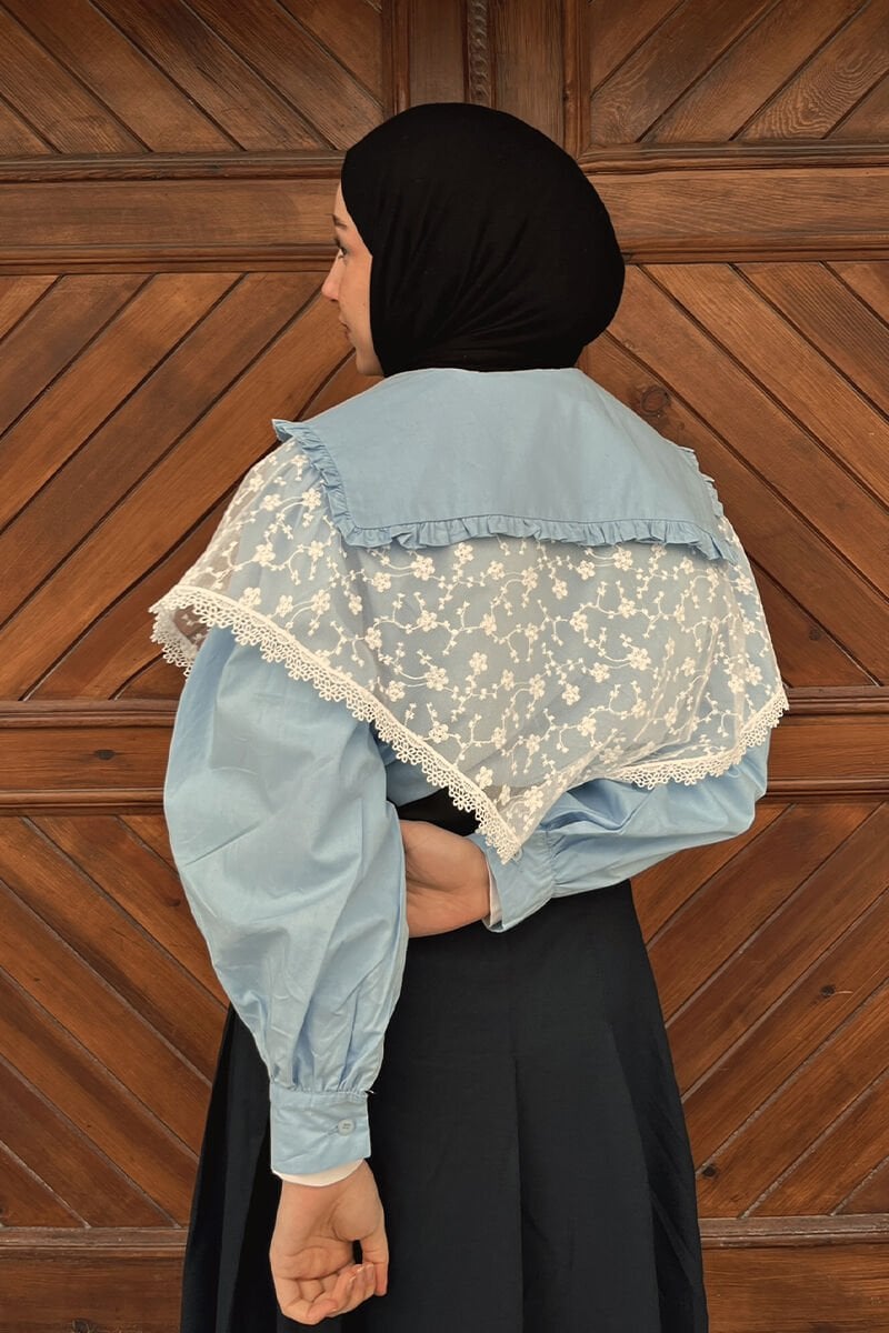 Bebe Mavisi Yakası Fırfırlı Crop Gömlek