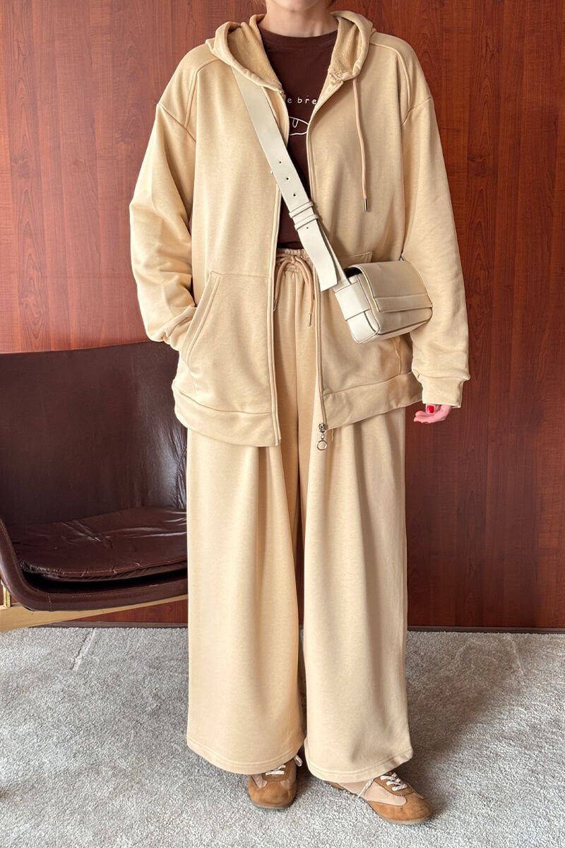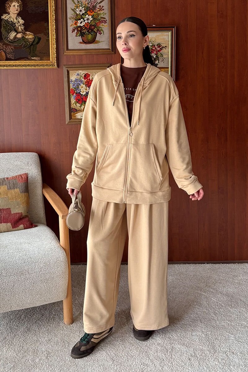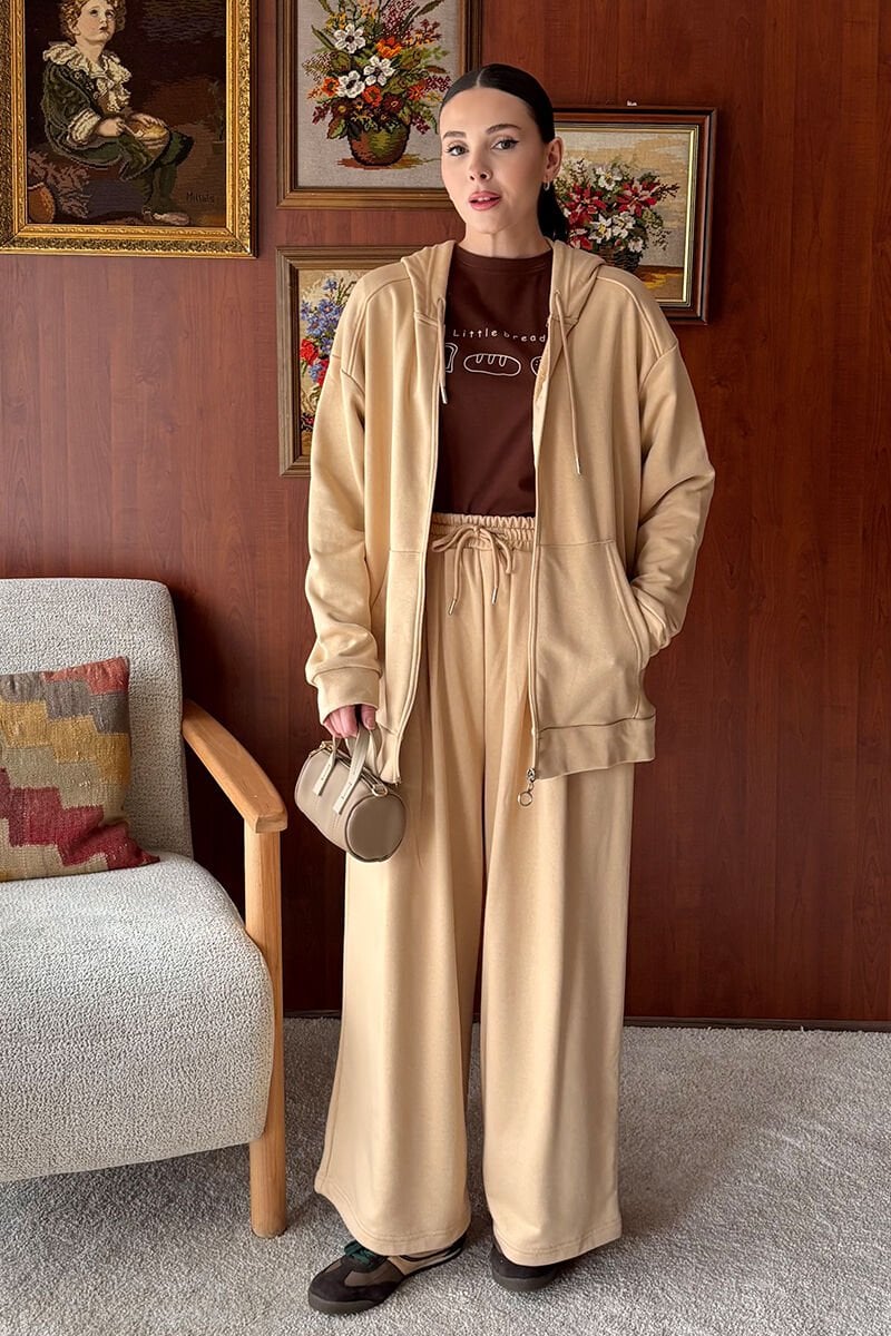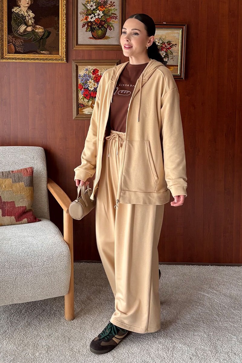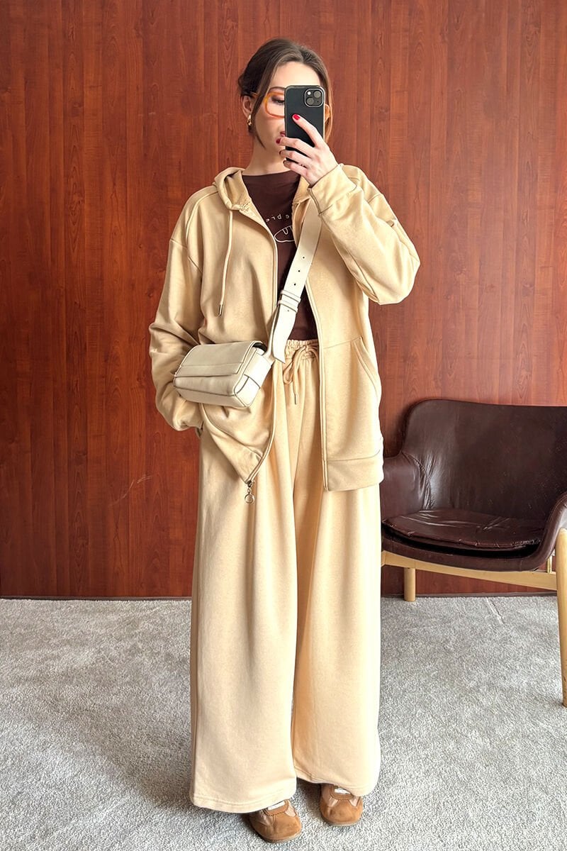 Bej 3 İplik Uzun Fermuarlı Eşofman Takım