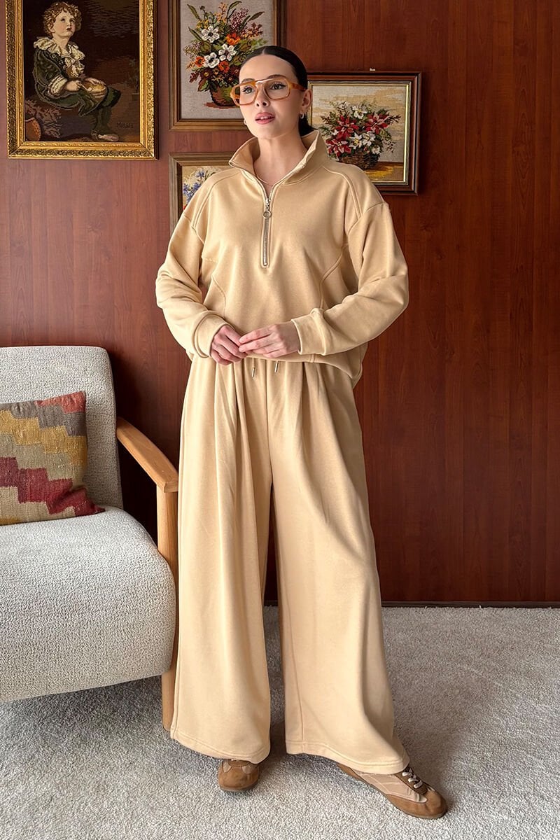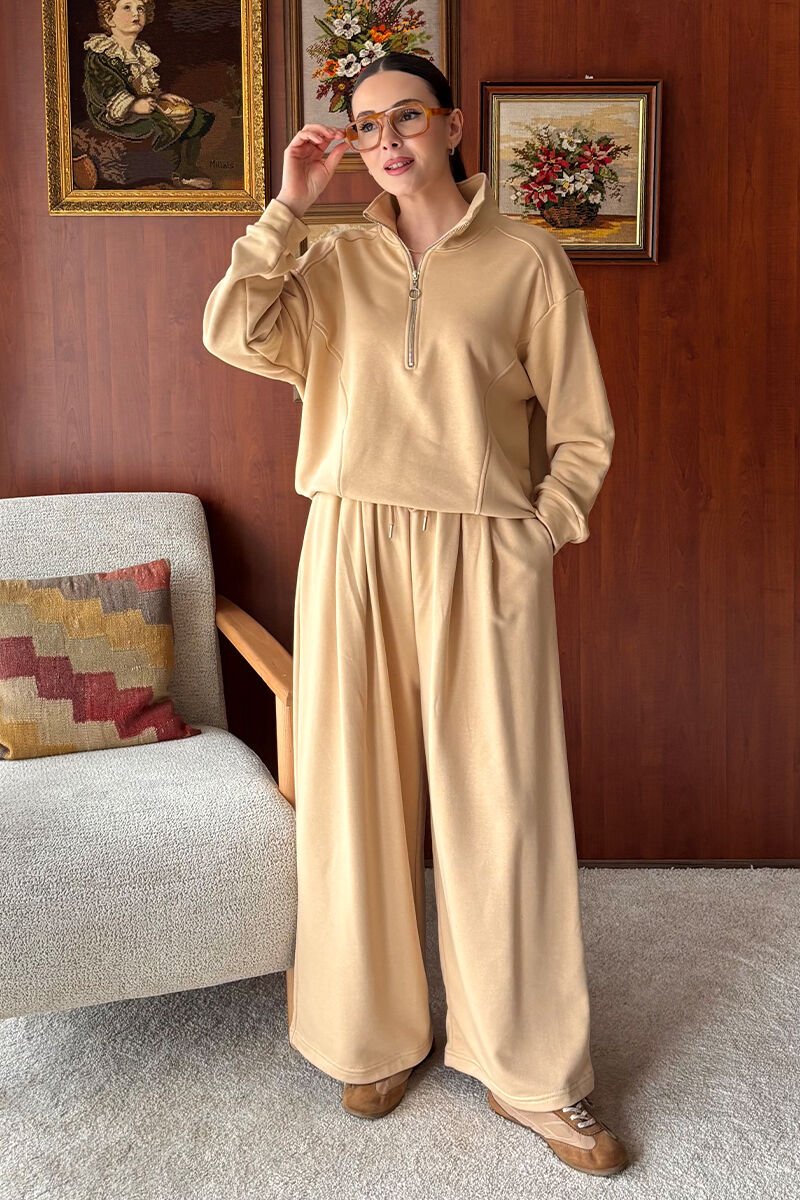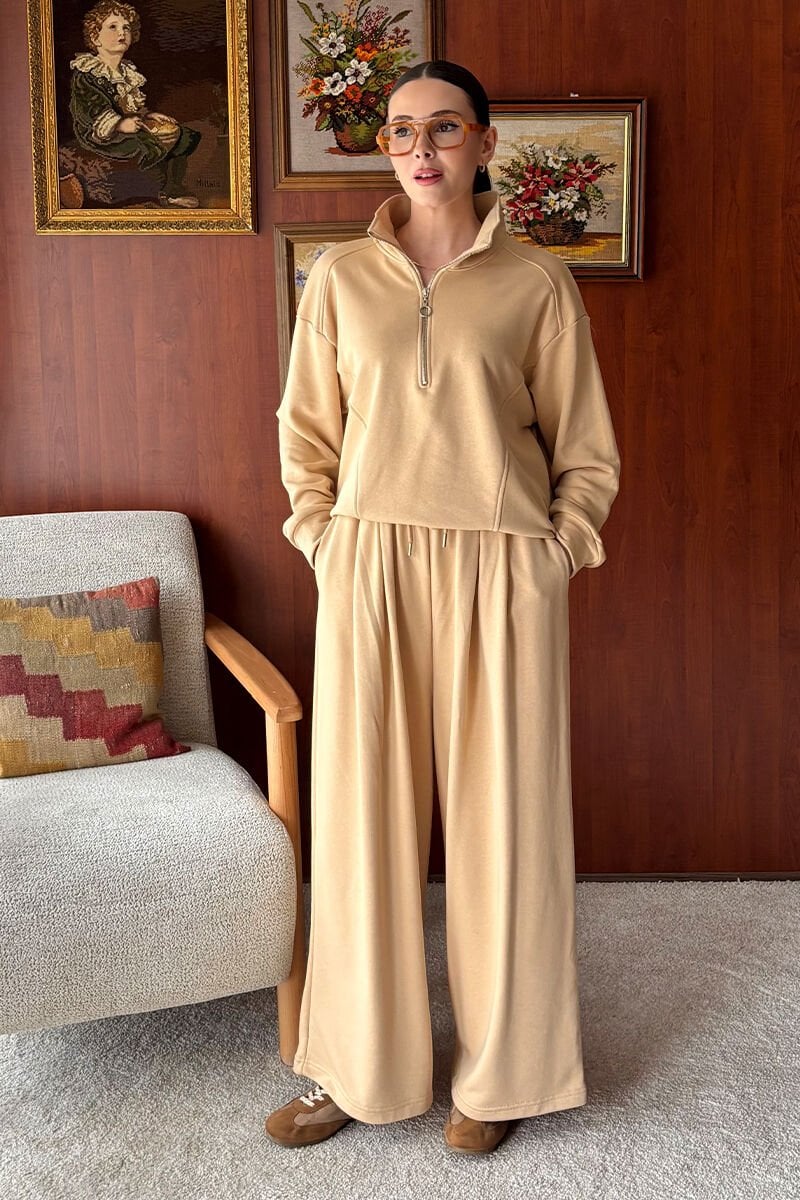 Bej 3 İplik Yarım Fermuarlı Eşofman Takım