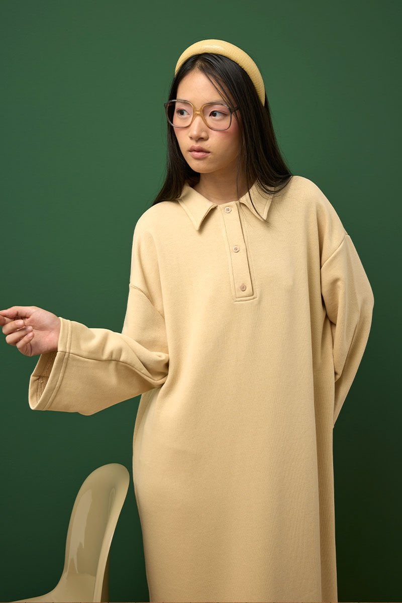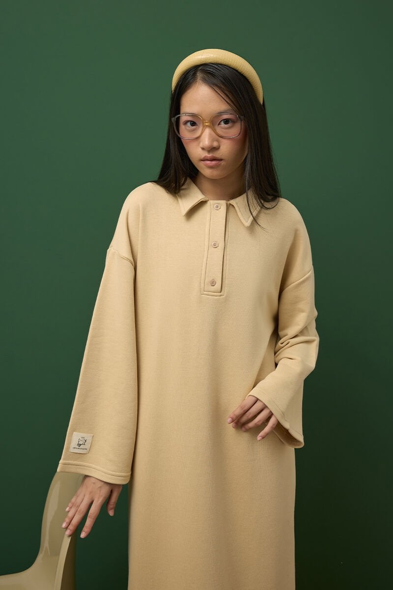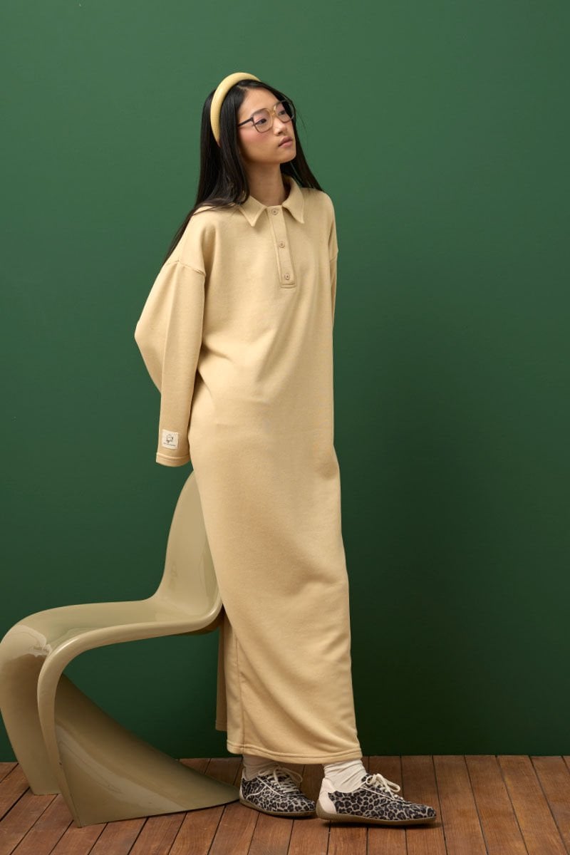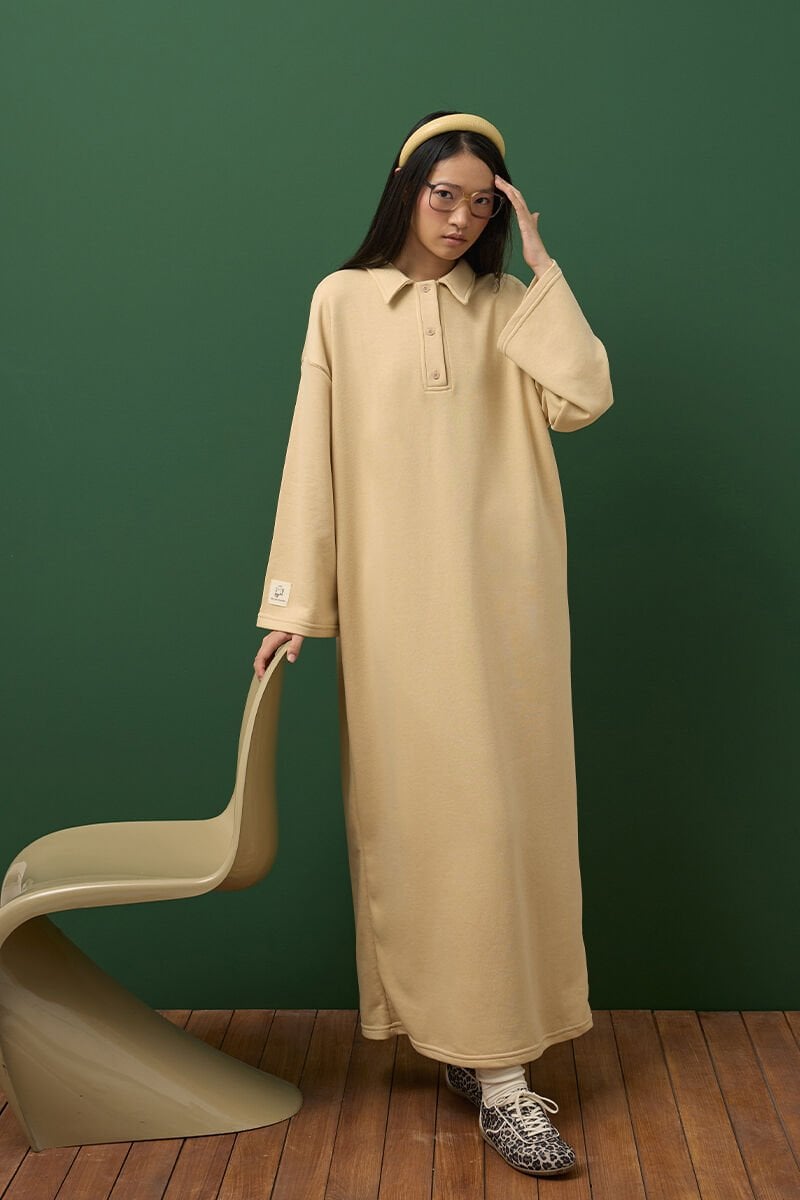 Bu şık ve rahat 3 iplik polo yaka uzun elbise, her an için harika bir seçenek.