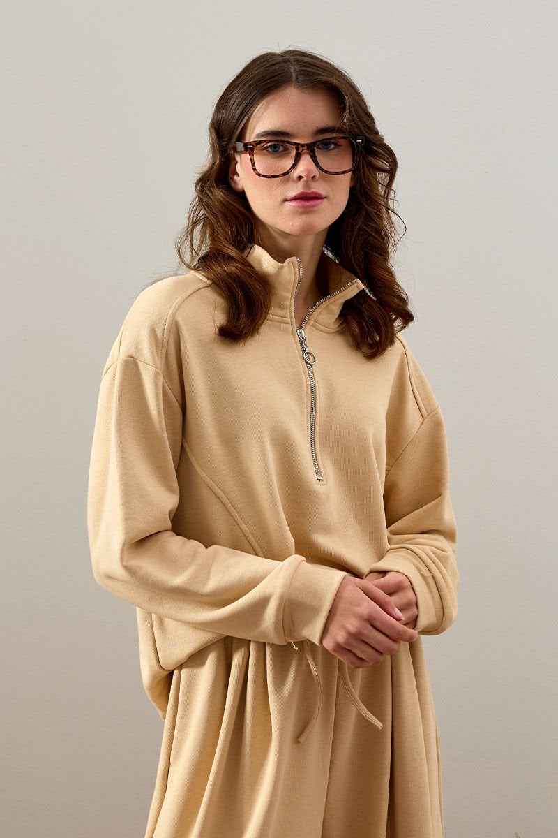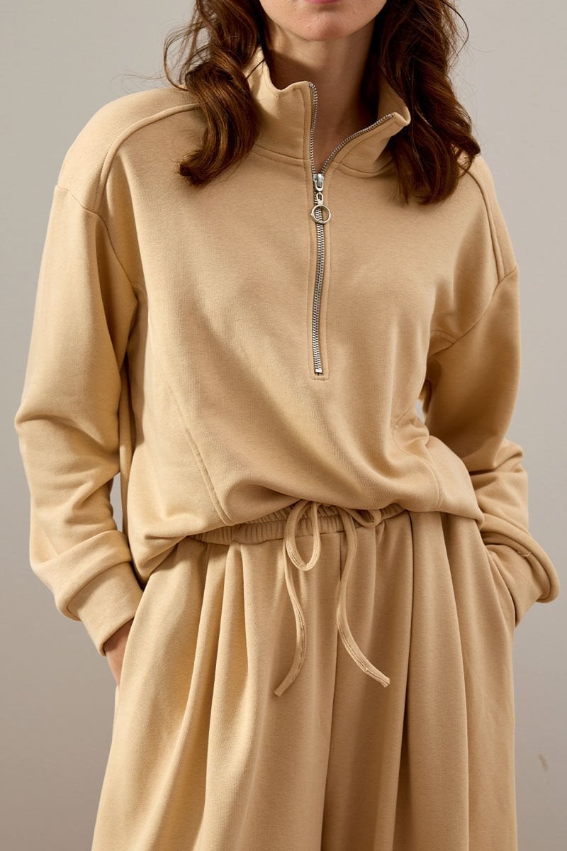 Bej 3 İplik Yarım Fermuarlı Sweat