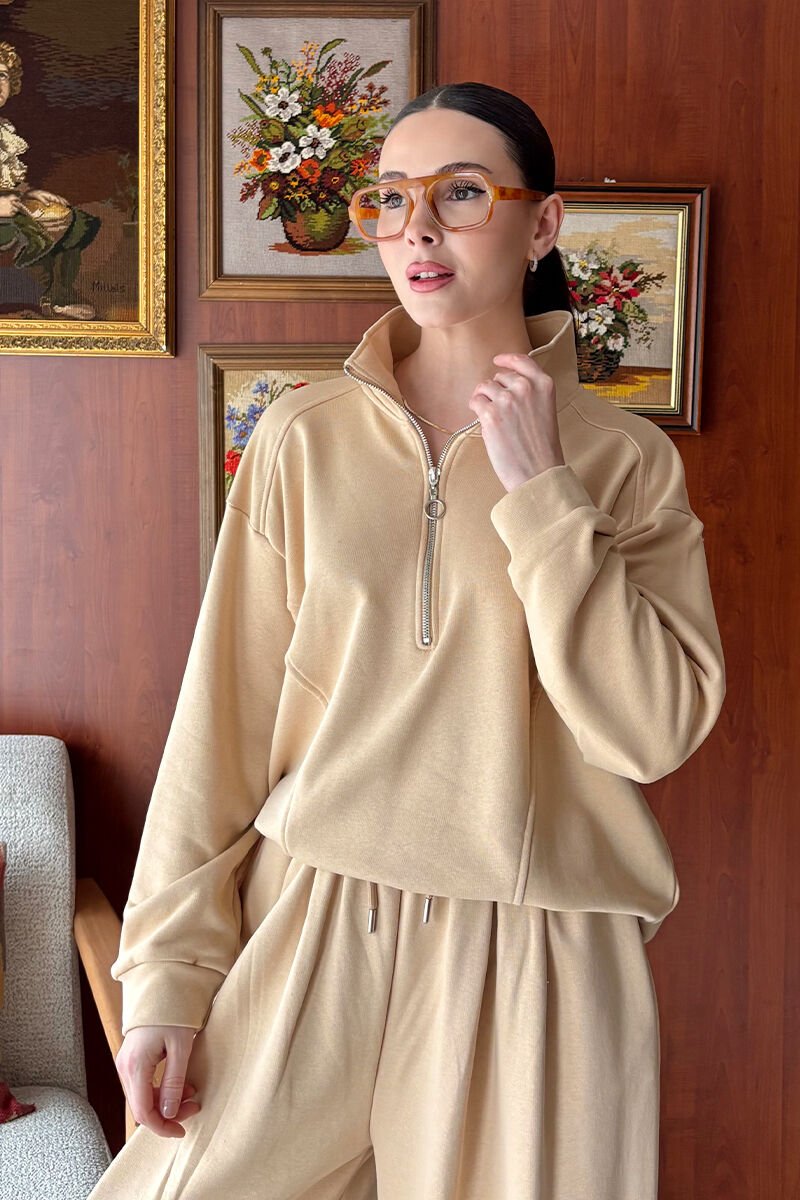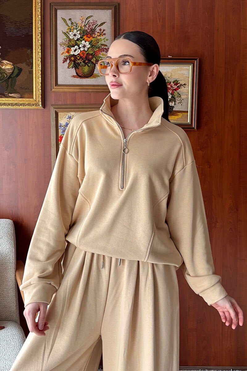 Bej 3 İplik Yarım Fermuarlı Sweat