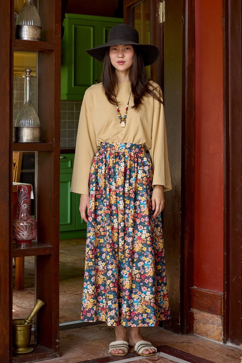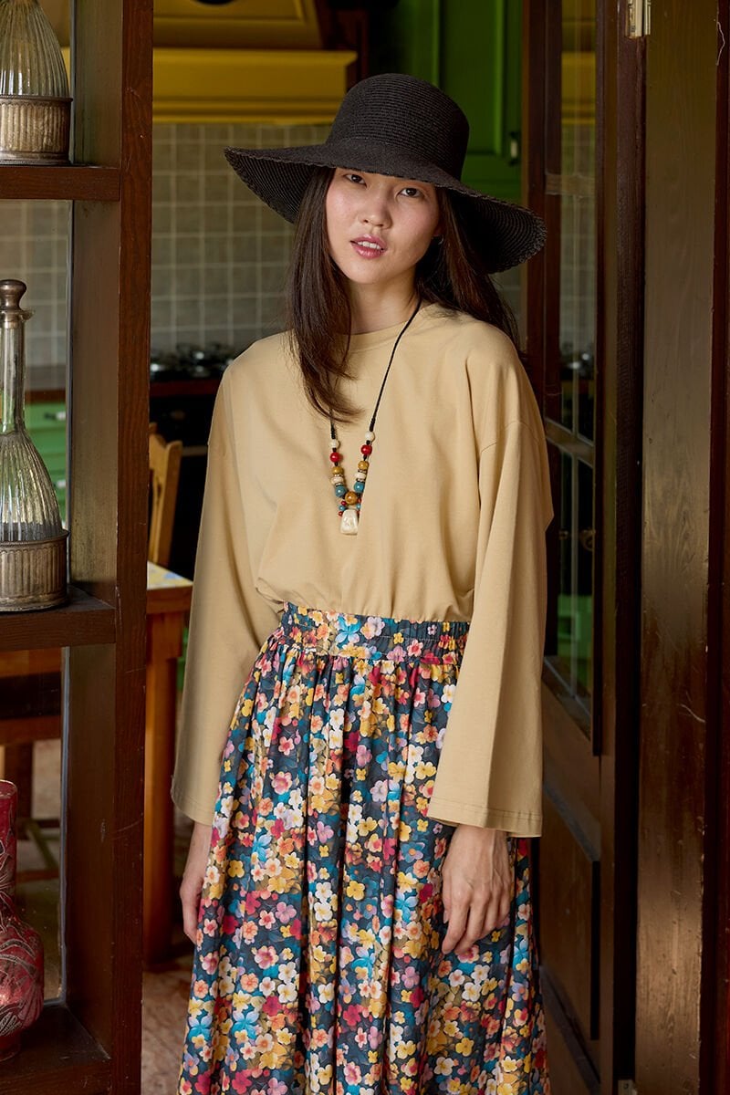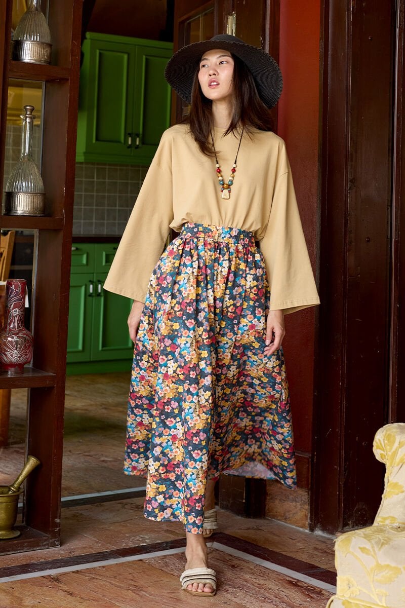Bej Crop Body & Sarı Çiçek Desenli Balon Etek Takım