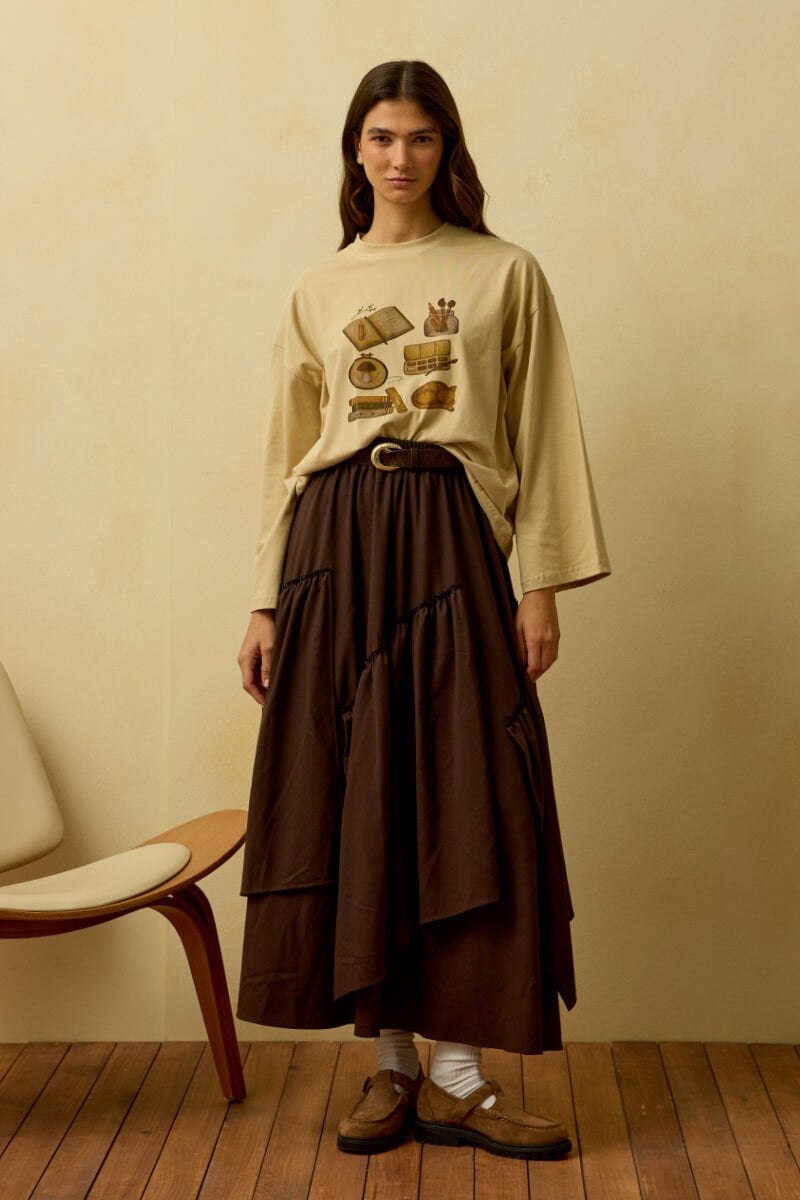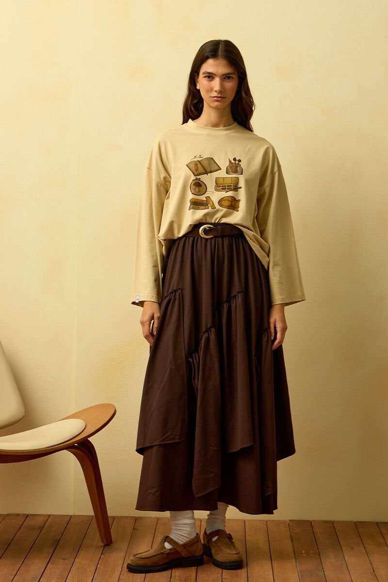 Bej Kitap Baskılı Basic Body & Acı Kahve Poliviskon Bohem Kat Etek Takım