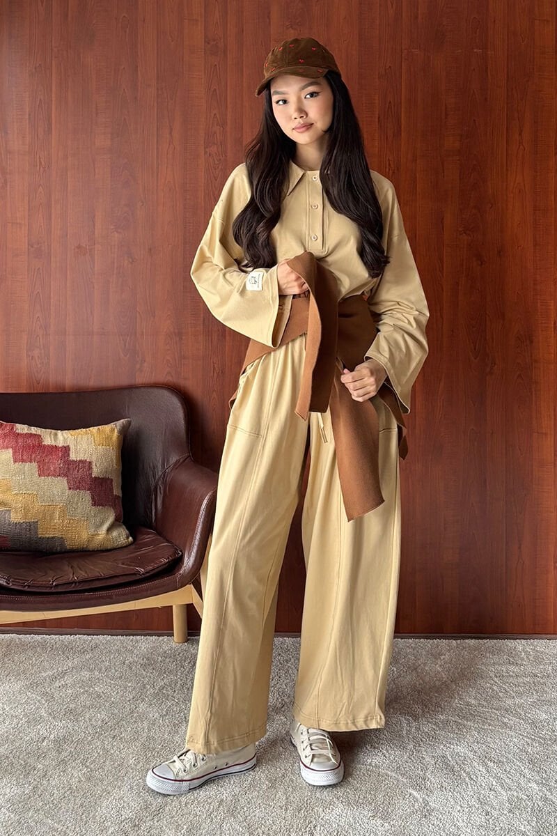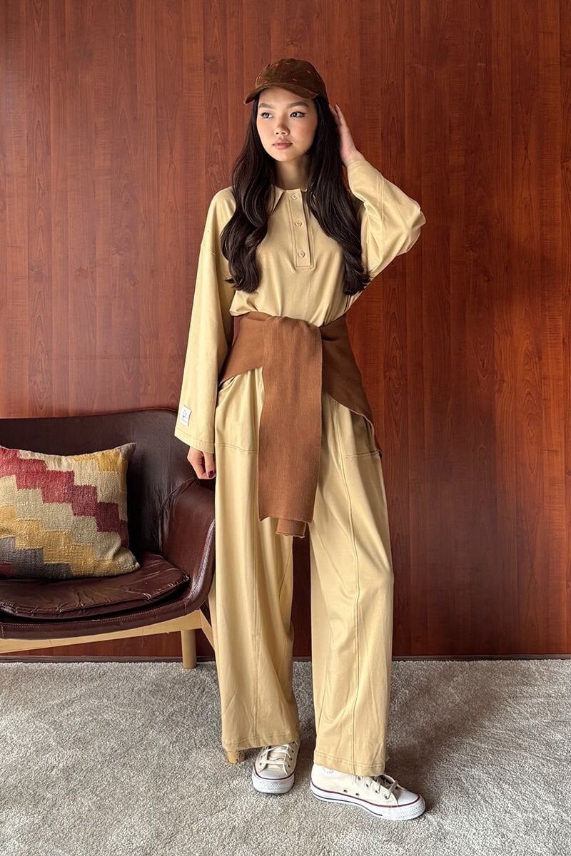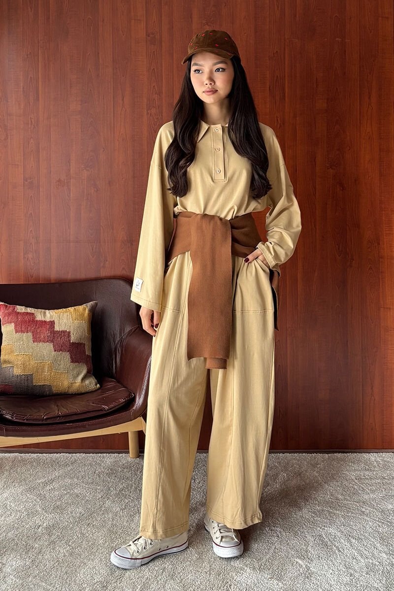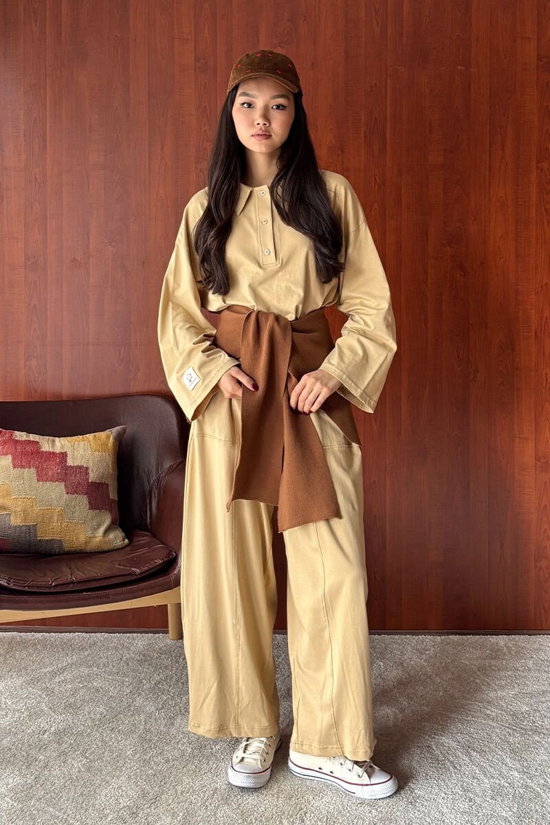 Polo yaka şalvar pantolon takım, rahatlığı ve şıklığı bir arada sunuyor.