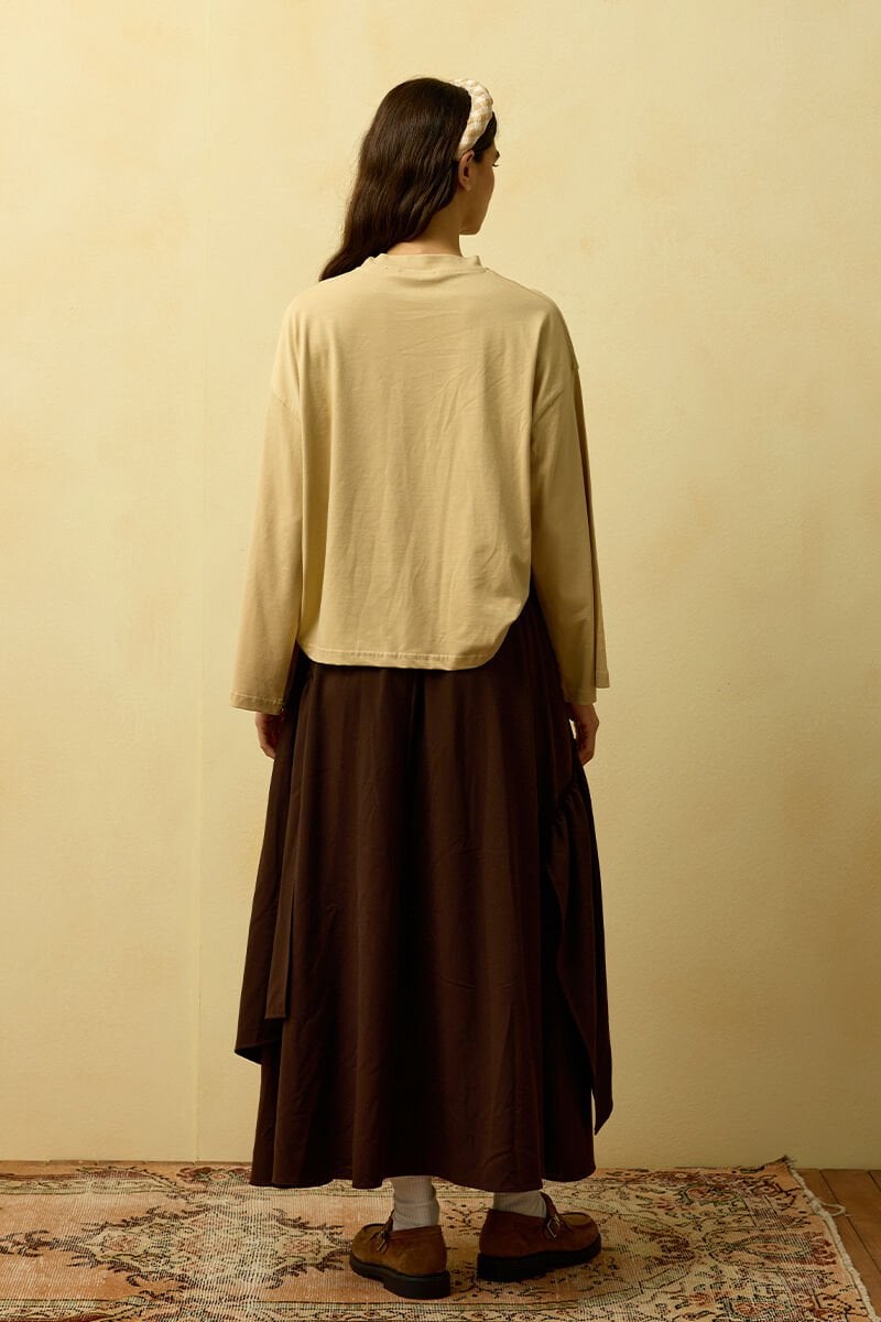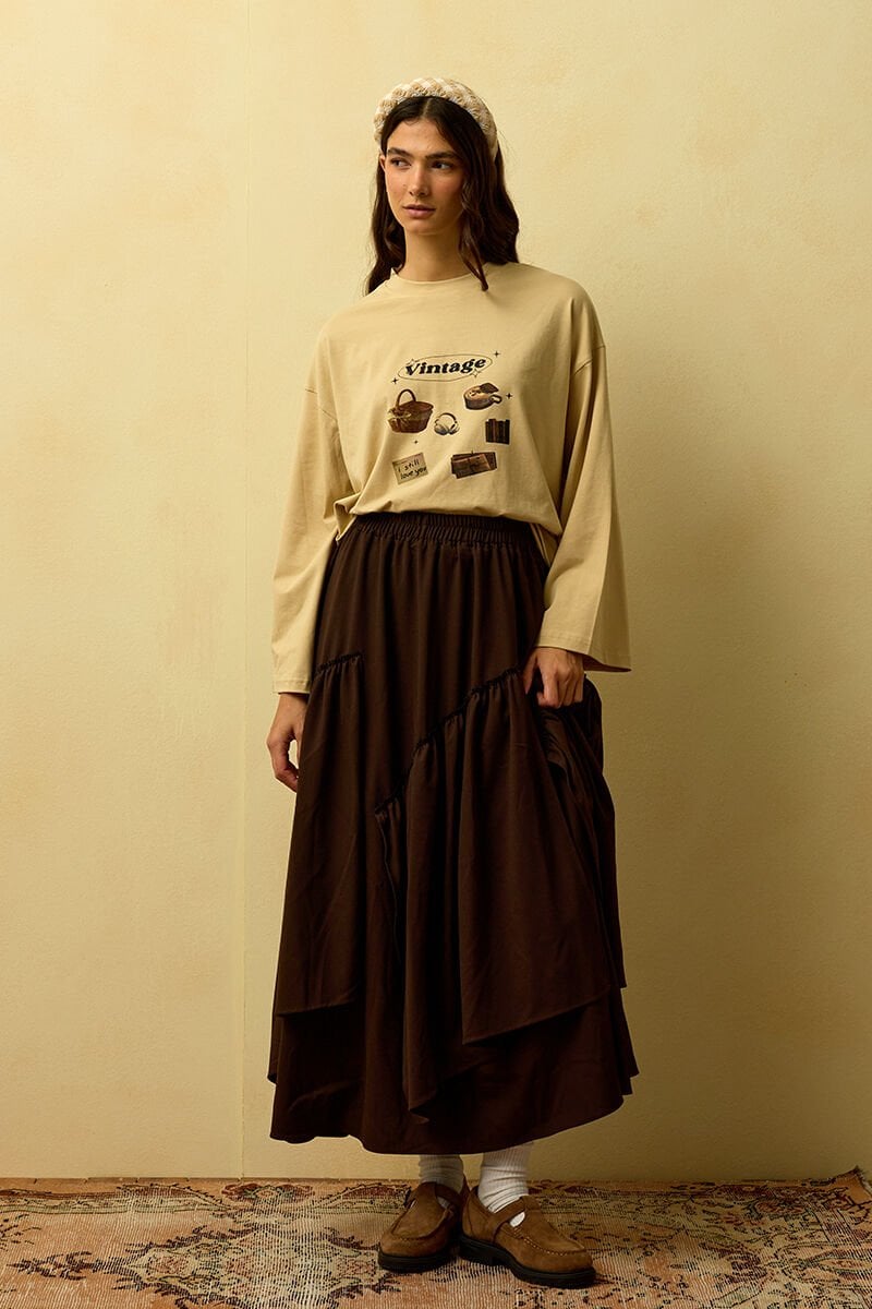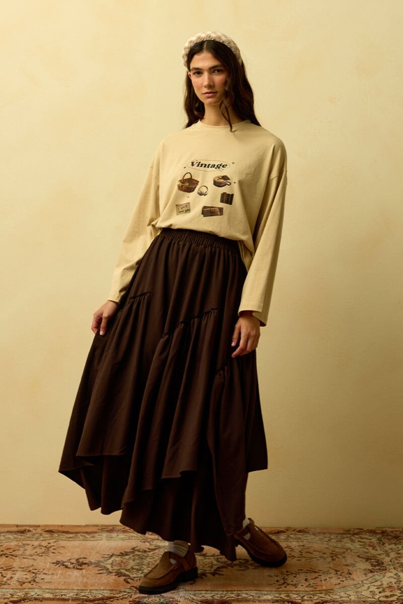 Bej Vintage Baskılı Basic Body & Acı Kahve Poliviskon Bohem Kat Etek Takım