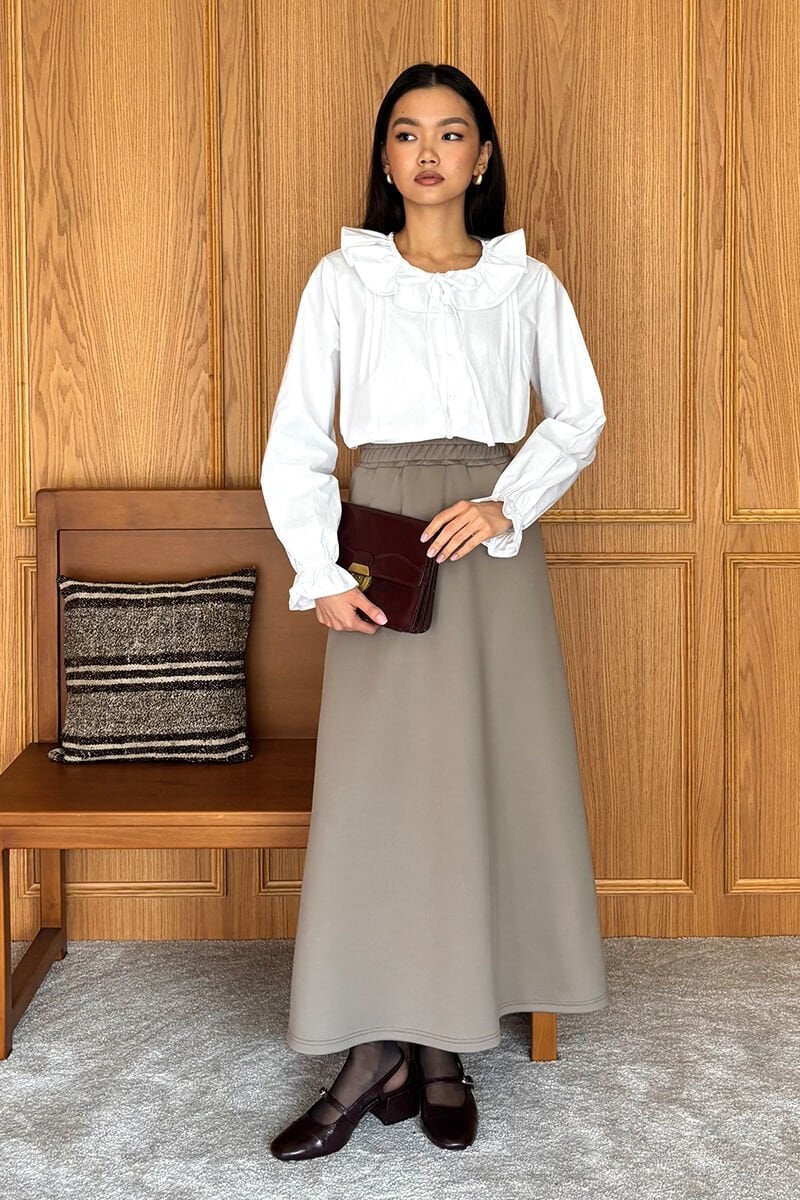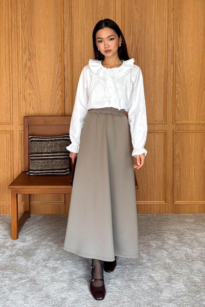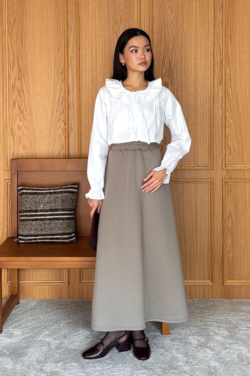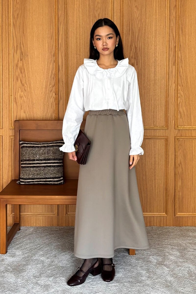 Beyaz Bebe Yaka Fiyonklu Gömlek & Vizon Scuba Etek Takım