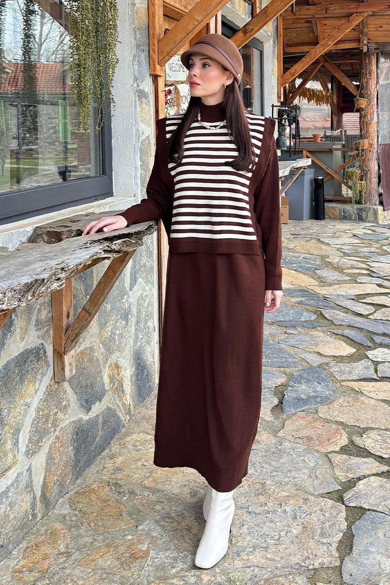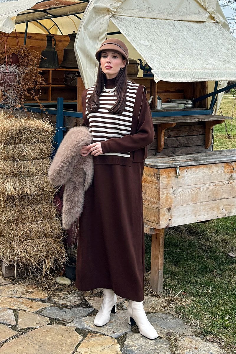 Beyaz Çizgili Acı Kahve Süveter Triko Elbise Takım