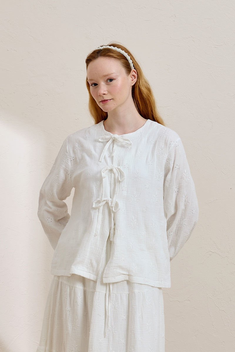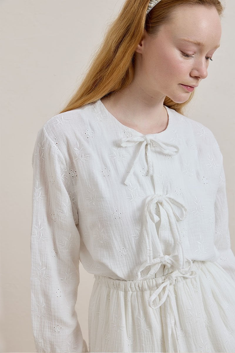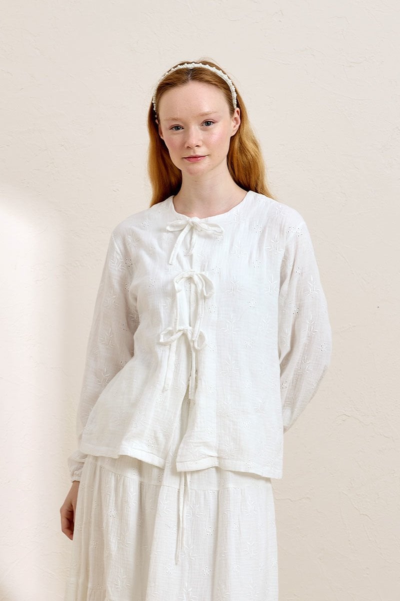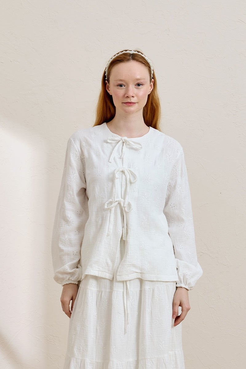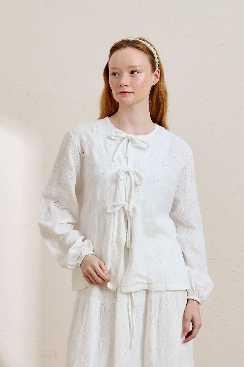 Beyaz Fistolu Müslin 3 Fiyonklu Bluz