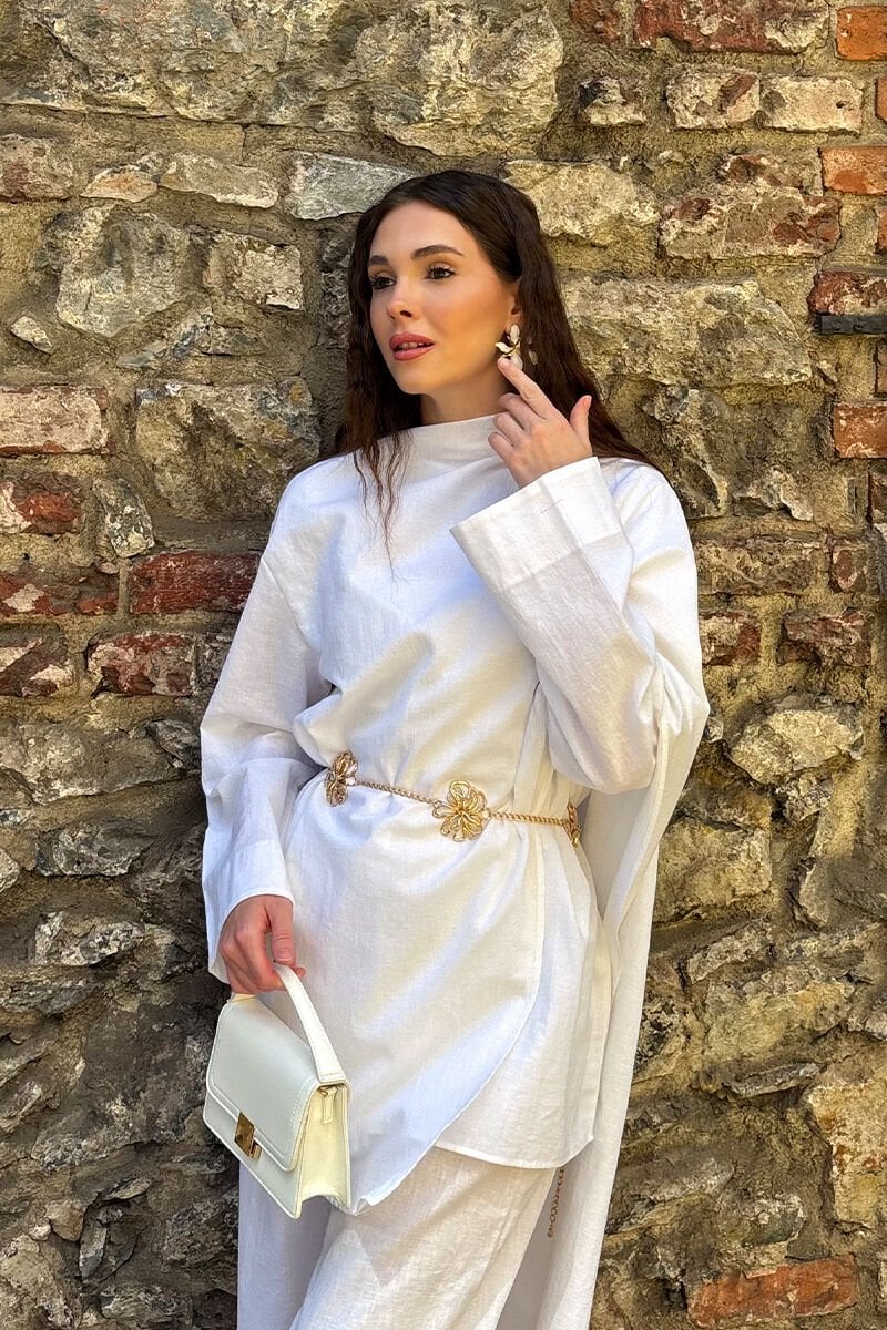 Beyaz Organik Keten Şal Detay Tunik & Double Paça Pantolon Takım