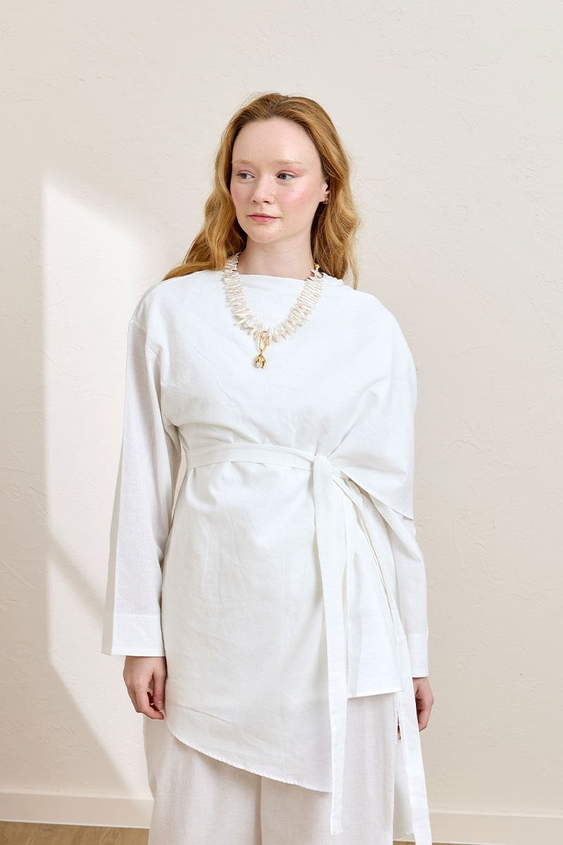 Beyaz Organik Keten Şal Detay Tunik & Double Paça Pantolon Takım
