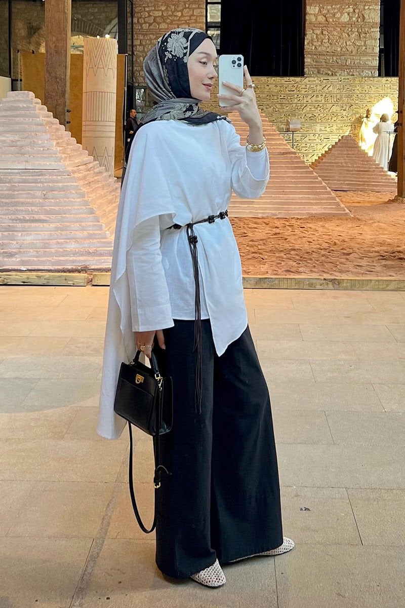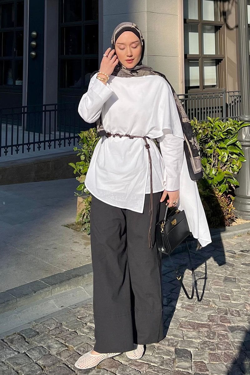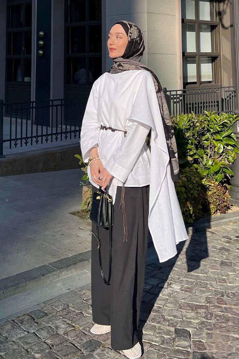 Beyaz Organik Keten Şal Detay Tunik & Siyah Double Paça Pantolon Takım
