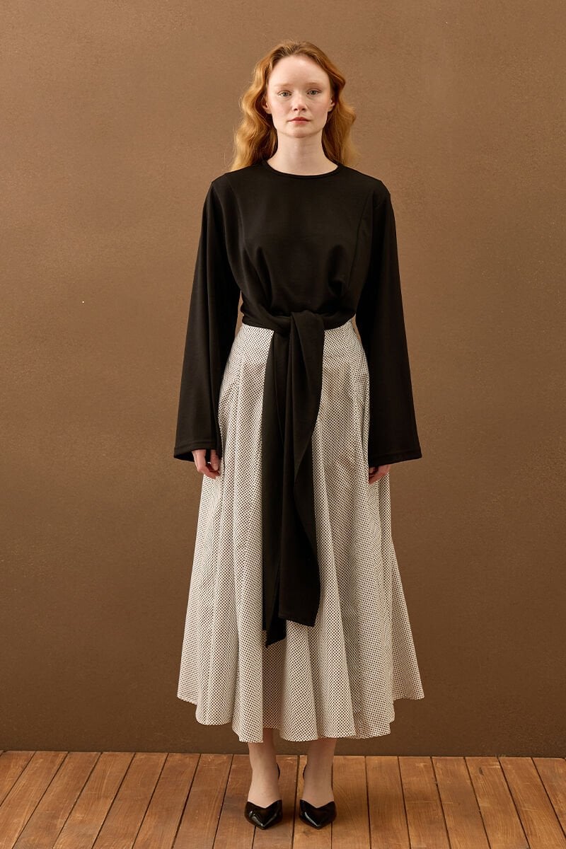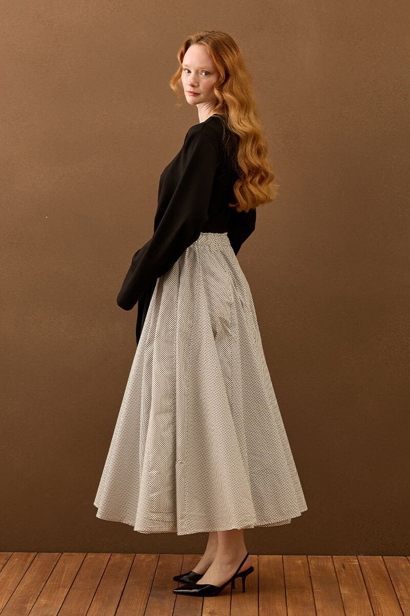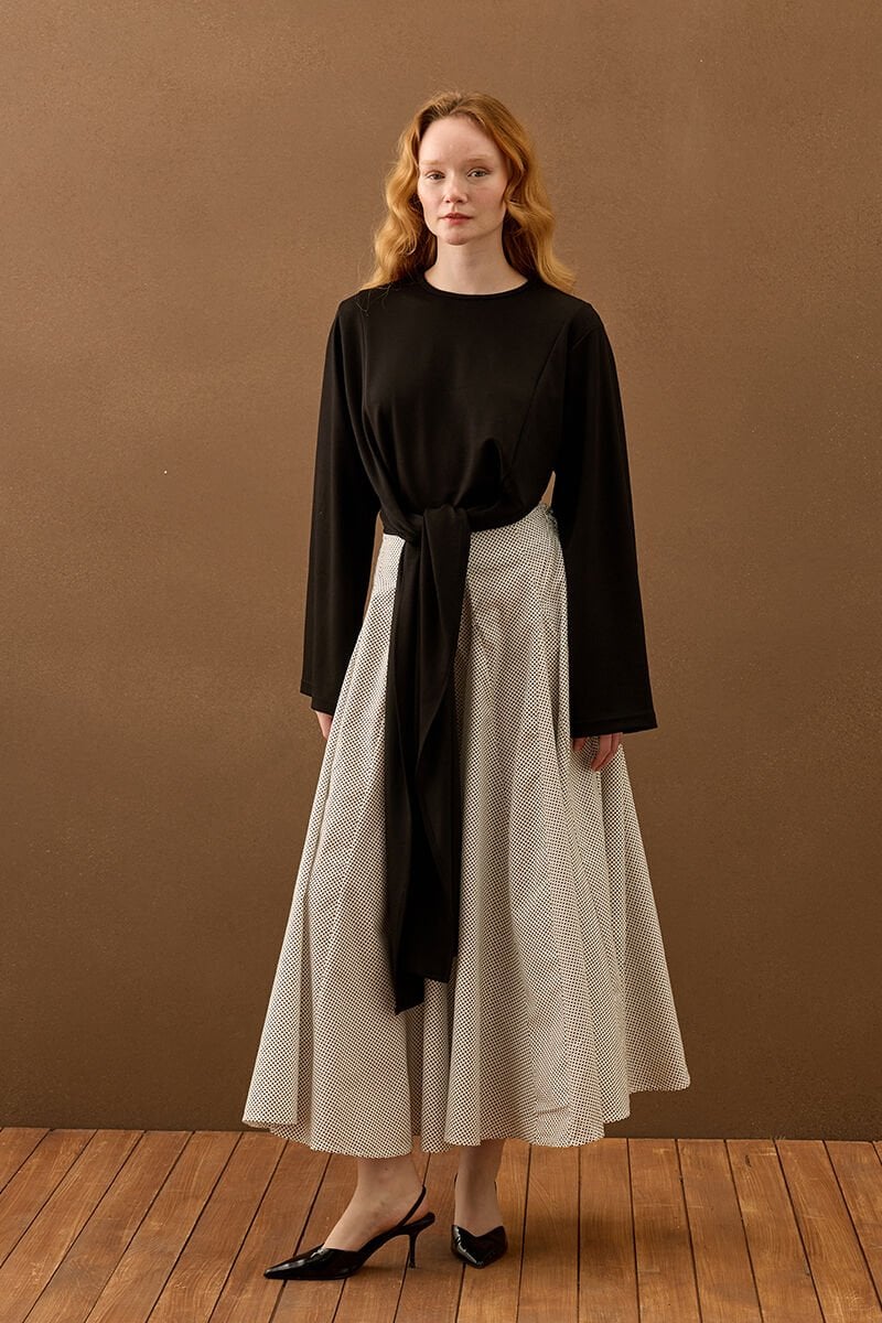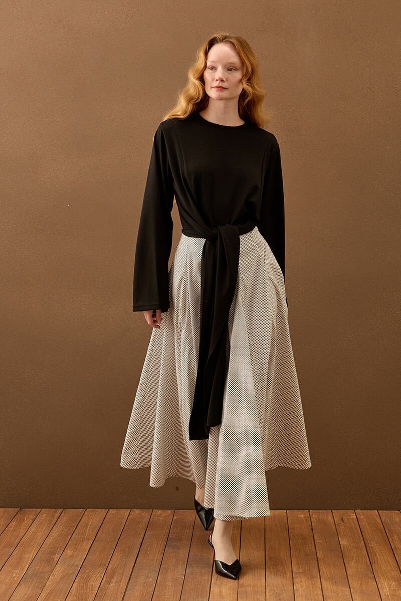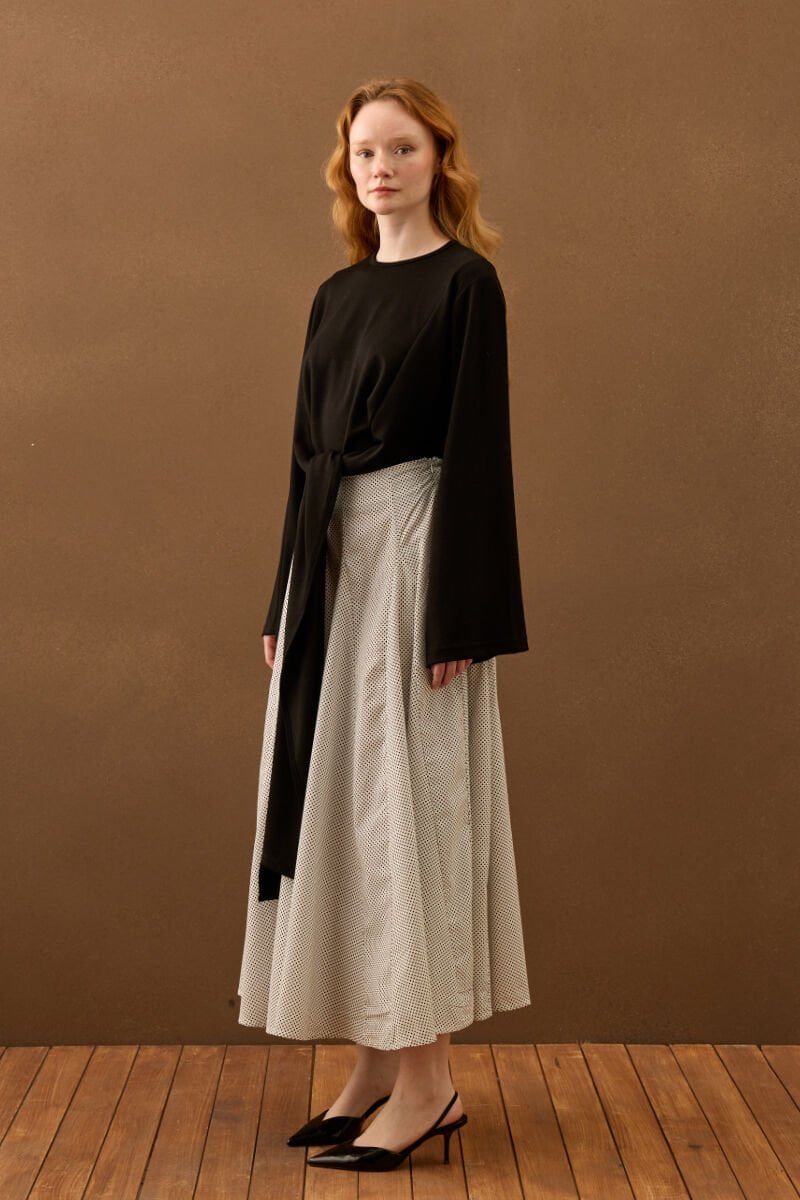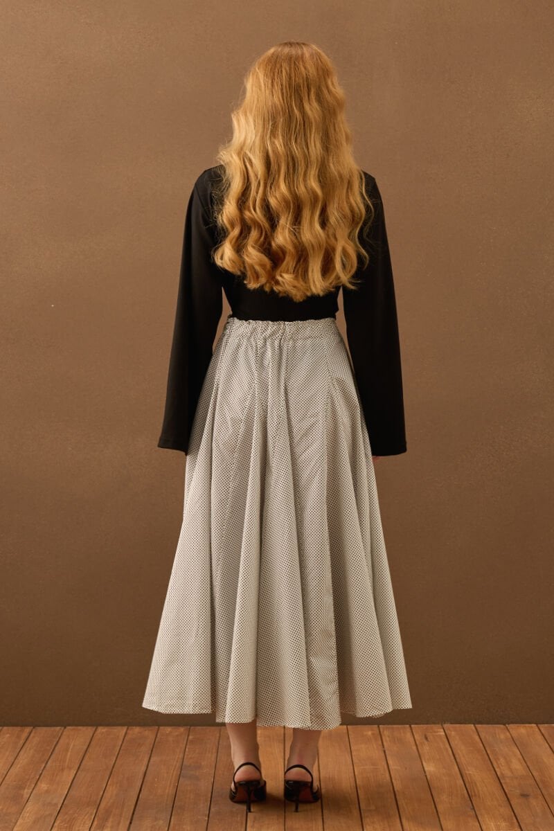 Beyaz Siyah Puantiyeli Parçalı Etek