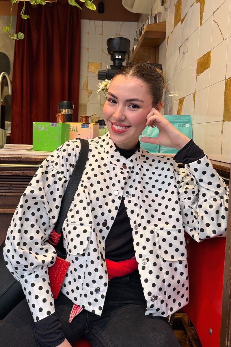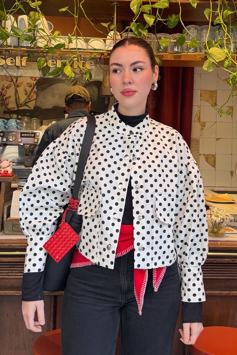 Şıklığı ve zarafeti bir arada sunan beyaz siyah puantiyeli ceket, gardırobunuzun vazgeçilmezi olacak.